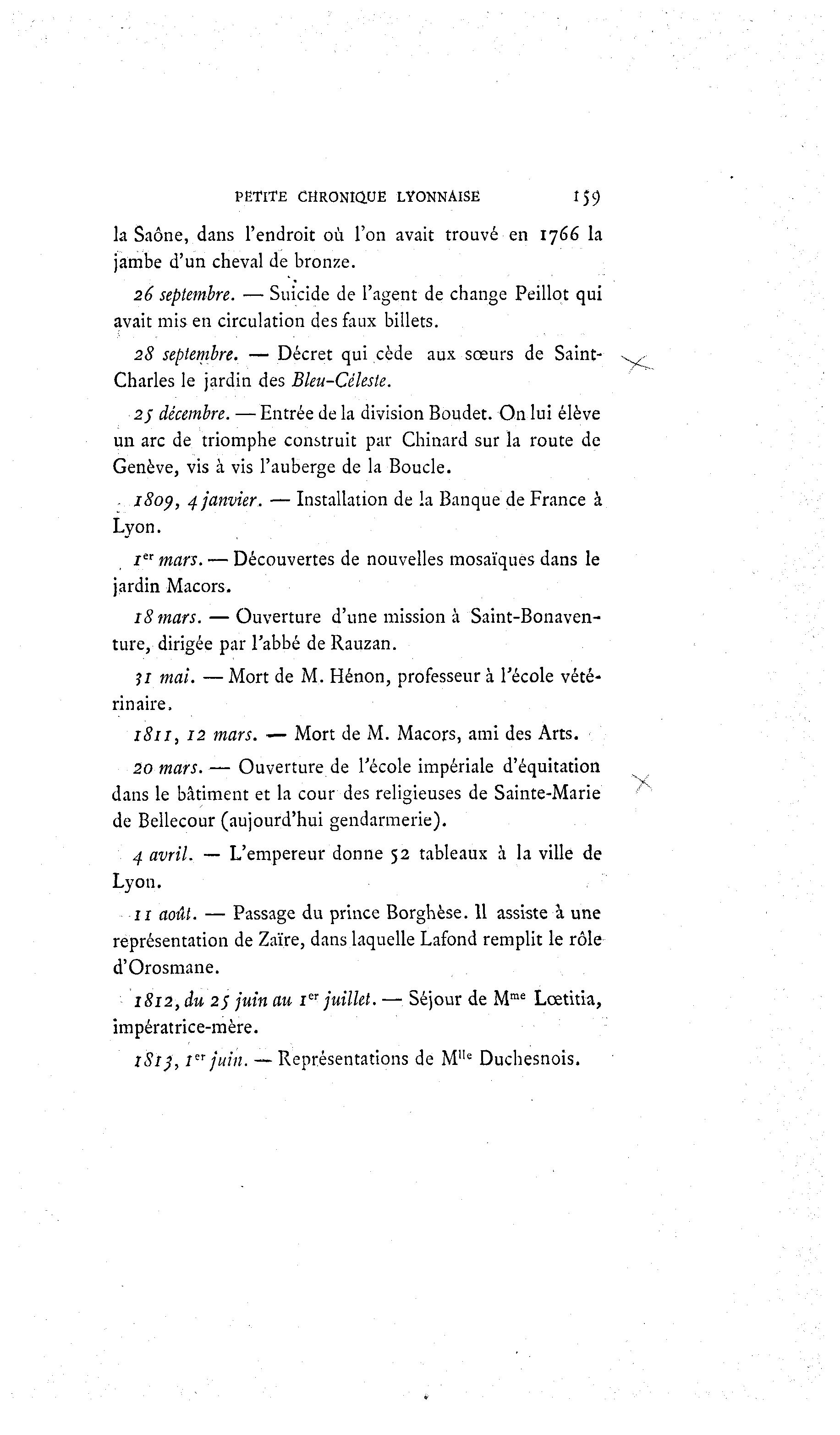 PETITE CHRONIQUE LYONNAISE 159 la Saône, dans l'endroit où l'on avait trouvé en 1766 la jambe d'un cheval de bronze. 26 septembre. — Suicide de l'agent de change Peillot qui avait mis en circulation des faux billets. 28 septembre. — Décret qui cède aux sœurs de Saint- Charles le jardin des Bleu-Céleste. 2j décembre. — Entrée de la division Boudet. On lui élève un arc de triomphe construit par Chinard sur la route de Genève, vis à vis l'auberge de la Boucle. . 1809, 4 janvier. — Installation de la Banque de France à Lyon. / " mars. — Découvertes de nouvelles mosaïques dans le jardin Macors. 18 mars. — Ouverture d'une mission à Saint-Bonaven- ture, dirigée par l'abbé de Rauzan. ?i mai. — Mort de M. Hénon, professeur à l'école vété- rinaire, 1811, 12 mars. — Mort de M. Macors, ami des Arts. 20 mars. — Ouverture de l'école impériale d'équitation dans le bâtiment et la cour des religieuses de Sainte-Marie de Bellecour (aujourd'hui gendarmerie). 4 avril. — L'empereur donne 52 tableaux à la ville de Lyon. 11 août. — Passage du prince Borghèse. 11 assiste à une représentation de Zaïre, dans laquelle Lafond remplit le rôle d'Orosmane. 1812, du 25 juin au Ier juillet. — Séjour de Mme Lœtitia, impératrice-mère. 1S13, i" juin. — Représentations de M"e Duchesnois.