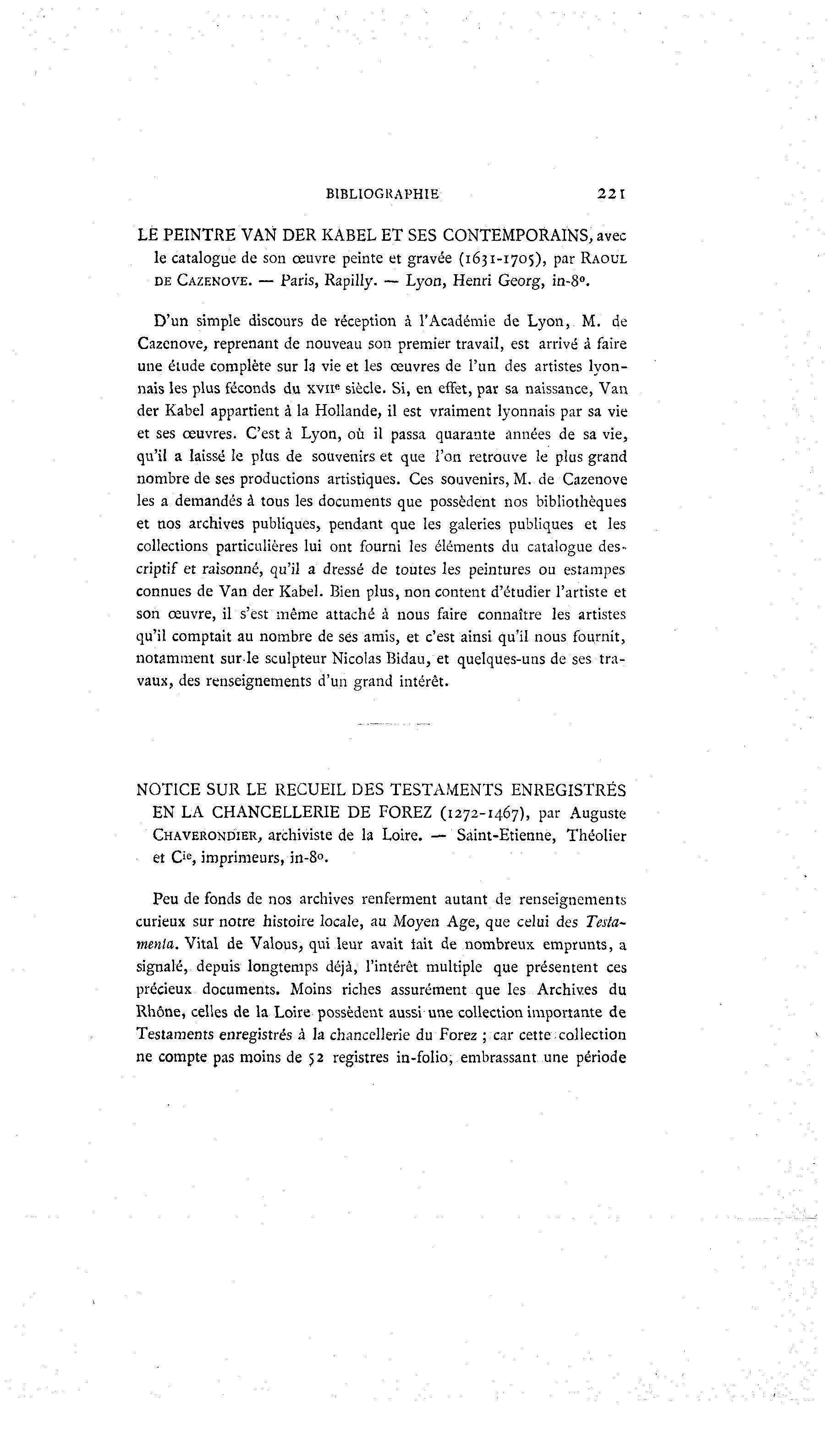 BIBLIOGRAPHIE 221 LÉ PEINTRE VAN DER KABEL ET SES CONTEMPORAINS, avec le catalogue de son œuvre peinte et gravée (1631-1705), par RAOUL DE CAZENOVE. — Paris, Rapilly. — Lyon, Henri Georg, in-8°. D'un simple discours de réception à l'Académie de Lyon, M. de Cazenove, reprenant de nouveau son premier travail, est arrivé à faire une élude complète sur la vie et les œuvres de l'un des artistes lyon- nais les plus féconds du XVIIe siècle. Si, en effet, par sa naissance, Van der Kabel appartient à la Hollande, il est vraiment lyonnais par sa vie et ses œuvres. C'est à Lyon, où il passa quarante années de sa vie, qu'il a laissé le plus de souvenirs et que l'on retrouve le plus grand nombre de ses productions artistiques. Ces souvenirs, M. de Cazenove les a demandés à tous les documents que possèdent nos bibliothèques et nos archives publiques, pendant que les galeries publiques et les collections particulières lui ont fourni les éléments du catalogue des- criptif et raisonné, qu'il a dressé de toutes les peintures ou estampes connues de Van der Kabel. Bien plus, non content d'étudier l'artiste et son œuvre, il s'est même attaché à nous faire connaître les artistes qu'il comptait au nombre de ses amis, et c'est ainsi qu'il nous fournit, notamment surle sculpteur Nicolas Bidau, et quelques-uns de ses tra- vaux, des renseignements d'un grand intérêt. NOTICE SUR LE RECUEIL DES TESTAMENTS ENREGISTRÉS EN LA CHANCELLERIE DE FOREZ (1272-1467), par Auguste CHAVERONDIER, archiviste de la Loire. — Saint-Etienne, Théolier et Cie, imprimeurs, in-8°. Peu de fonds de nos archives renferment autant de renseignements curieux sur notre histoire locale, au Moyen Age, que celui des Testa- menla. Vital de Valous, qui leur avait iait de nombreux emprunts, a signalé, depuis longtemps déjà , l'intérêt multiple que présentent ces précieux documents. Moins riches assurément que les Archives du Rhône, celles de la Loire possèdent aussi une collection importante de Testaments enregistrés à la chancellerie du Forez ; car cette collection ne compte pas moins de 52 registres in-folio, embrassant une période