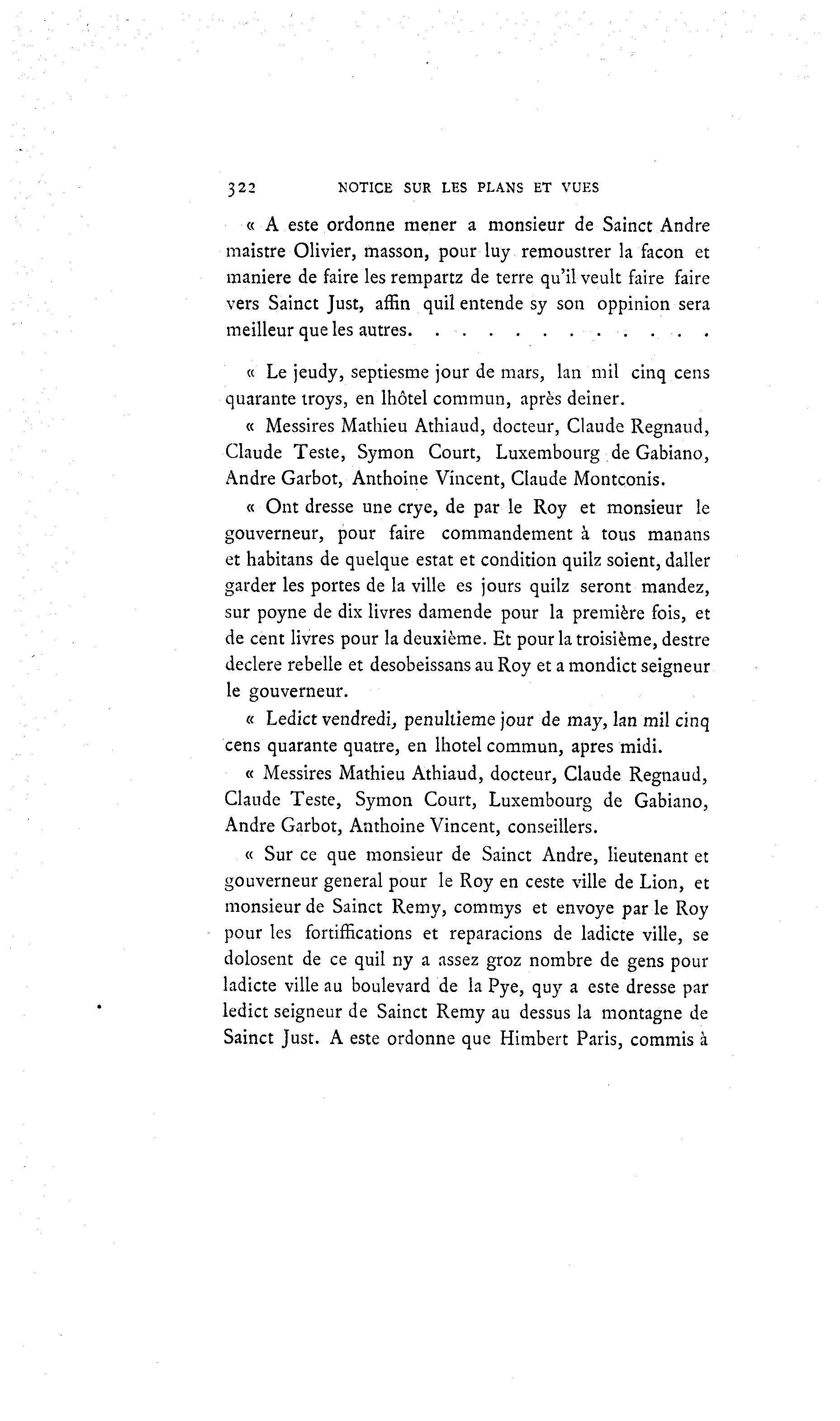 322 NOTICE SUR LES PLANS ET VUES « A este ordonne mener a monsieur de Sainct André maistre Olivier, masson, pour luy remoustrer la façon et manière de faire les rempartz de terre qu'il veult faire faire vers Sainct Just, affin qui! entende sy son oppinion sera meilleur que les autres . « Le jeudy, septiesme jour de mars, lan mil cinq cens quarante troys, en lhôtel commun, après deiner. « Messires Mathieu Athiaud, docteur, Claude Regnaud, Claude Teste, Symon Court, Luxembourg de Gabiano, André Garbot, Anthoine Vincent, Claude Montconis. « Ont dresse une crye, de par le Roy et monsieur le gouverneur, pour faire commandement à tous manans et habitans de quelque estât et condition quilz soient, daller garder les portes de la ville es jours quilz seront mandez, sur poyne de dix livres damende pour la première fois, et de cent livres pour la deuxième. Et pour la troisième, destre declere rebelle et desobeissans au Roy et a mondict seigneur le gouverneur. « Ledict vendredi, pénultième jour de may, lan mil cinq cens quarante quatre, en lhotel commun, après midi. « Messires Mathieu Athiaud, docteur, Claude Regnaud, Claude Teste, Symon Court, Luxembourg de Gabiano, André Garbot, Anthoine Vincent, conseillers. « Sur ce que monsieur de Sainct André, lieutenant et gouverneur gênerai pour le Roy en ceste ville de Lion, et monsieur de Sainct Remy, commys et envoyé par le Roy pour les fortiffications et reparacions de ladicte ville, se dolosent de ce quil ny a assez groz nombre de gens pour ladicte ville au boulevard de la Pye, quy a este dresse par ledict seigneur de Sainct Remy au dessus la montagne de Sainct Just. A este ordonne que Himbert Paris, commis Ã