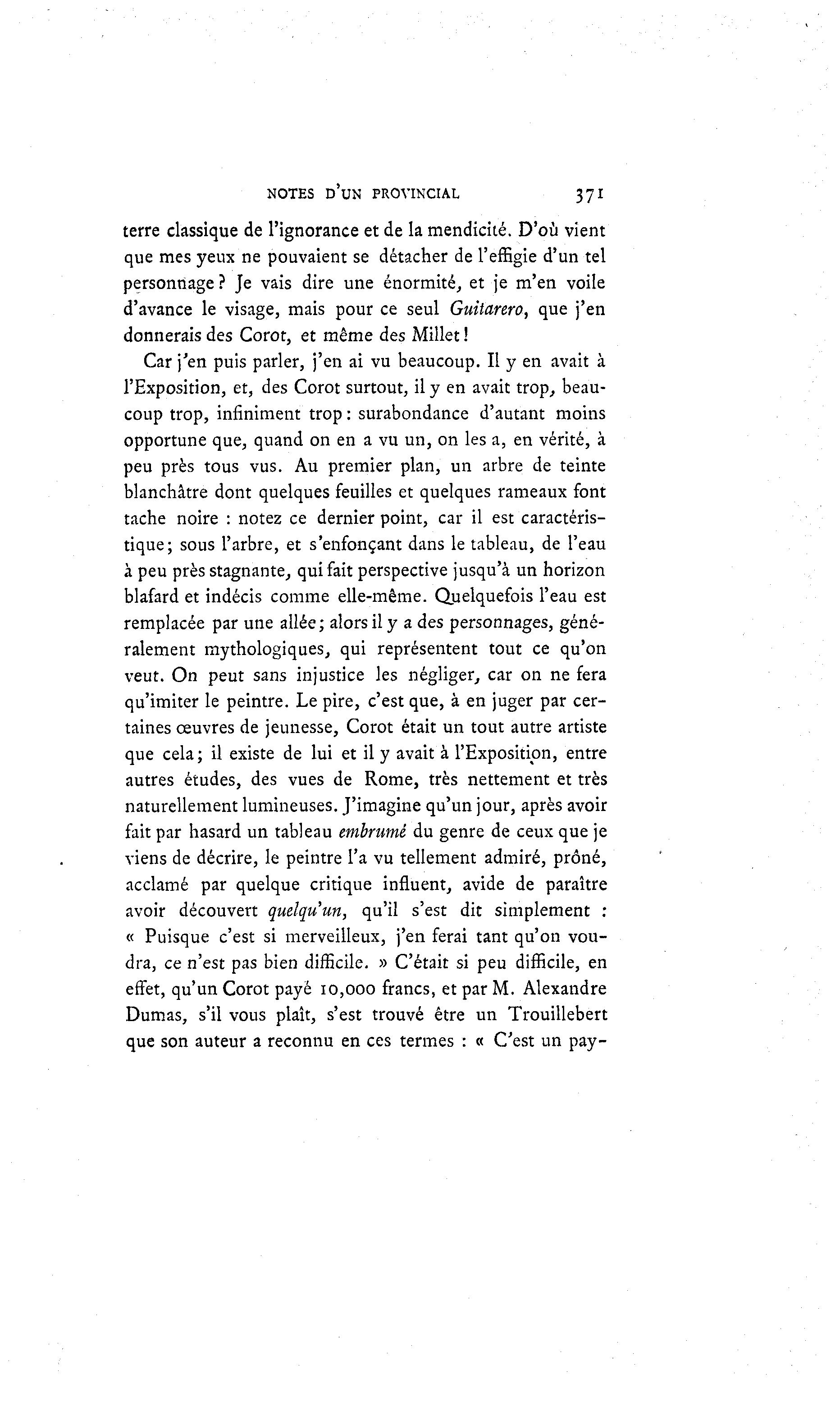 NOTES D'UN PROVINCIAL 371 terre classique de l'ignorance et de la mendicité. D'où vient que mes yeux ne pouvaient se détacher de l'effigie d'un tel personnage ? Je vais dire une énormité, et je m'en voile d'avance le visage, mais pour ce seul Guitarero, que j'en donnerais des Corot, et même des Millet ! Car j'en puis parler, j'en ai vu beaucoup. Il y en avait à l'Exposition, et, des Corot surtout, il y en avait trop, beau- coup trop, infiniment trop : surabondance d'autant moins opportune que, quand on en a vu un, on les a, en vérité, à peu près tous vus. Au premier plan, un arbre de teinte blanchâtre dont quelques feuilles et quelques rameaux font tache noire : notez ce dernier point, car il est caractéris- tique; sous l'arbre, et s'enfonçant dans le tableau, de l'eau à peu près stagnante, qui fait perspective jusqu'à un horizon blafard et indécis comme elle-même. Quelquefois l'eau est remplacée par une allée; alors il y a des personnages, géné- ralement mythologiques, qui représentent tout ce qu'on veut. On peut sans injustice les négliger, car on ne fera qu'imiter le peintre. Le pire, c'est que, à en juger par cer- taines œuvres de jeunesse, Corot était un tout autre artiste que cela; il existe de lui et il y avait à l'Exposition, entre autres études, des vues de Rome, très nettement et très naturellement lumineuses. J'imagine qu'un jour, après avoir fait par hasard un tableau embrumé du genre de ceux que je viens de décrire, le peintre l'a vu tellement admiré, prôné, acclamé par quelque critique influent, avide de paraître avoir découvert quelqu'un, qu'il s'est dit simplement : « Puisque c'est si merveilleux, j'en ferai tant qu'on vou- dra, ce n'est pas bien difficile. » C'était si peu difficile, en effet, qu'un Corot payé 10,000 francs, et par M. Alexandre Dumas, s'il vous plaît, s'est trouvé être un Trouillebert que son auteur a reconnu en ces termes : « C'est un pay-