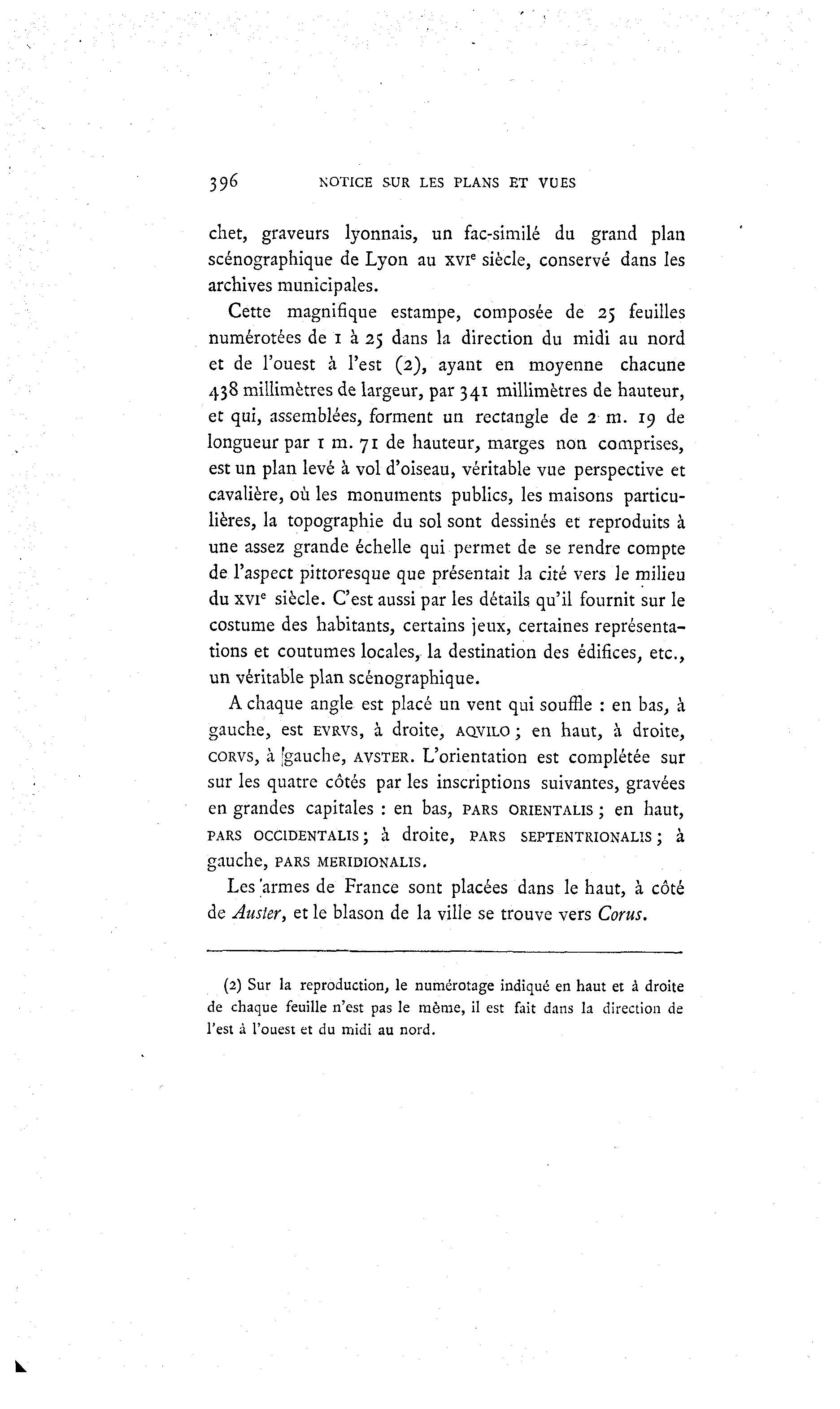 396 NOTICE SUR LES PLANS ET VUES chet, graveurs lyonnais, un fac-similé du grand plan scénographique de Lyon au xvie siècle, conservé dans les archives municipales. Cette magnifique estampe, composée de 25 feuilles numérotées de 1 à 25 dans la direction du midi au nord et de l'ouest à l'est (2), ayant en moyenne chacune 438 millimètres de largeur, par 341 millimètres de hauteur, et qui, assemblées, forment un rectangle de 2 m. 19 de longueur par 1 m. 71 de hauteur, marges non comprises, est un plan levé à vol d'oiseau, véritable vue perspective et cavalière, où les monuments publics, les maisons particu- lières, la topographie du sol sont dessinés et reproduits à une assez grande échelle qui permet de se rendre compte de l'aspect pittoresque que présentait la cité vers le milieu du xvi e siècle. C'est aussi par les détails qu'il fournit sur le costume des habitants, certains jeux, certaines représenta- tions et coutumes locales, la destination des édifices, etc., un véritable plan scénographique. A chaque angle est placé un vent qui souffle : en bas, à gauche, est EVRVS, à droite, AQVILO ; en haut, à droite, CORVS, à [gauche, AVSTER. L'orientation est complétée sur sur les quatre côtés par les inscriptions suivantes, gravées en grandes capitales : en bas, PARS ORIENTALIS ; en haut, PARS OCCIDENTALIS ; à droite, PARS SEPTENTRIONALÎS ; à gauche, PARS MERIDIONALIS. Les [armes de France sont placées dans le haut, à côté de Ausier, et le blason de la ville se trouve vers Corus. (2) Sur la reproduction, le numérotage indiqué en haut et à droite de chaque feuille n'est pas le même, il est fait dans la direction de l'est à l'ouest et du midi au nord.