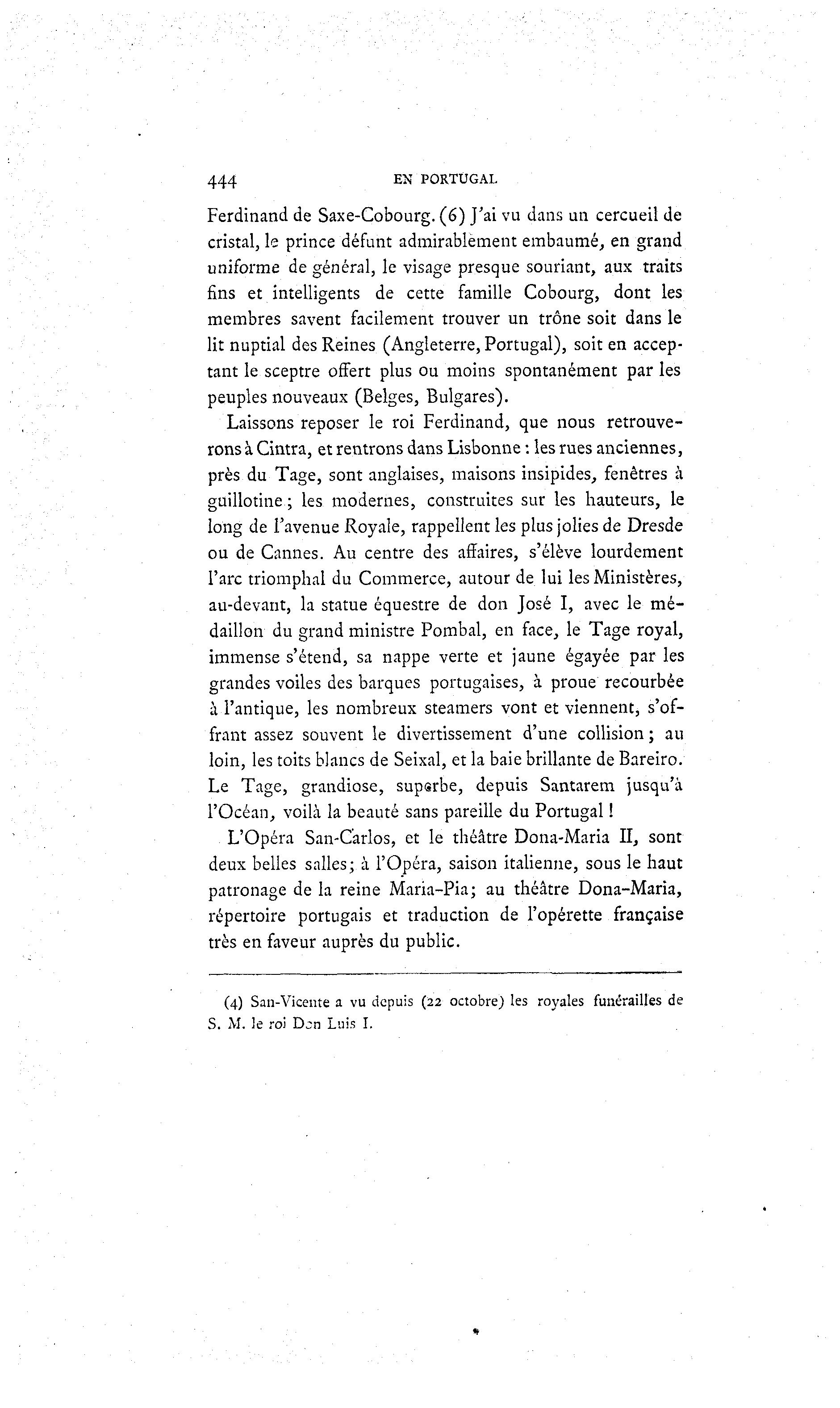 E 444 N PORTUGAL Ferdinand de Saxe-Cobourg. (6) J'ai vu dans un cercueil de cristal, le prince défunt admirablement embaumé, en grand uniforme de général, le visage presque souriant, aux traits fins et intelligents de cette famille Cobourg, dont les membres savent facilement trouver un trône soit dans le lit nuptial des Reines (Angleterre, Portugal), soit en accep- tant le sceptre offert plus ou moins spontanément par les peuples nouveaux (Belges, Bulgares). Laissons reposer le roi Ferdinand, que nous retrouve- rons à Cintra, et rentrons dans Lisbonne : les rues anciennes, près du Tage, sont anglaises, maisons insipides, fenêtres à guillotine ; les modernes, construites sur les hauteurs, le long de l'avenue Royale, rappellent les plus jolies de Dresde ou de Cannes. Au centre des affaires, s'élève lourdement l'arc triomphal du Commerce, autour de lui les Ministères, au-devant, la statue équestre de don José I, avec le m é - daillon du grand ministre Pombal, en face, le Tage royal, immense s'étend, sa nappe verte et jaune égayée par les grandes voiles des barques portugaises, à proue recourbée à l'antique, les nombreux steamers vont et viennent, s'of- frant assez souvent le divertissement d'une collision ; au loin, les toits blancs de Seixal, et la baie brillante de Bareiro. Le Tage, grandiose, supsrbe, depuis Santarem jusqu'à l'Océan, voilà la beauté sans pareille du Portugal ! L'Opéra San-C'arlos, et le théâtre Dona-Maria II, sont deux belles salles; à l'Opéra, saison italienne, sous le haut patronage de la reine Maria-Pia; au théâtre Dona-Maria, répertoire portugais et traduction de l'opérette française très en faveur auprès du public. (4) San-Vicente a vu depuis (22 octobre) les royales funérailles de S. M. le roi D^n Luis I.