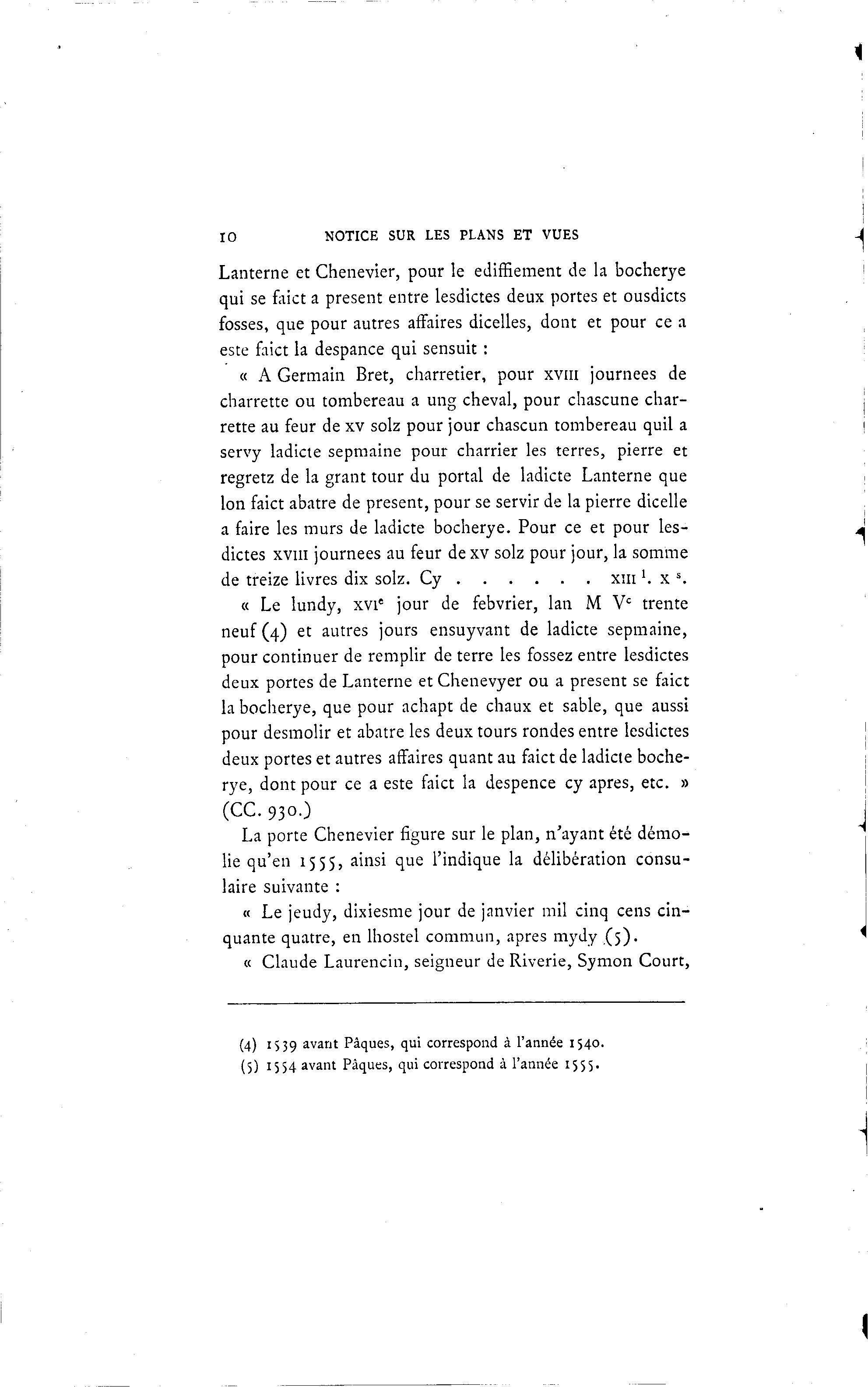 10 NOTICE SUR LES PLANS ET VUES Lanterne et Chenevier, pour le ediffiement de la bocherye qui se faict a présent entre lesdictes deux portes et ousdicts fosses, que pour autres affaires dicelles, dont et pour ce a este faict la despance qui sensuit : « A Germain Bret, charretier, pour xvm journées de charrette ou tombereau a ung cheval, pour chascune char- rette au feur de xv solz pour jour chascun tombereau quil a servy ladicie sepmaine pour charrier les terres, pierre et regretz de la grant tour du portai de ladicte Lanterne que Ion faict abatre de présent, pour se servir de la pierre dicelle a faire les murs de ladicte bocherye. Pour ce et pour les- dictes xvm journées au feur de xv solz pour jour, la somme de treize livres dix solz. Cy xm '. x s . « Le lundy, xvr jour de febvrier, lan M Ve trente 5 neuf (4) et autres jours ensuyvant de ladicte sepmaine, pour continuer de remplir de terre les fossez entre lesdictes deux portes de Lanterne et Chenevyer ou a présent se faict la bocherye, que pour achapt de chaux et sable, que aussi pour desmolir et abatre les deux tours rondes entre lesdictes deux portes et autres affaires quant au faict de ladicte boche- rye, dont pour ce a este faict la despence cy après, etc. » (CC. 930.) La porte Chenevier figure sur le plan, n'ayant été démo- lie qu'en 1555, ainsi que l'indique la délibération consu- laire suivante : « Le jeudy, dixiesme jour de janvier mil cinq cens cin- quante quatre, en lhostel commun, après mydy ( 5 ) . « Claude Laurencin, seigneur de Riverie, Symon Court, (4) 1539 a v a t j t Pâques, qui correspond à l'année 1540. (5) 1554 avant Pâques, qui correspond à l'année 1555.