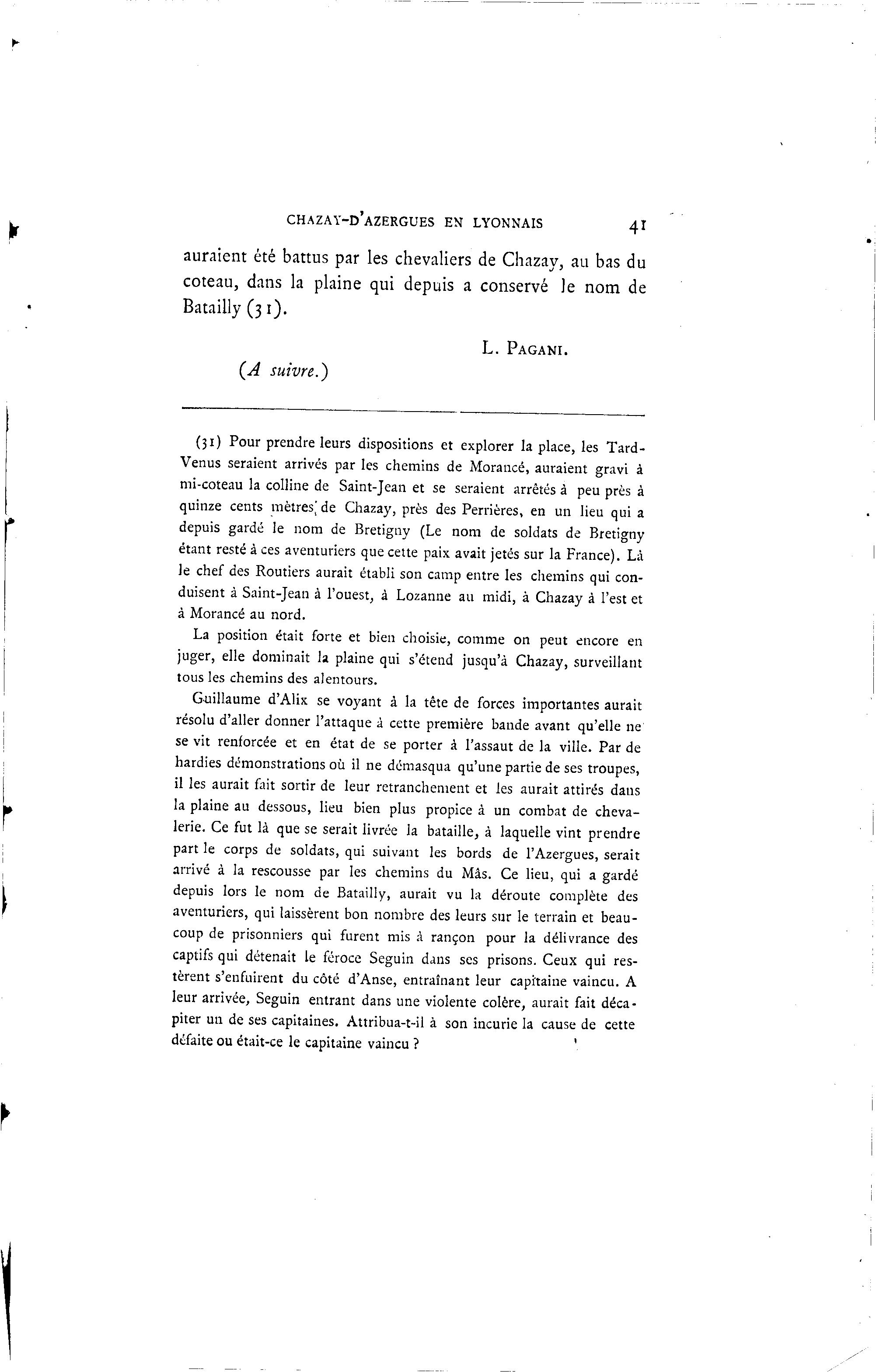 auraient été battus par les chevaliers de Chazay, au bas du