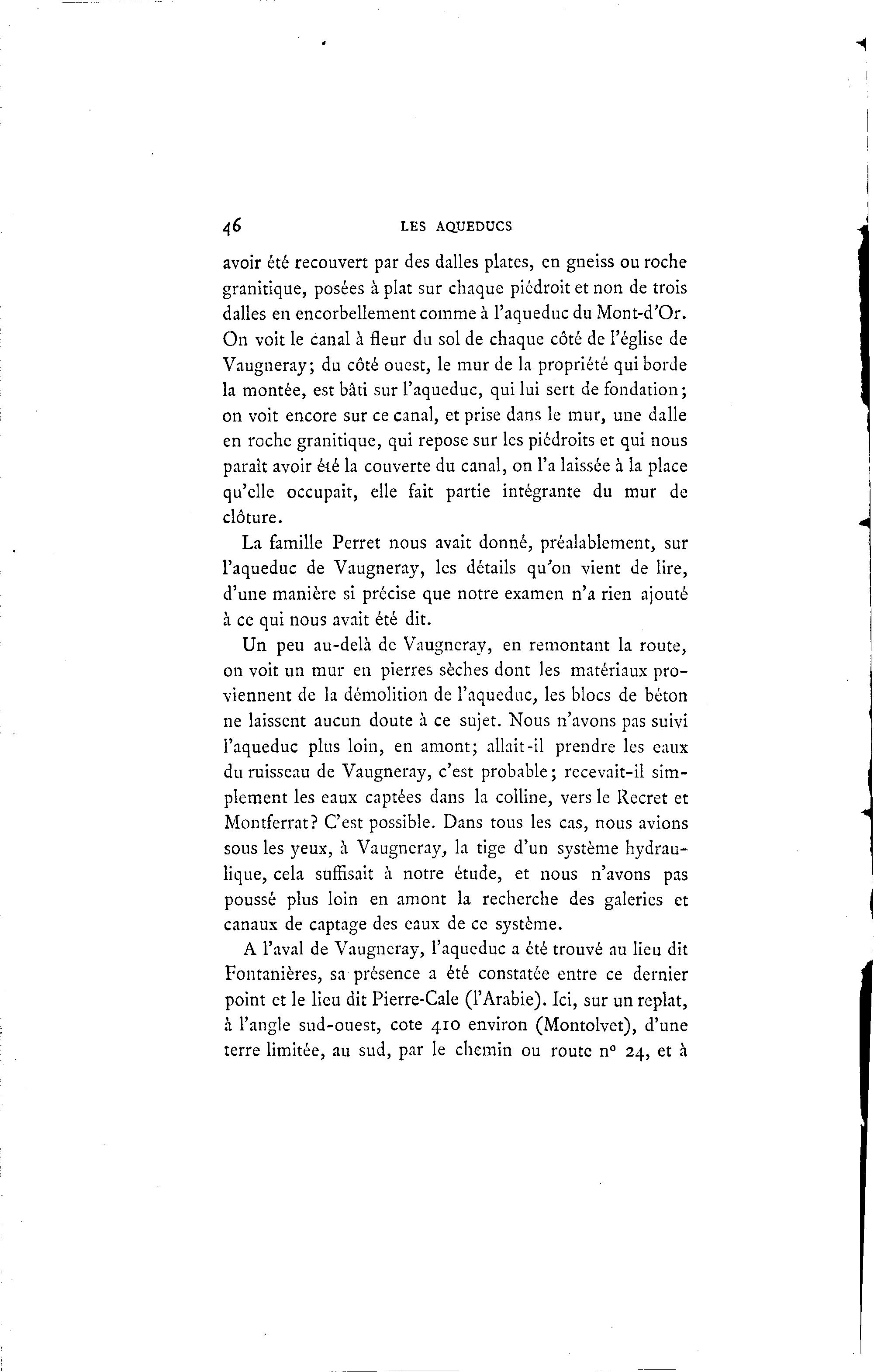 46 LES AQUEDUCS avoir été recouvert par des dalles plates, en gneiss ou roche granitique, posées à plat sur chaque piédroit et non de trois dalles en encorbellement comme à l'aqueduc du Mont-d'Or. On voit le canal à fleur du sol de chaque côté de l'église de Vaugneray; du côté ouest, le mur de la propriété qui borde la montée, est bâti sur l'aqueduc, qui lui sert de fondation; on voit encore sur ce canal, et prise dans le mur, une dalle en roche granitique, qui repose sur les piédroits et qui nous paraît avoir été la couverte du canal, on l'a laissée à la place qu'elle occupait, elle fait partie intégrante du mur de clôture. La famille Perret nous avait donné, préalablement, sur l'aqueduc de Vaugneray, les détails qu'on vient de lire, d'une manière si précise que notre examen n'a rien ajouté à ce qui nous avait été dit. Un peu au-delà de Vaugneray, en remontant la route, on voit un mur en pierres sèches dont les matériaux pro- viennent de la démolition de l'aqueduc, les blocs de béton ne laissent aucun doute à ce sujet. Nous n'avons pas suivi l'aqueduc plus loin, en amont; allait-il prendre les eaux du ruisseau de Vaugneray, c'est probable; recevait-il sim- plement les eaux captées dans la colline, vers le Recret et Montferrat? C'est possible. Dans tous les cas, nous avions sous les yeux, a Vaugneray, la tige d'un système hydrau- lique, cela suffisait à notre étude, et nous n'avons pas poussé plus loin en amont la recherche des galeries et canaux de captage des eaux de ce système. A l'aval de Vaugneray, l'aqueduc a été trouvé au lieu dit Fontanières, sa présence a été constatée entre ce dernier point et le lieu dit Pierre-Cale (l'Arabie). Ici, sur un replat, à l'angle sud-ouest, cote 410 environ (Montolvet), d'une terre limitée, au sud, par le chemin ou route n° 24, et Ã