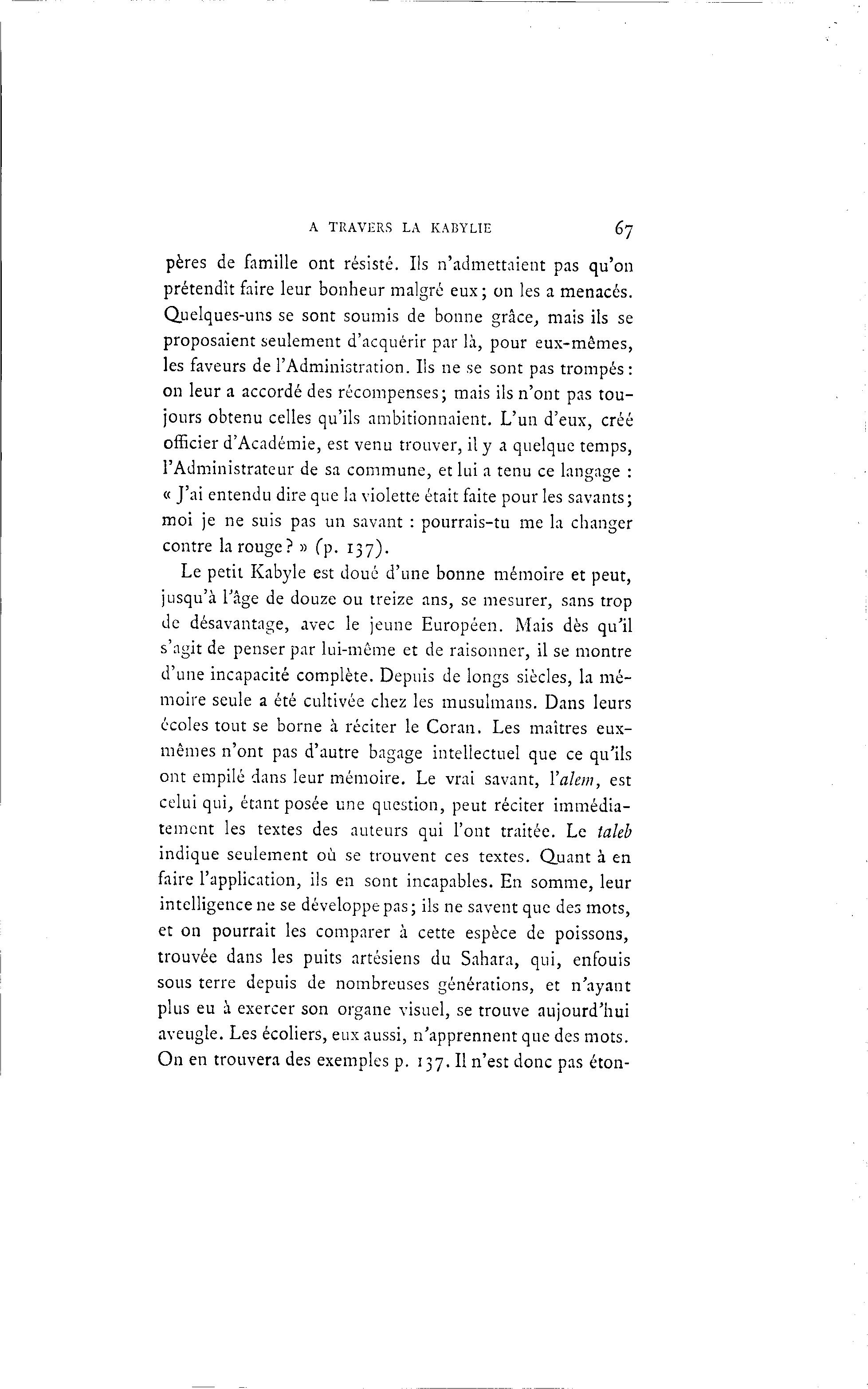 A TRAVERS LA KABYLIE 6j pères de famille ont résisté. Ils n'admettaient pas qu'on prétendît faire leur bonheur malgré eux; on les a menacés. Quelques-uns se sont soumis de bonne grâce, mais ils se proposaient seulement d'acquérir par là , pour eux-mêmes, les faveurs de l'Administration. Ils ne se sont pas trompés: on leur a accordé des récompenses; mais ils n'ont pas tou- jours obtenu celles qu'ils ambitionnaient. L'un d'eux, créé officier d'Académie, est venu trouver, il y a quelque temps, l'Administrateur de sa commune, et lui a tenu ce langage : « J'ai entendu dire que la violette était faite pour les savants; moi je ne suis pas un savant : pourrais-tu me la changer contre la rouge? » fp. 137). Le petit Kabyle est doué d'une bonne mémoire et peut, jusqu'à l'âge de douze ou treize ans, se mesurer, sans trop de désavantage, avec le jeune Européen. Mais dès qu'il s'agit de penser par lui-même et de raisonner, il se montre d'une incapacité complète. Depuis de longs siècles, la mé- moire seule a été cultivée chez les musulmans. Dans leurs écoles tout se borne à réciter le Coran, Les maîtres eux- mêmes n'ont pas d'autre bagage intellectuel que ce qu'ils ont empilé dans leur mémoire. Le vrai savant, l'alem, est celui qui, étant posée une question, peut réciter immédia- tement les textes des auteurs qui l'ont traitée. Le taleb indique seulement où se trouvent ces textes. Quant à en faire l'application, ils en sont incapables. En somme, leur intelligence ne se développe pas ; ils ne savent que des mots, et on pourrait les comparer à cette espèce de poissons, trouvée dans les puits artésiens du Sahara, qui, enfouis sous terre depuis de nombreuses générations, et n'ayant plus eu à exercer son organe visuel, se trouve aujourd'hui aveugle. Les écoliers, eux aussi, n'apprennent que des mots. On en trouvera des exemples p. 137. Il n'est donc pas éton-