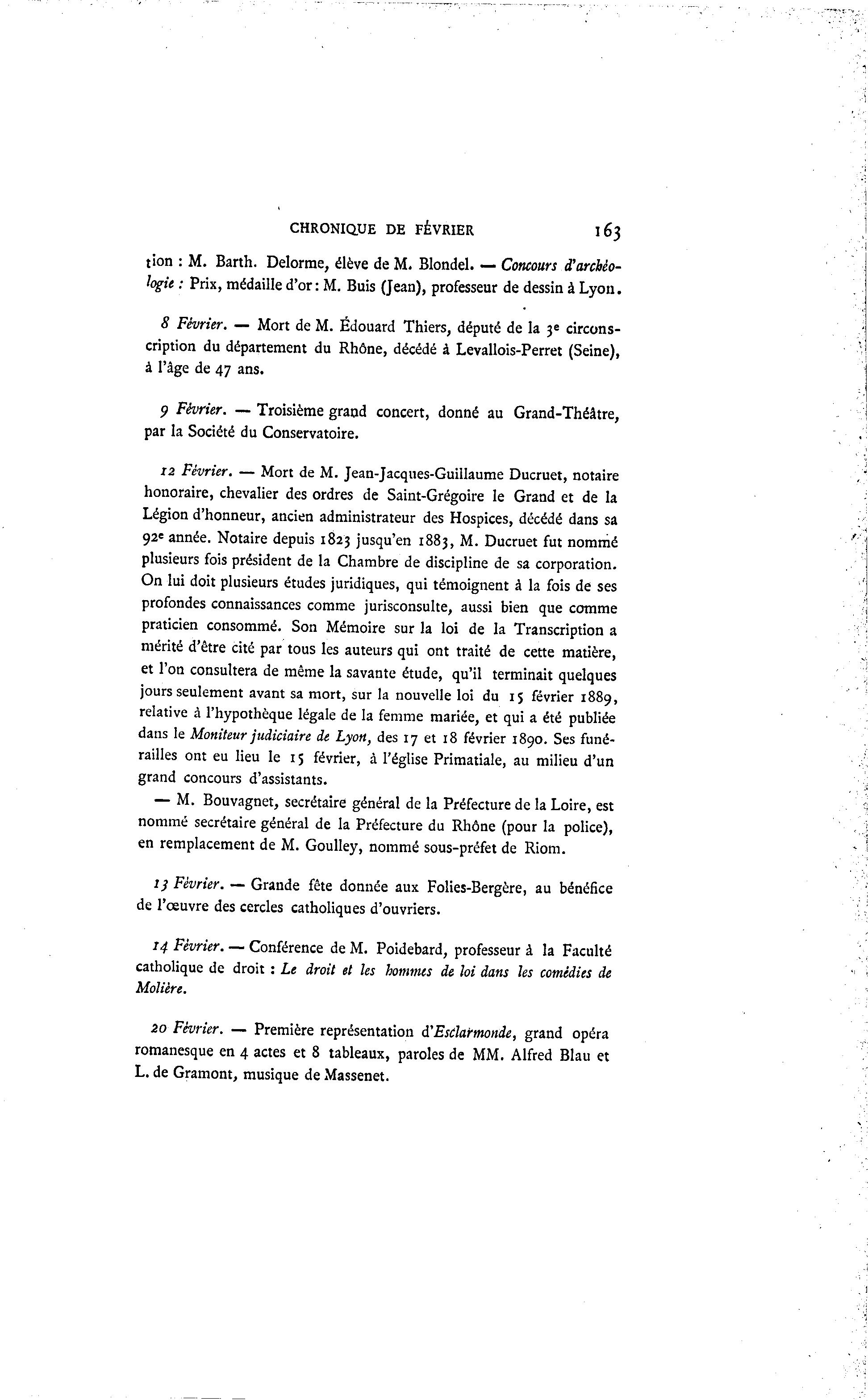 CHRONIQUE DE FÉVRIER l63 tion : M. Barth. Delorme, élève de M. Blondel. — Concours ^archéo- logie : Prix, médaille d'or: M. Buis (Jean), professeur de dessin à Lyon. 8 Février. — Mort de M. Edouard Thiers, député de la j« circons- cription du département du Rhône, décédé à Levallois-Perret (Seine), à l'âge de 47 ans. 9 Février. — Troisième grand concert, donné au Grand-Théâtre, par la Société du Conservatoire. 12 Février. — Mort de M. Jean-Jacques-Guillaume Ducruet, notaire honoraire, chevalier des ordres de Saint-Grégoire le Grand et de la Légion d'honneur, ancien administrateur des Hospices, décédé dans sa 92e année. Notaire depuis 1823 jusqu'en 1883, M. Ducruet fut nommé plusieurs fois président de la Chambre de discipline de sa corporation. On lui doit plusieurs études juridiques, qui témoignent à la fois de ses profondes connaissances comme jurisconsulte, aussi bien que comme praticien consommé. Son Mémoire sur la loi de la Transcription a mérité d'être cité par tous les auteurs qui ont traité de cette matière, et l'on consultera de même la savante étude, qu'il terminait quelques jours seulement avant sa mort, sur la nouvelle loi du 15 février 1889, relative à l'hypothèque légale de la femme mariée, et qui a été publiée dans le Moniteur judiciaire de Lyon, des 17 et 18 février 1890. Ses funé- railles ont eu lieu le 15 février, à l'église Primatiale, au milieu d'un grand concours d'assistants. — M. Bouvagnet, secrétaire général de la Préfecture de la Loire, est nommé secrétaire général de la Préfecture du Rhône (pour la police), en remplacement de M. Goulley, nommé sous-préfet de Riom. i) Février. — Grande fête donnée aux Folies-Bergère, au bénéfice de l'œuvre des cercles catholiques d'ouvriers. 14 Février. — Conférence de M. Poidebard, professeur à la Faculté catholique de droit : Le droit et les hommes de loi dans les comédies de Molière. 20 Février. — Première représentation à 'EsClarmonde, grand opéra romanesque en 4 actes et 8 tableaux, paroles de MM. Alfred Blau et L. de Gramont, musique de Massenet.