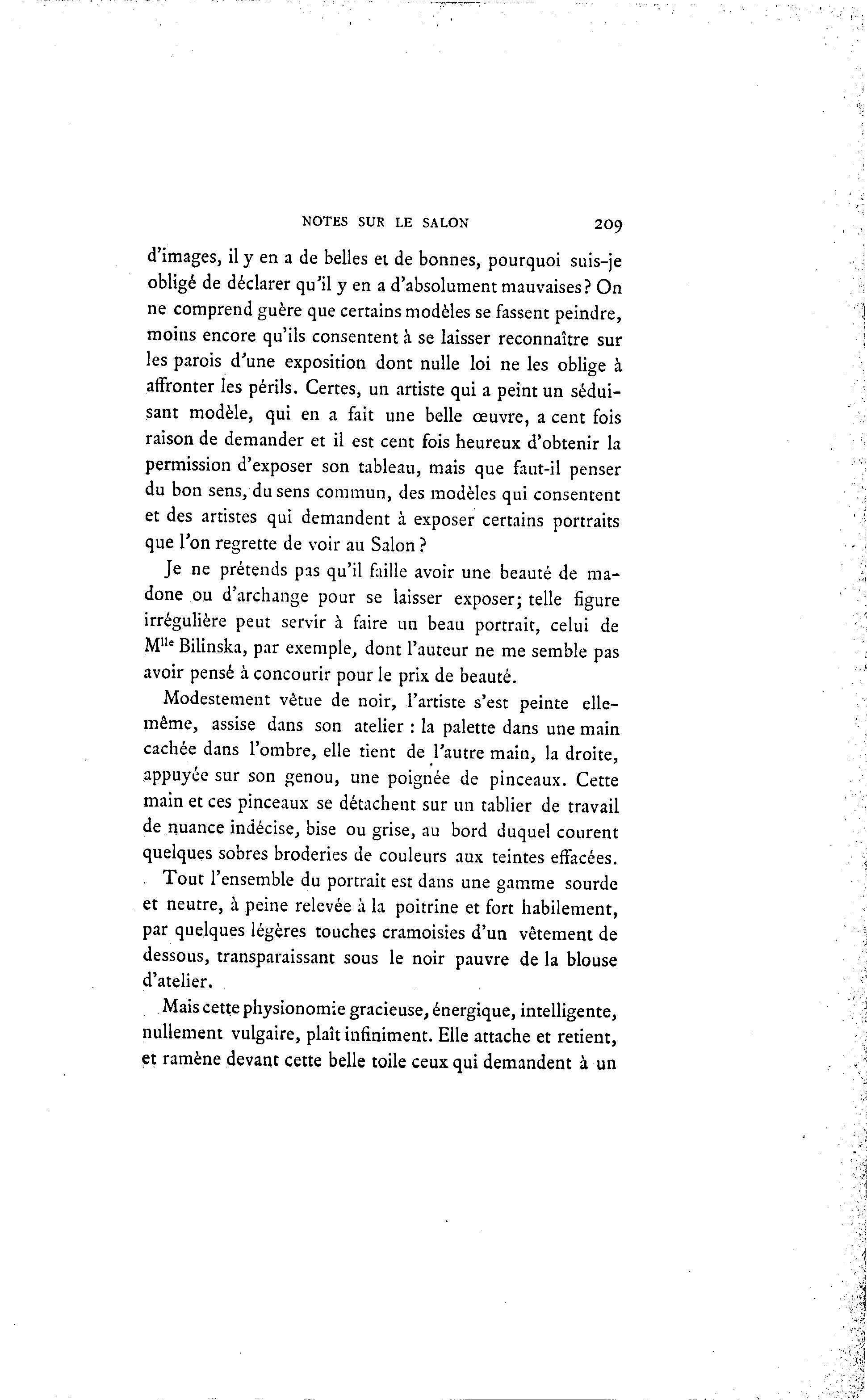NOTES SUR LE SALON 209 d'images, il y en a de belles et de bonnes, pourquoi suis-je obligé de déclarer qu'il y en a d'absolument mauvaises? On ne comprend guère que certains modèles se fassent peindre, moins encore qu'ils consentent à se laisser reconnaître sur les parois d'une exposition dont nulle loi ne les oblige à affronter les périls. Certes, un artiste qui a peint un sédui- sant modèle, qui en a fait une belle oeuvre, a cent fois raison de demander et il est cent fois heureux d'obtenir la permission d'exposer son tableau, mais que faut-il penser du bon sens, du sens commun, des modèles qui consentent et des artistes qui demandent à exposer certains portraits que l'on regrette de voir au Salon ? Je ne prétends pas qu'il faille avoir une beauté de ma- done ou d'archange pour se laisser exposer; telle figure irrégulière peut servir à faire un beau portrait, celui de Mlle Bilinska, par exemple, dont l'auteur ne me semble pas avoir pensé à concourir pour le prix de beauté. Modestement vêtue de noir, l'artiste s'est peinte elle- même, assise dans son atelier : la palette dans une main cachée dans l'ombre, elle tient de l'autre main, la droite, appuyée sur son genou, une poignée de pinceaux. Cette main et ces pinceaux se détachent sur un tablier de travail de nuance indécise, bise ou grise, au bord duquel courent quelques sobres broderies de couleurs aux teintes effacées. Tout l'ensemble du portrait est dans une gamme sourde et neutre, à peine relevée à la poitrine et fort habilement, par quelques légères touches cramoisies d'un vêtement de dessous, transparaissant sous le noir pauvre de la blouse d'atelier. Mais cette physionomie gracieuse, énergique, intelligente, nullement vulgaire, plaît infiniment. Elle attache et retient, et ramène devant cette belle toile ceux qui demandent à un