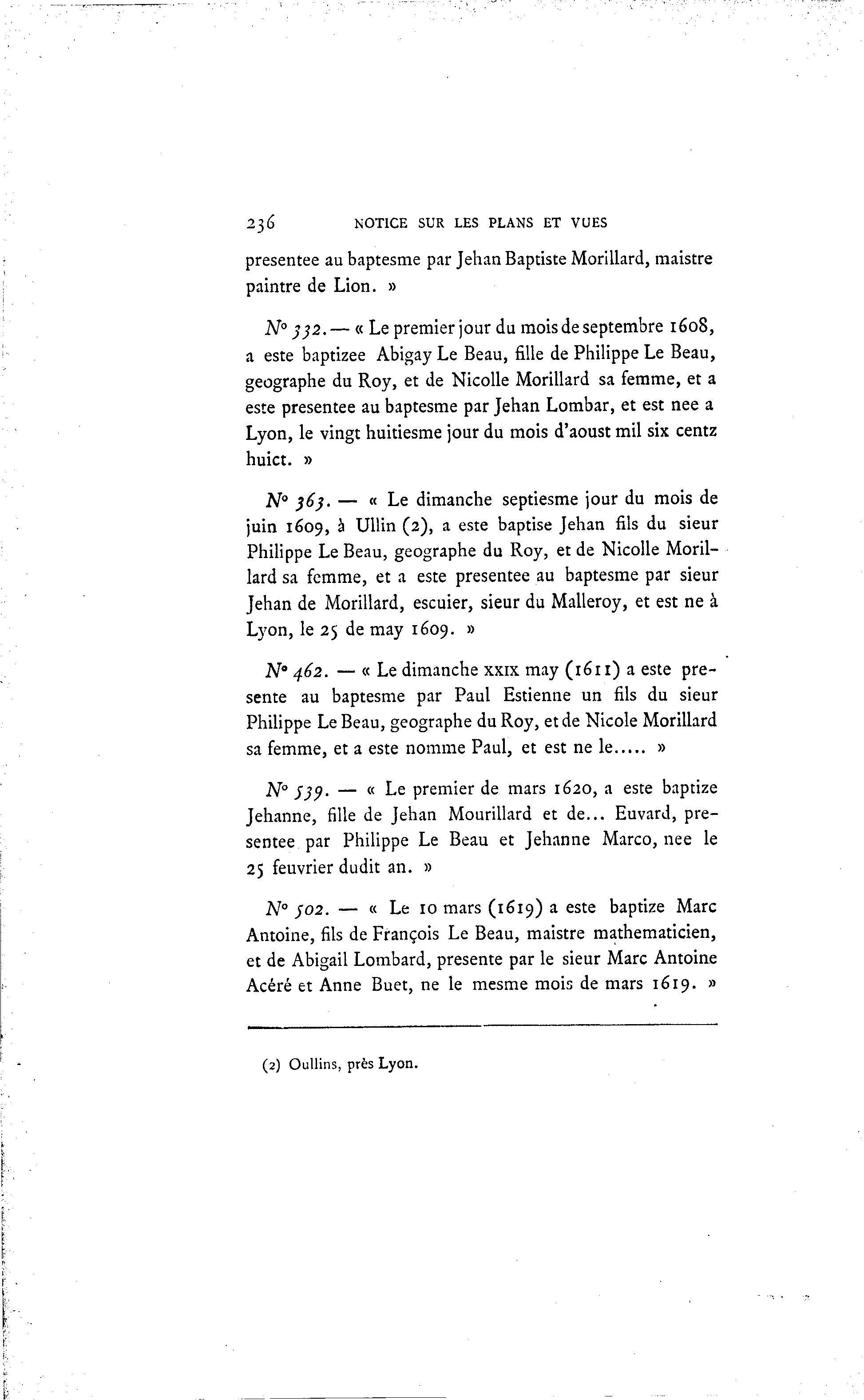 236 NOTICE SUR LES PLANS ET VUES présentée au baptesme par Jehan Baptiste Morillard, maistre paintre de Lion. » N° 332.— « Le premier jour du mois de septembre 1608, a este baptizee Abigay Le Beau, fille de Philippe Le Beau, géographe du Roy, et de Nicolle Morillard sa femme, et a este présentée au baptesme par Jehan Lombar, et est née a Lyon, le vingt huitiesme jour du mois d'aoust mil six centz huict. » N° 36). — « Le dimanche septiesme jour du mois de juin 1609, à Ullin (2), a este baptise Jehan fils du sieur Philippe Le Beau, géographe du Roy, et de Nicolle Moril- lard sa femme, et a este présentée au baptesme par sieur Jehan de Morillard, escuier, sieur du Malleroy, et est ne à Lyon, le 25 de may 1609. » N° 462. — « Le dimanche xxix may (1611) a este pré- sente au baptesme par Paul Estienne un fils du sieur Philippe Le Beau, géographe du Roy, et de Nicole Morillard sa femme, et a este nomme Paul, et est ne le » N° S39. — « Le premier de mars 1620, a este baptize Jehanne, fille de Jehan Mourillard et de... Euvard, pré- sentée par Philippe Le Beau et Jehanne Marco, née le 25 feuvrier dudit an. » N° $02. — « Le 10 mars (1619) a este baptize Marc Antoine, fils de François Le Beau, maistre mathématicien, et de Abigail Lombard, présente par le sieur Marc Antoine Acéré et Anne Buet, ne le mesme mois de mars 1619. » (2) Oullins, près Lyon.
