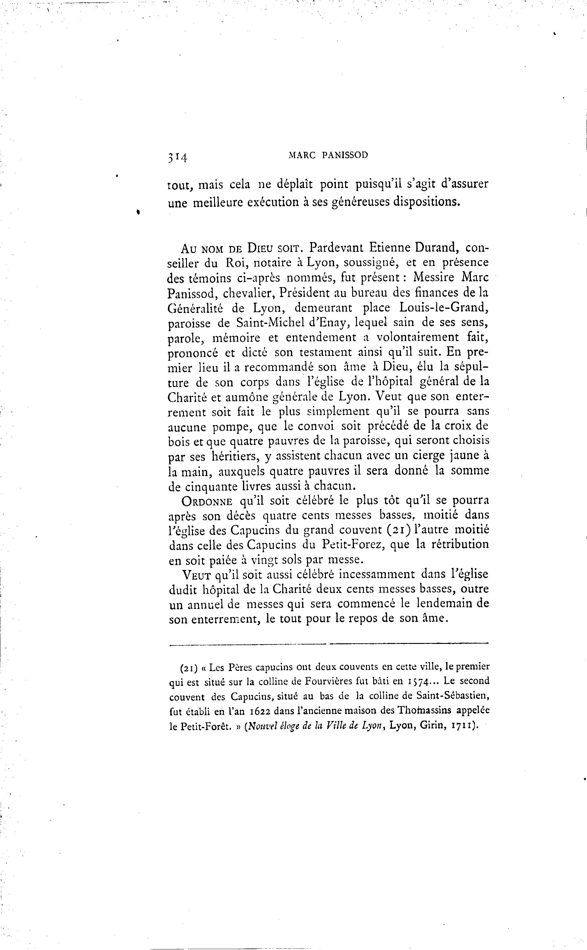 3*4 MARC PANISSOD tout, mais cela ne déplaît point puisqu'il s'agit d'assurer une meilleure exécution à ses généreuses dispositions. Au NOM DE DIEU SOIT. Pardevant Etienne Durand, con- seiller du Roi, notaire à Lyon, soussigné, et en présence des témoins ci-après nommés, fut présent : Messire Marc Panissod, chevalier, Président au bureau des finances de la Généralité de Lyon, demeurant place Louis-le-Grand, paroisse de Saint-Michel d'Enay, lequel sain de ses sens, parole, mémoire et entendement a volontairement fait, prononcé et dicté son testament ainsi qu'il suit. En pre- mier lieu il a recommandé son âme à Dieu, élu la sépul- ture de son corps dans l'église de l'hôpital général de la Charité et aumône générale de Lyon. Veut que son enter- rement soit fait le plus simplement qu'il se pourra sans aucune pompe, que le convoi soit précédé de la croix de bois et que quatre pauvres de la paroisse, qui seront choisis par ses héritiers, y assistent chacun avec un cierge jaune à la main, auxquels quatre pauvres il sera donné la somme de cinquante livres aussi à chacun. ORDONNE qu'il soit célébré le plus tôt qu'il se pourra après son décès quatre cents messes basses, moitié dans l'église des Capucins du grand couvent (21) l'autre moitié dans celle des Capucins du Petit-Forez, que la rétribution en soit paiée à vingt sols par messe. VEUT qu'il soit aussi célébré incessamment dans l'église dudit hôpital de la Charité deux cents messes basses, outre un annuel de messes qui sera commencé le lendemain de son enterrement, le tout pour le repos de son âme. (21) « Les Pères capucins out deux couvents en cette ville, le premier qui est situé sur la colline de Fourvières fut bâti en 1574... Le second couvent des Capucins, situé au bas de la colline de Saint-Sébastien, fut établi en l'an 1622 dans l'ancienne maison des Thofnassins appelée le Petit-Forêt. » (Nouvel éloge de la Ville de Lyon, Lyon, Girin, 1711).