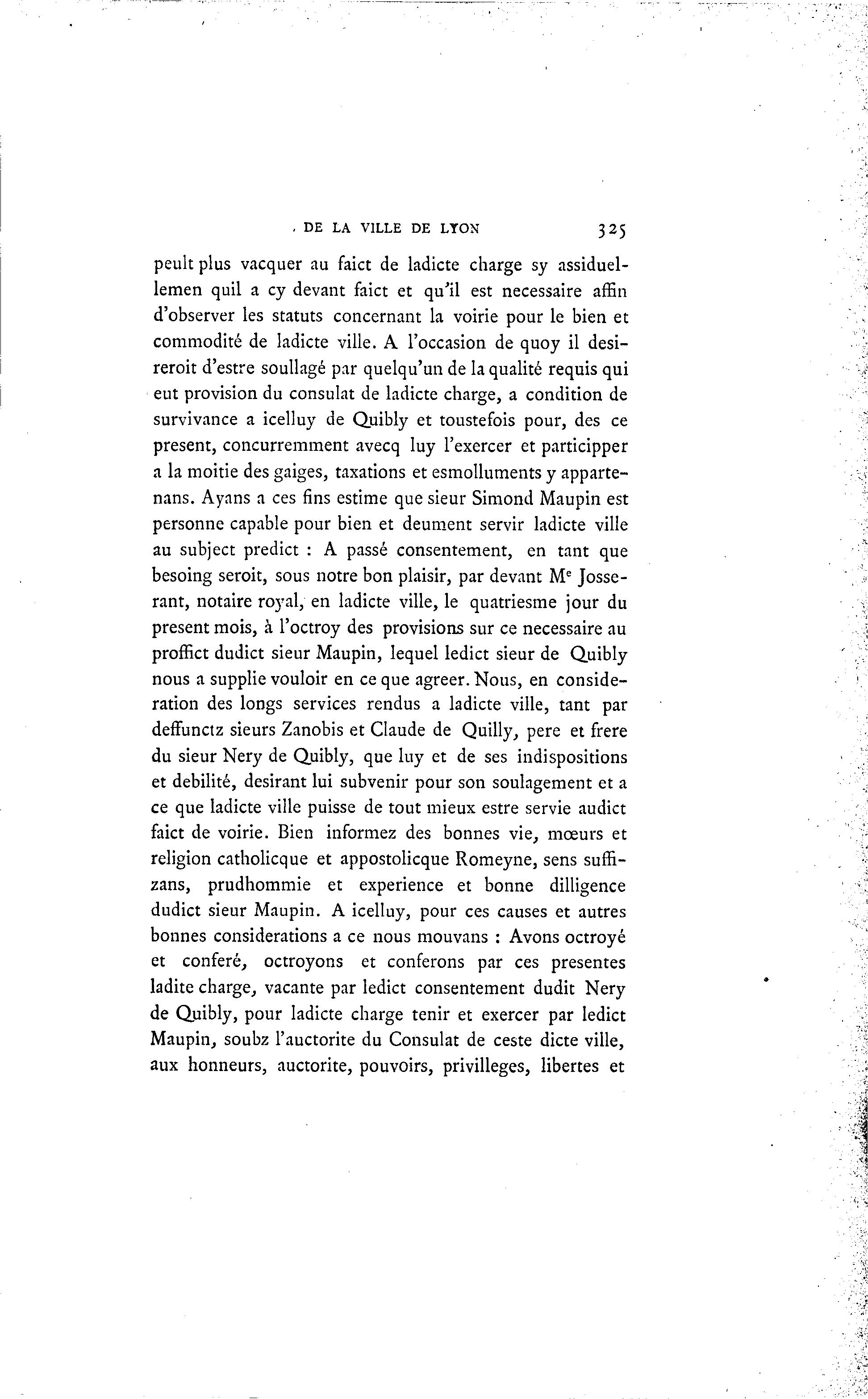 . DE LA VILLE DE LYON 325 peult plus vacquer au faict de ladicte charge sy assiduel- lemen quil a cy devant faict et qu'il est nécessaire affin d'observer les statuts concernant la voirie pour le bien et commodité de ladicte ville. A l'occasion de quoy il dési- rerait d'estre soullagé par quelqu'un de la qualité requis qui eut provision du consulat de ladicte charge, a condition de survivance a icelluy de Quibly et toustefois pour, des ce présent, concurremment avecq luy l'exercer et participper a la moitié des gaiges, taxations et esmolluments y apparte- nans. Ayans a ces fins estime que sieur Simond Maupin est personne capable pour bien et deument servir ladicte ville au subject predict : A passé consentement, en tant que besoing seroit, sous notre bon plaisir, par devant Me Josse- rant, notaire royal, en ladicte ville, le quatriesme jour du présent mois, à l'octroy des provisions sur ce nécessaire au proffict dudict sieur Maupin, lequel ledict sieur de Quibly nous a supplie vouloir en ce que agréer. Nous, en considé- ration des longs services rendus a ladicte ville, tant par deffunctz sieurs Zanobis et Claude de Quilly, père et frère du sieur Nery de Quibly, que luy et de ses indispositions et débilité, désirant lui subvenir pour son soulagement et a ce que ladicte ville puisse de tout mieux estre servie audict faict de voirie. Bien informez des bonnes vie, mœurs et religion catholicque et appostolicque Romeyne, sens suffi - zans, prudhommie et expérience et bonne dilligence dudict sieur Maupin. A icelluy, pour ces causes et autres bonnes considérations a ce nous mouvans : Avons octroyé et conféré, octroyons et conférons par ces présentes ladite charge, vacante par ledict consentement dudit Nery de Quibly, pour ladicte charge tenir et exercer par ledict Maupin, soubz l'auctorite du Consulat de ceste dicte ville, aux honneurs, auctorite, pouvoirs, privilleges, libertés et