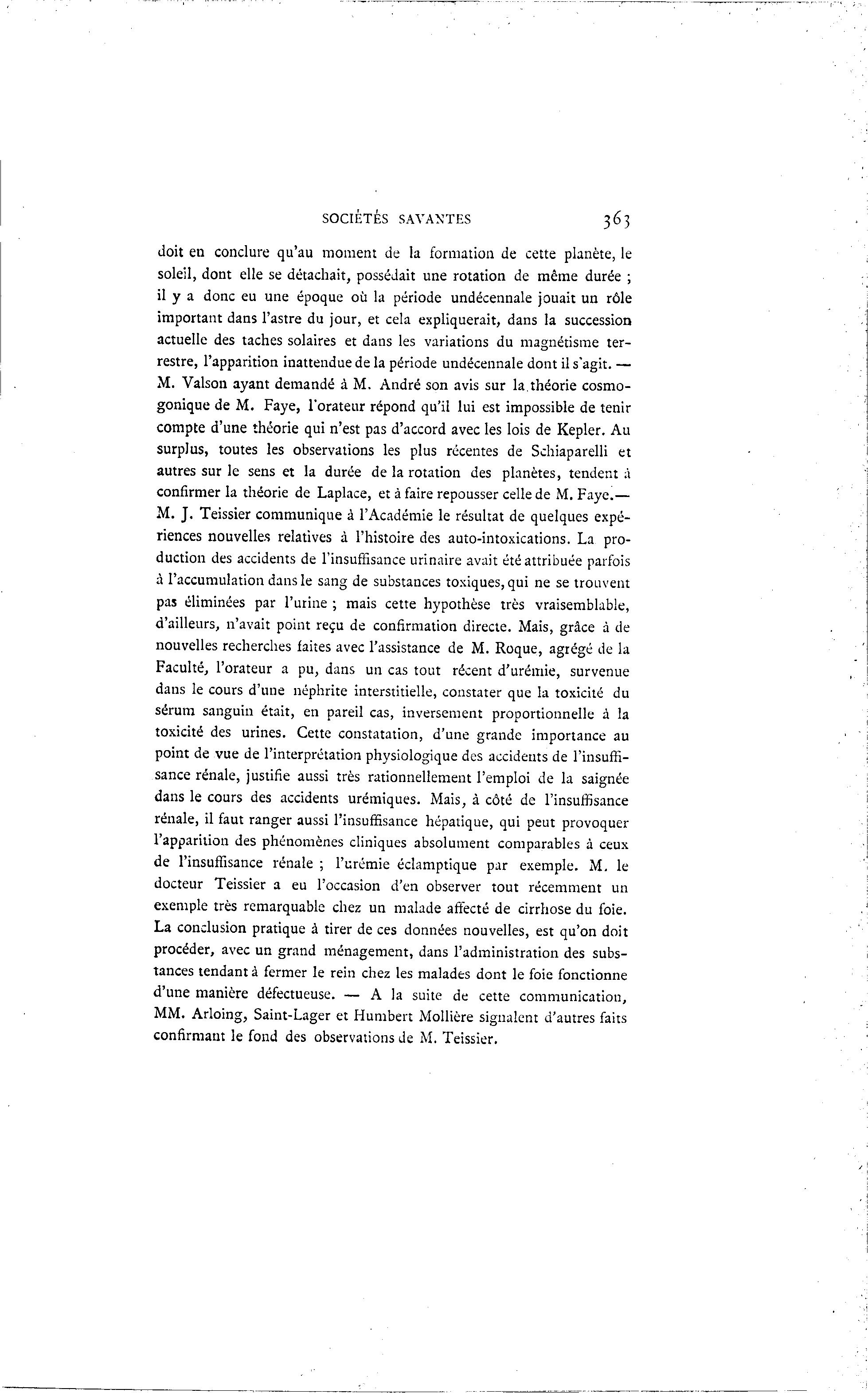 SOCIÉTÉS SAVANTES 363 doit en conclure qu'au moment de la formation de cette planète, le soleil, dont elle se détachait, possédait une rotation de même durée ; il y a donc eu une époque où la période undécennale jouait un rôle important dans l'astre du jour, et cela expliquerait, dans la succession actuelle des taches solaires et dans les variations du magnétisme ter- restre, l'apparition inattendue de la période undécennale dont il s'agit. — M. Valson ayant demandé à M. André son avis sur la.théorie cosmo- gonique de M. Faye, l'orateur répond qu'il lui est impossible de tenir compte d'une théorie qui n'est pas d'accord avec les lois de Kepler. Au surplus, toutes les observations les plus récentes de Schiaparelli et autres sur le sens et la durée de la rotation des planètes, tendent à confirmer la théorie de Laplace, et à faire repousser celle de M. Faye.— M. J. Teissier communique à l'Académie le résultat de quelques expé- riences nouvelles relatives à l'histoire des auto-intoxications. La pro- duction des accidents de l'insuffisance urinaire avait été attribuée parfois à l'accumulation dans le sang de substances toxiques, qui ne se trouvent pas éliminées par l'urine ; mais cette hypothèse très vraisemblable, d'ailleurs, n'avait point reçu de confirmation directe. Mais, grâce à de nouvelles recherches faites avec l'assistance de M. Roque, agrégé de la Faculté, l'orateur a pu, dans un cas tout récent d'urémie, survenue dans le cours d'une néphrite interstitielle, constater que la toxicité du sérum sanguin était, en pareil cas, inversement proportionnelle à la toxicité des urines. Cette constatation, d'une grande importance au point de vue de l'interprétation physiologique des accidents de l'insuffi- sance rénale, justifie aussi très rationnellement l'emploi de la saignée dans le cours des accidents urémiques. Mais, à côté de l'insuffisance rénale, il faut ranger aussi l'insuffisance hépatique, qui peut provoquer l'apparition des phénomènes cliniques absolument comparables à ceux de l'insuffisance rénale ; l'urémie éclamptique par exemple. M. le docteur Teissier a eu l'occasion d'en observer tout récemment un exemple très remarquable chez un malade affecté de cirrhose du foie. La conclusion pratique à tirer de ces données nouvelles, est qu'on doit procéder, avec un grand ménagement, dans l'administration des subs- tances tendant à fermer le rein chez les malades dont le foie fonctionne d'une manière défectueuse. — A la suite de cette communication, MM. Arloing, Saint-Lager et Humbert Mollière signalent d'autres faits confirmant le fond des observations de M. Teissier.