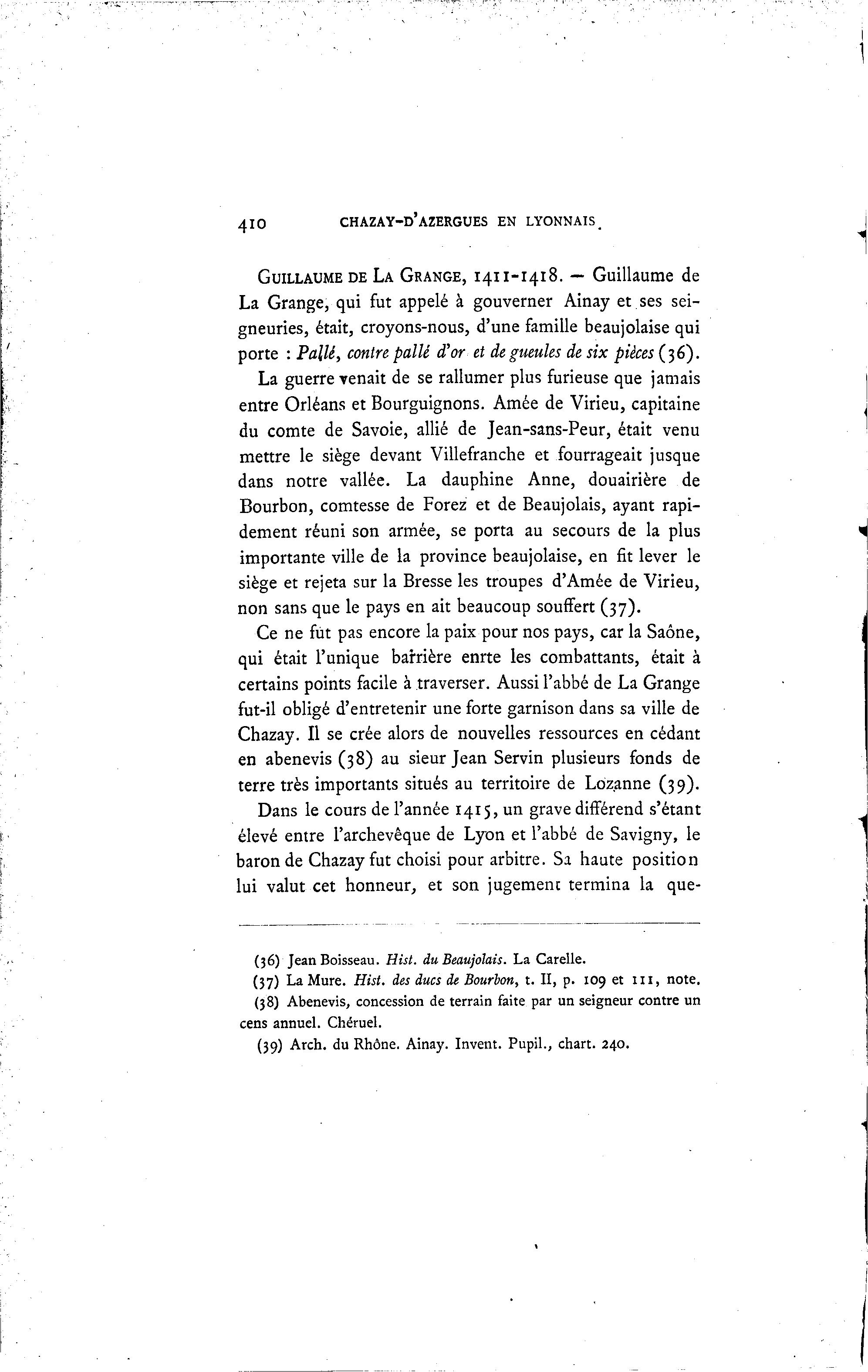 410 CHAZAY-D'AZERGUES EN LYONNAIS. GUILLAUME DE LA GRANGE, 1411-1418. — Guillaume de La Grange, qui fut appelé à gouverner Ainay et ses sei- gneuries, était, croyons-nous, d'une famille beaujolaise qui porte : Pallé, contre pallé d'or et de gueules de six pièces (36). La guerre venait de se rallumer plus furieuse que jamais entre Orléans et Bourguignons. Amée de Virieu, capitaine du comte de Savoie, allié de Jean-sans-Peur, était venu mettre le siège devant Villefranche et fourrageait jusque dans notre vallée. La dauphine Anne, douairière de Bourbon, comtesse de Forez et de Beaujolais, ayant rapi- dement réuni son armée, se porta au secours de la plus importante ville de la province beaujolaise, en fit lever le siège et rejeta sur la Bresse les troupes d'Amée de Virieu, non sans que le pays en ait beaucoup souffert (37). Ce ne fut pas encore la paix pour nos pays, car la Saône, qui était l'unique barrière enrte les combattants, était à certains points facile à traverser. Aussi l'abbé de La Grange fut-il obligé d'entretenir une forte garnison dans sa ville de Chazay. Il se crée alors de nouvelles ressources en cédant en abenevis (38) au sieur Jean Servin plusieurs fonds de terre très importants situés au territoire de Lbz.anne (39). Dans le cours de l'année 1415, un grave différend s'étant élevé entre l'archevêque de Lyon et l'abbé de Savigny, le baron de Chazay fut choisi pour arbitre. Sa haute position lui valut cet honneur, et son jugemenc termina la que- (36) Jean Boisseau. Hist. du Beaujolais. La Carelle. (37) La Mure. Hist. des ducs de Bourbon, t. II, p. 109 et n i , note. (38) Abenevis, concession de terrain faite par un seigneur contre un cens annuel. Chéruel. (39) Arch. du Rhône. Ainay. Invent. Pupil., chart. 240.