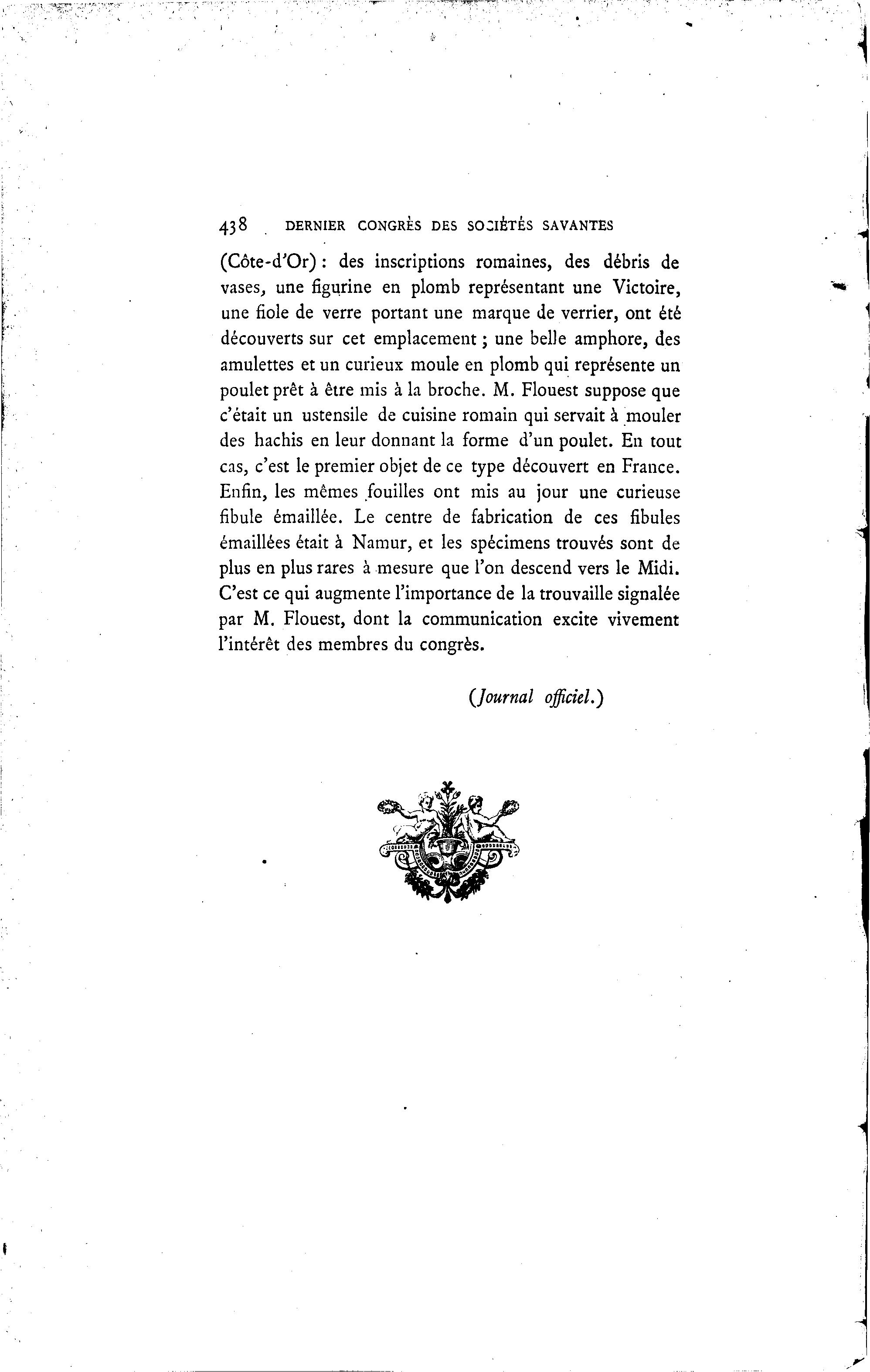 438 DERNIER CONGRES DES SOCIETES SAVANTES (Côte-d'Or) : des inscriptions romaines, des débris de vases, une figurine en plomb représentant une Victoire, une fiole de verre portant une marque de verrier, ont été découverts sur cet emplacement ; une belle amphore, des amulettes et un curieux moule en plomb qui représente un poulet prêt à être mis à la broche. M. Flouest suppose que c'était un ustensile de cuisine romain qui servait à mouler des hachis en leur donnant la forme d'un poulet. En tout cas, c'est le premier objet de ce type découvert en France. Enfin, les mêmes fouilles ont mis au jour une curieuse fibule émaillée. Le centre de fabrication de ces fibules émaillées était à Namur, et les spécimens trouvés sont de plus en plus rares à mesure que l'on descend vers le Midi. C'est ce qui augmente l'importance de la trouvaille signalée par M. Flouest, dont la communication excite vivement l'intérêt des membres du congrès. {Journal officiel.)