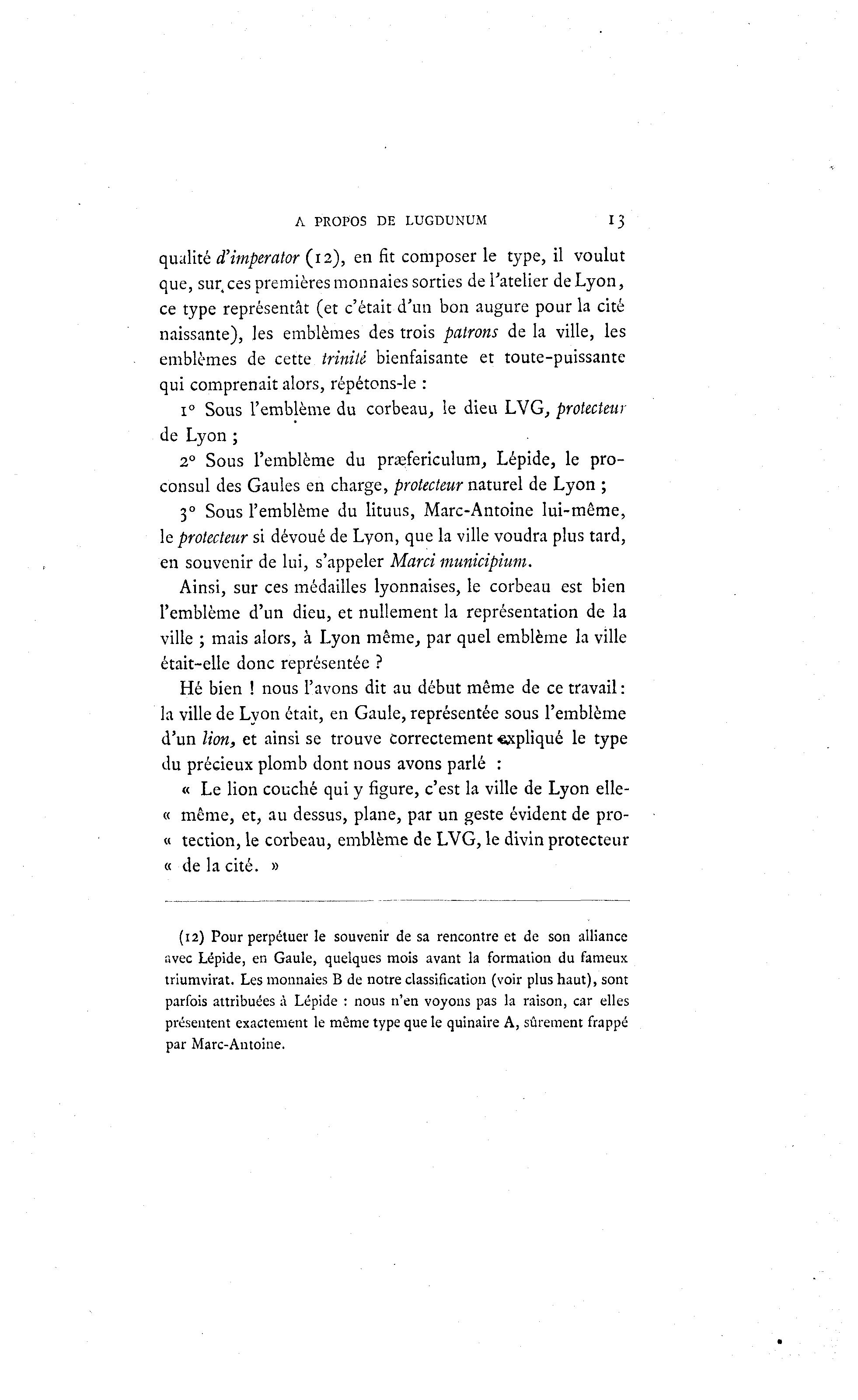 A PROPOS DE LUGDUNUM 13 qualité d'imperator (12), en fit composer le type, il voulut que, sur ces premières monnaies sorties de l'atelier de Lyon, ce type représentât (et c'était d'un bon augure pour la cité naissante), les emblèmes des trois patrons de la ville, les emblèmes de cette trinité bienfaisante et toute-puissante qui comprenait alors, répétons-le : i° Sous l'emblème du corbeau, le dieu LVG, protecteur de Lyon ; 20 Sous l'emblème du prafericulum, Lépide, le pro- consul des Gaules en charge, protecteur naturel de Lyon ; 30 Sous l'emblème du lituus, Marc-Antoine lui-même, le protecteur si dévoué de Lyon, que la ville voudra plus tard, en souvenir de lui, s'appeler Marci municipium. Ainsi, sur ces médailles lyonnaises, le corbeau est bien l'emblème d'un dieu, et nullement la représentation de la ville ; mais alors, à Lyon même, par quel emblème la ville était-elle donc représentée ? Hé bien ! nous l'avons dit au début même de ce travail: la ville de Lyon était, en Gaule, représentée sous l'emblème d'un lion, et ainsi se trouve Correctement «xpliqué le type du précieux plomb dont nous avons parlé : « Le lion couché qui y figure, c'est la ville de Lyon elle- « même, et, au dessus, plane, par un geste évident de pro- « tection, le corbeau, emblème de LVG, le divin protecteur « de la cité. » (12) Pour perpétuer le souvenir de sa rencontre et de son alliance avec Lépide, en Gaule, quelques mois avant la formation du fameux triumvirat. Les monnaies B de notre classification (voir plus haut), sont parfois attribuées à Lépide : nous n'en voyons pas la raison, car elles présentent exactement le même type que le quinaire A, sûrement frappé par Marc-Antoine.
