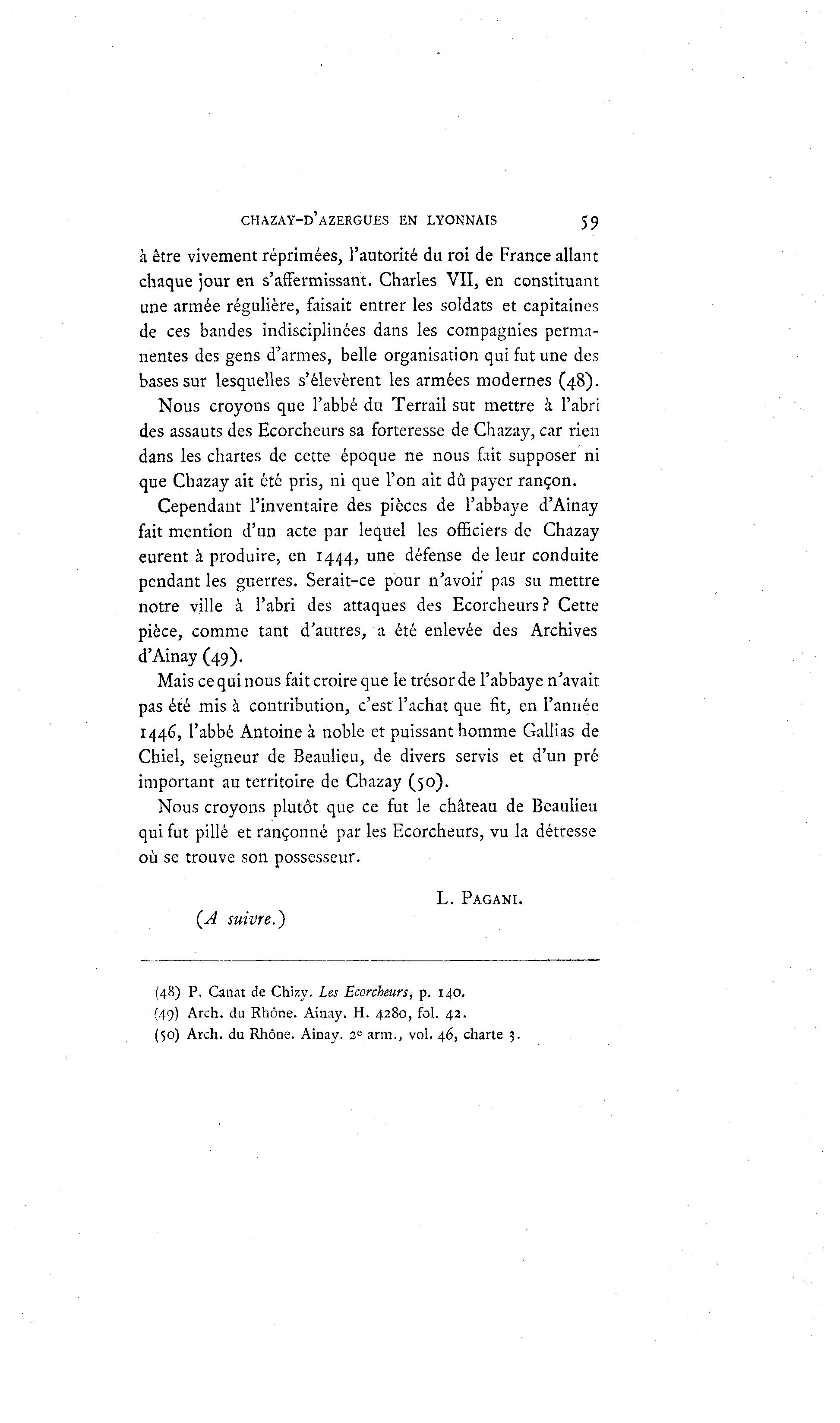 CHAZAY-D'AZERGUES EN LYONNAIS 59 à être vivement réprimées, l'autorité du roi de France allant chaque jour en s'affermissant. Charles VII, en constituant une armée régulière, faisait entrer les soldats et capitaines de ces bandes indisciplinées dans les compagnies perma- nentes des gens d'armes, belle organisation qui fut une des bases sur lesquelles s'élevèrent les armées modernes (48). Nous croyons que l'abbé du Terrail sut mettre à l'abri des assauts des Ecorcheurs sa forteresse de Chazay, car rien dans les chartes de cette époque ne nous fait supposer ni que Chazay ait été pris, ni que l'on ait dû payer rançon. Cependant l'inventaire des pièces de l'abbaye d'Ainay fait mention d'un acte par lequel les officiers de Chazay eurent à produire, en 1444, une défense de leur conduite pendant les guerres. Serait-ce pour n'avoir pas su mettre notre ville à l'abri des attaques des Ecorcheurs? Cette pièce, comme tant d'autres, a été enlevée des Archives d'Ainay (49). Mais ce qui nous fait croire que le trésor de l'abbaye n'avait pas été mis à contribution, c'est l'achat que fit, en l'année 1446, l'abbé Antoine à noble et puissant homme Gallias de Chiel, seigneur de Beaulieu, de divers servis et d'un pré important au territoire de Chazay (50). Nous croyons plutôt que ce fut le château de Beaulieu qui fut pillé et rançonné par les Ecorcheurs, vu la détresse où se trouve son possesseur. L. PAGANI. (A suivre.) (48) P. Canat de Chizy. Les Ecorcheurs, p. 140. (49) Arch. du Rhône. Aiaay. H. 4280, fol. 42. (50) Arch. du Rhône. Ainay. 2e arm., vol. 46, charte 3.