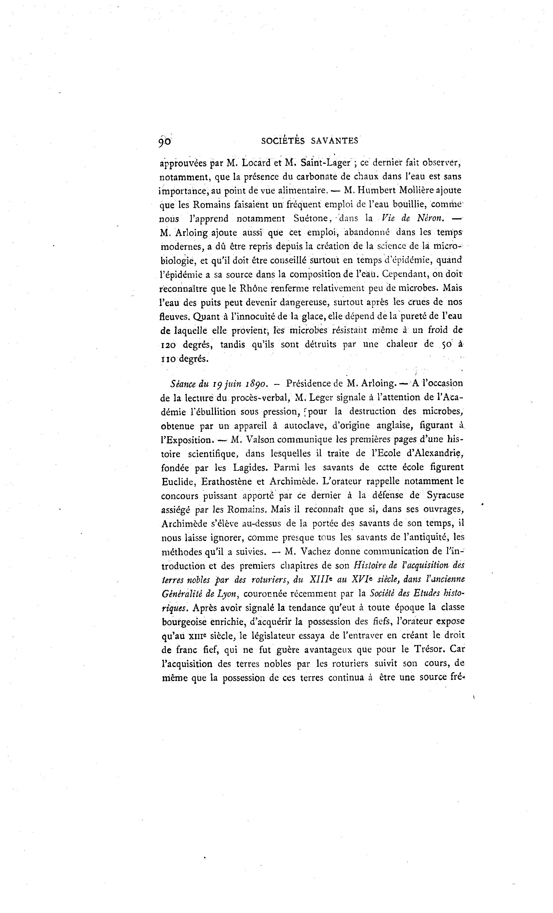90 SOCIÉTÉS SAVANTES approuvées par M. Locard et M. Saint-Lager ; ce dernier fait observer, notamment, que la présence du carbonate de chaux dans l'eau est sans importance, au point de vue alimentaire. — M. Humbert Mollièreajoute que les Romains faisaient un fréquent emploi de l'eau bouillie, comme' nous l'apprend notamment Suétone, dans la Vie de Néron. — M. Arloing ajoute aussi que cet emploi, abandonné dans les temps modernes, a dû être repris depuis la création de la science de là micro- biologie, et qu'il doit être conseillé surtout en temps d'épidémie, quand l'épidémie a sa source dans la composition de l'eà ù. Cependant, on doit reconnaître que le Rhône renferme relativement peu de microbes. Mais l'eau des puits peut devenir dangereuse, surtout après les crues de nos fleuves. Quant à l'innocuité de la glace, elle dépend delà pureté de l'eau de laquelle elle provient', les microbes résistant même à un froid de 120 degrés, tandis qu'ils sont détruits par une chaleur de 50 à 110 degrés. Séaticedu 19 juin 1890. - Présidence de M. Arloing. — A l'occasion de la lecture du procès-verbal, M. Léger signale à l'attention de l'Aca- démie l'ébullition sous pression, fpour la destruction des microbes; obtenue par un appareil à autoclave, d'origine anglaise, figurant à l'Exposition. — M. Valson communique les premières pages d'une his- toire scientifique, dans lesquelles il traite de l'Ecole d'Alexandrie, fondée par les Lagides. Parmi les savants de cette école figurent Euclide, Erathostène et Archimède. L'orateur rappelle notamment le concours puissant apporté par ce dernier à la défense de Syracuse assiégé par les Romains. Mais il reconnaît que si, dans ses ouvrages, Archimède s'élève au-dessus de la portée des savants de son temps, il nous laisse ignorer, comme presque tous les savants de l'antiquité, les méthodes qu'il a suivies. — M. Vachez donne communication de l'in- troduction et des premiers chapitres de son Histoire de l'acquisition des terres nobles par des roturiers, du XIII' au XVIe siècle, dans l'ancienne Généralité de Lyon, couronnée récemment par la Société des Etudes histo- riques. Après avoir signalé la tendance qu'eut à toute époque la classe bourgeoise enrichie, d'acquérir la possession des fiefs, l'orateur expose qu'au xm e siècle, le législateur essaya de l'entraver en créant le droit de franc fief, qui ne fut guère avantageux que pour le Trésor. Car l'acquisition des terres nobles par les roturiers suivit son cours, de même que la possession de ces terres continua à être une source fré*