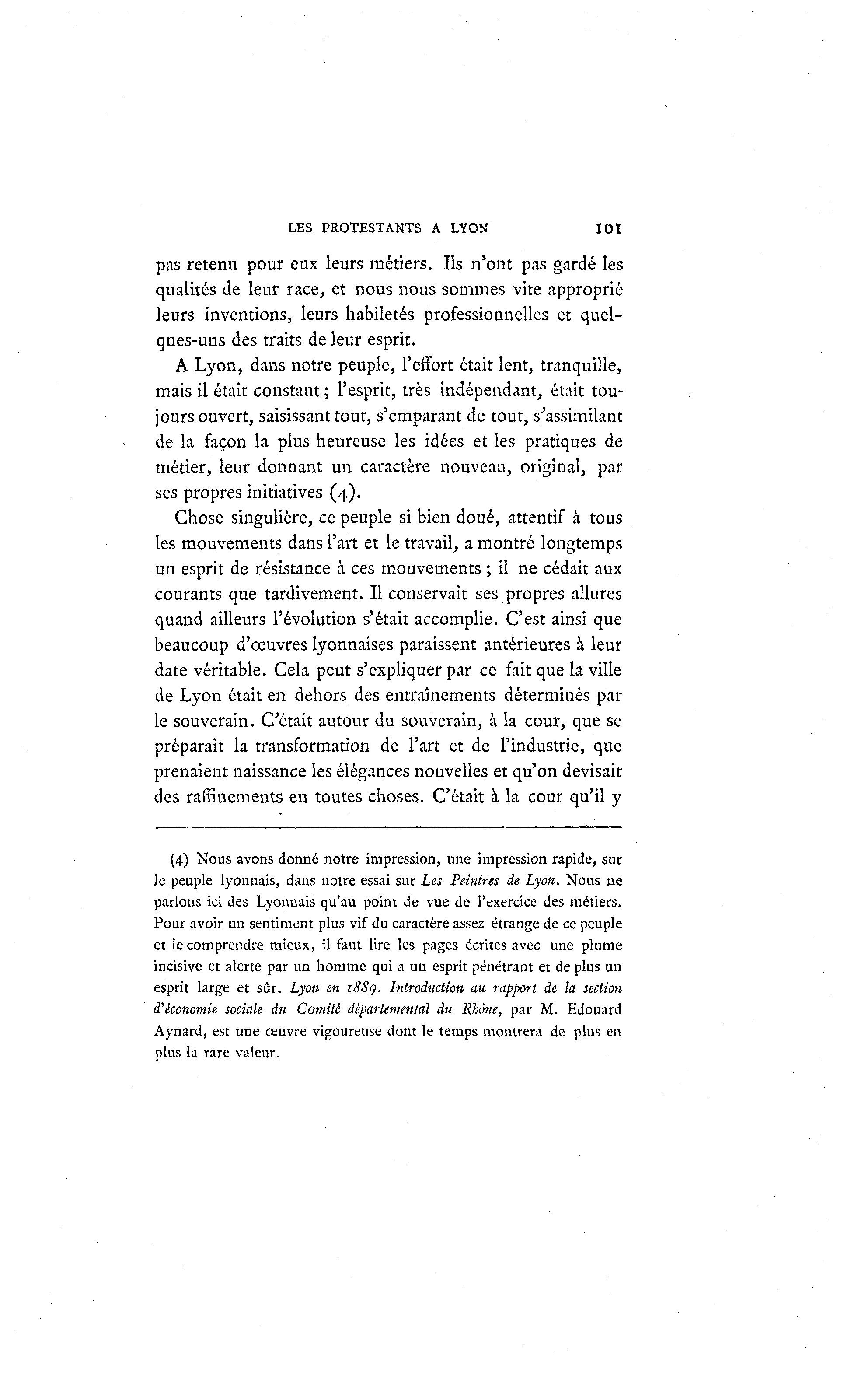 LES PROTESTANTS A LYON IOI pas retenu pour eux leurs métiers. Ils n'ont pas gardé les qualités de leur race, et nous nous sommes vite approprié leurs inventions, leurs habiletés professionnelles et quel- ques-uns des traits de leur esprit. A Lyon, dans notre peuple, l'effort était lent, tranquille, mais il était constant ; l'esprit, très indépendant, était tou- jours ouvert, saisissant tout, s'emparant de tout, s'assimilant de la façon la plus heureuse les idées et les pratiques de métier, leur donnant un caractère nouveau, original, par ses propres initiatives (4). Chose singulière, ce peuple si bien doué, attentif à tous les mouvements dans l'art et le travail, a montré longtemps un esprit de résistance à ces mouvements ; il ne cédait aux courants que tardivement. Il conservait ses propres allures quand ailleurs l'évolution s'était accomplie. C'est ainsi que beaucoup d'oeuvres lyonnaises paraissent antérieures à leur date véritable. Cela peut s'expliquer par ce fait que la ville de Lyon était en dehors des entraînements déterminés par le souverain. C'était autour du souverain, à la cour, que se préparait la transformation de l'art et de l'industrie, que prenaient naissance les élégances nouvelles et qu'on devisait des raffinements en toutes choses. C'était à la cour qu'il y (4) Nous avons donné notre impression, une impression rapide, sur le peuple lyonnais, dans notre essai sur Les Peintres de Lyon. Nous ne parlons ici des Lyonnais qu'au point de vue de l'exercice des métiers. Pour avoir un sentiment plus vif du caractère assez étrange de ce peuple et le comprendre mieux, il faut lire les pages écrites avec une plume incisive et alerte par un homme qui a un esprit pénétrant et de plus un esprit large et sûr. Lyon en tS8g. Introduction au rapport de la section d'économie sociale du Comité départemental du Rhône, par M. Edouard Aynard, est une œuvre vigoureuse dont le temps montrera de plus en plus la rare valeur.