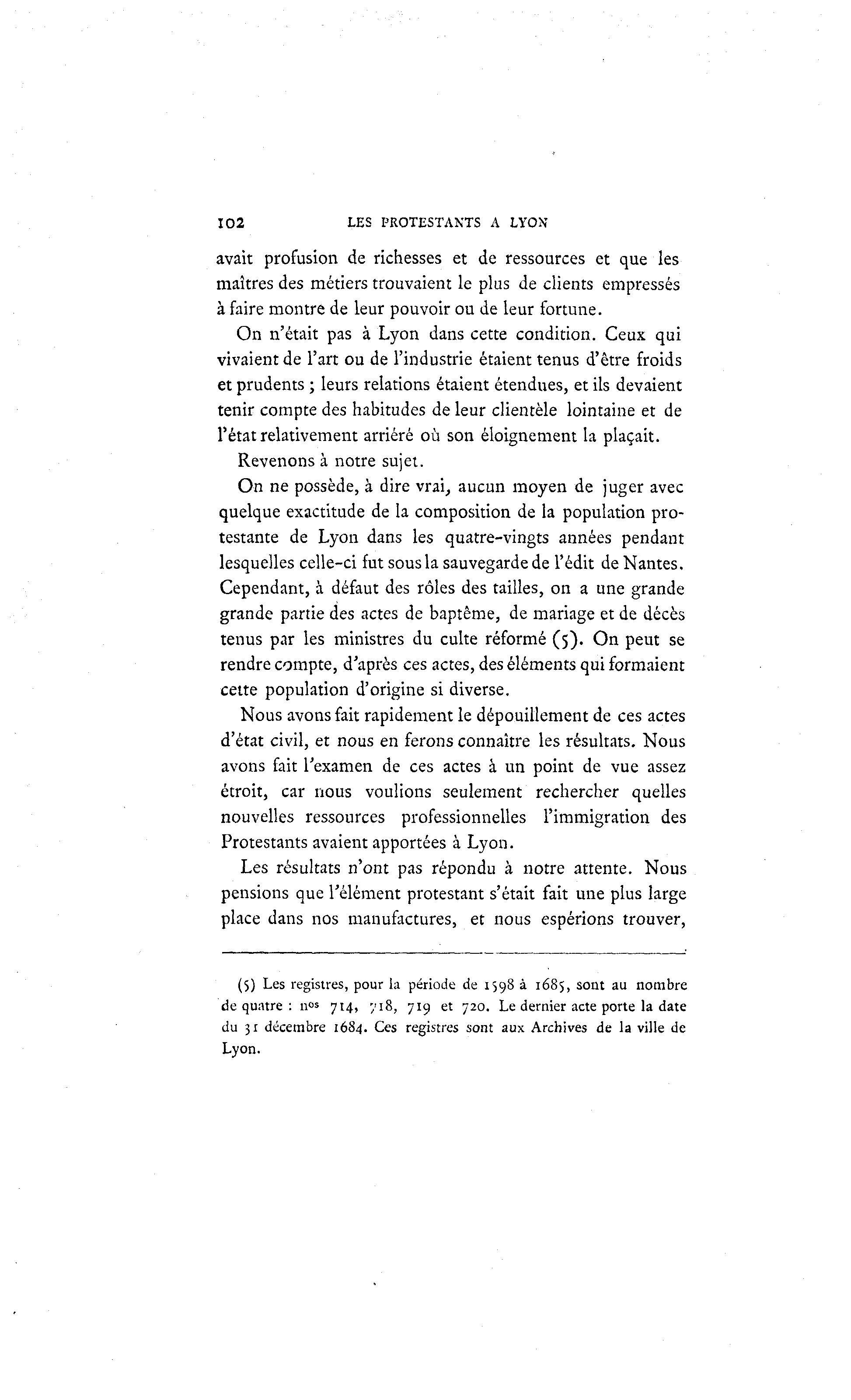 102 LES PROTESTANTS A LYON avait profusion de richesses et de ressources et que les maîtres des métiers trouvaient le plus de clients empressés à faire montre de leur pouvoir ou de leur fortune. On n'était pas à Lyon dans cette condition. Ceux qui vivaient de l'art ou de l'industrie étaient tenus d'être froids et prudents ; leurs relations étaient étendues, et ils devaient tenir compte des habitudes de leur clientèle lointaine et de l'état relativement arriéré où son éloignement la plaçait. Revenons à notre sujet. On ne possède, à dire vrai, aucun moyen de juger avec quelque exactitude de la composition de la population pro- testante de Lyon dans les quatre-vingts années pendant lesquelles celle-ci fut sous la sauvegarde de l'édit de Nantes. Cependant, à défaut des rôles des tailles, on a une grande grande partie des actes de baptême, de mariage et de décès tenus par les ministres du culte réformé (5). On peut se rendre compte, d'après ces actes, des éléments qui formaient cette population d'origine si diverse. Nous avons fait rapidement le dépouillement de ces actes d'état civil, et nous en ferons connaître les résultats. Nous avons fait l'examen de ces actes à un point de vue assez étroit, car nous voulions seulement rechercher quelles nouvelles ressources professionnelles l'immigration des Protestants avaient apportées à Lyon. Les résultats n'ont pas répondu à notre attente. Nous pensions que l'élément protestant s'était fait une plus large place dans nos manufactures, et nous espérions trouver, (5) Les registres, pour la période de 1598 à 1685, sont au nombre de quatre : n<" 714, 718, 719 et 720. Le dernier acte porte la date du 31 décembre 1684. Ces registres sont aux Archives de la ville de Lyon.