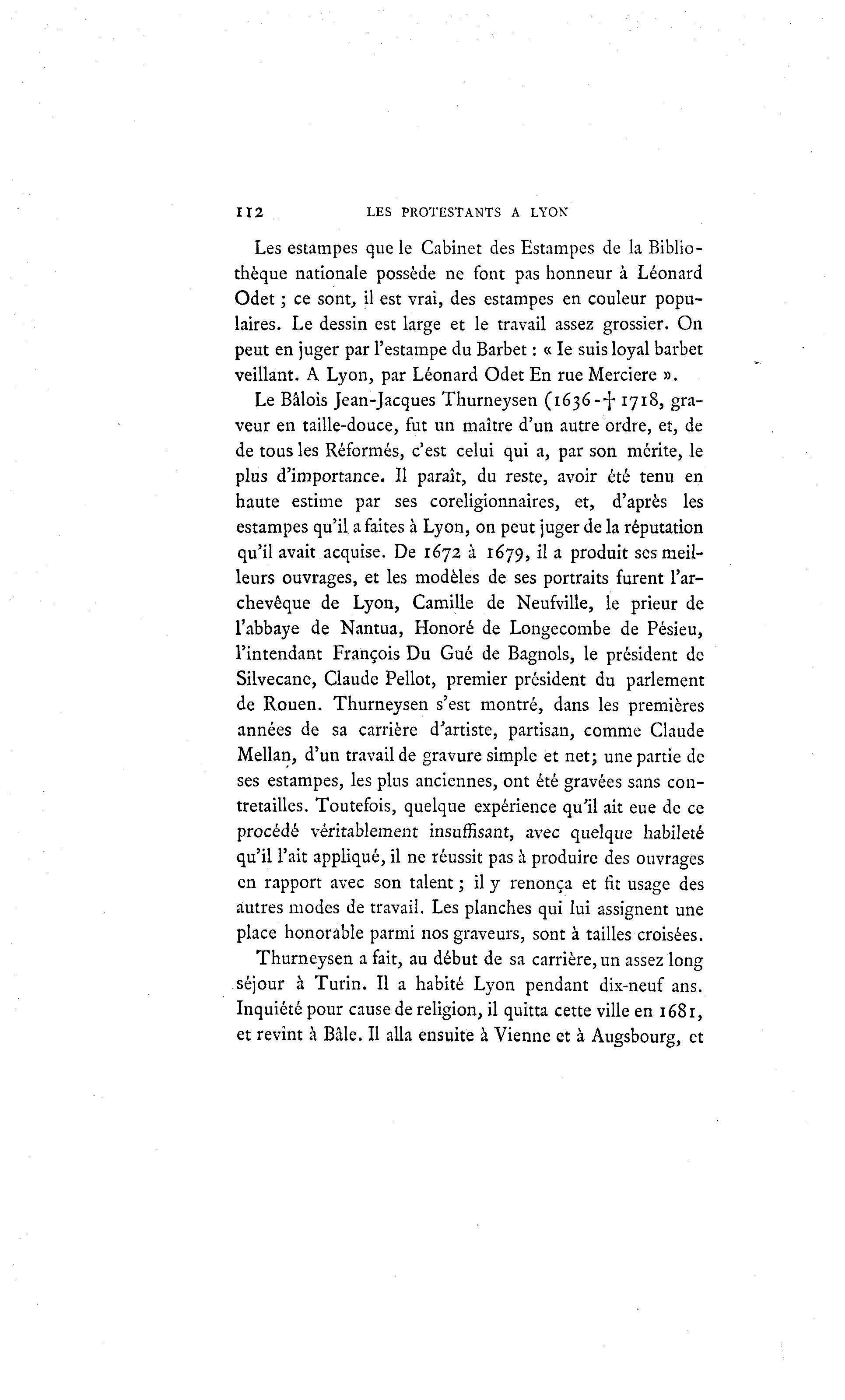 112 LES PROTESTANTS A LYON Les estampes que le Cabinet des Estampes de la Biblio- thèque nationale possède ne font pas honneur à Léonard Odet ; ce sont, il est vrai, des estampes en couleur popu- laires. Le dessin est large et le travail assez grossier. On peut en juger par l'estampe du Barbet : « le suis loyal barbet veillant. A Lyon, par Léonard Odet En rue Mercière ». Le Bâlois Jean-Jacques Thurneysen (1636--]-1718, gra- veur en taille-douce, fut un maître d'un autre ordre, et, de de tous les Réformés, c'est celui qui a, par son mérite, le plus d'importance. Il paraît, du reste, avoir été tenu en haute estime par ses coreligionnaires, et, d'après les estampes qu'il a faites à Lyon, on peut juger de la réputation qu'il avait acquise. De 1672 à 1679, il a produit ses meil- leurs ouvrages, et les modèles de ses portraits furent l'ar- chevêque de Lyon, Camille de Neufville, le prieur de l'abbaye de Nantua, Honoré de Longecombe de Pésieu, l'intendant François Du Gué de Bagnols, le président de Silvecane, Claude Pellot, premier président du parlement de Rouen. Thurneysen s'est montré, dans les premières années de sa carrière d'artiste, partisan, comme Claude Mellan, d'un travail de gravure simple et net; une partie de ses estampes, les plus anciennes, ont été gravées sans con- tretailles. Toutefois, quelque expérience qu'il ait eue de ce procédé véritablement insuffisant, avec quelque habileté qu'il l'ait appliqué, il ne réussit pas à produire des ouvrages en rapport avec son talent ; il y renonça et fit usage des autres modes de travail. Les planches qui lui assignent une place honorable parmi nos graveurs, sont à tailles croisées. Thurneysen a fait, au début de sa carrière, un assez long séjour à Turin. Il a habité Lyon pendant dix-neuf ans. Inquiété pour cause de religion, il quitta cette ville en 1681, et revînt à Bâle. Il alla ensuite à Vienne et à Augsbourg, et