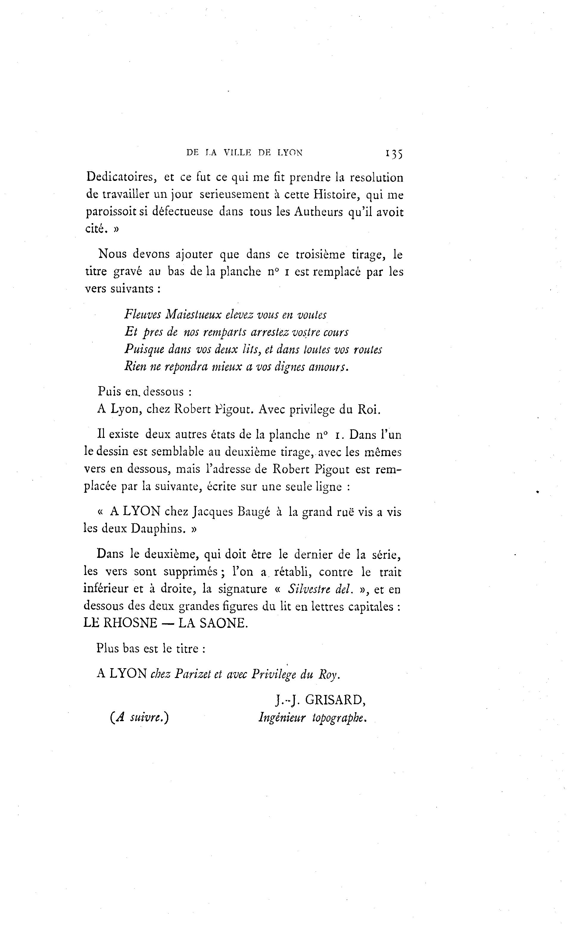DE I.A Vir.LR DE LYON 135 Dedicatoires, et ce fut ce qui me fit prendre la resolution de travailler un jour sérieusement à cette Histoire, qui me paroissoit si défectueuse dans tous les Autheurs qu'il avoit cité. » Nous devons ajouter que dans ce troisième tirage, le titre gravé au bas de la planche n° i est remplacé par les vers suivants : Fleuves Maiestueux élevez vous en voûtes Et près de nos remparts arrestez vostre cours Puisque dans vos deux lits, et dans toutes vos routes Rien ne repondra mieux a vos dignes amours- Puis en. dessous : A Lyon, chez Robert Pigout. Avec privilège du Roi. Il existe deux autres états de la planche n° i. Dans l'un le dessin est semblable au deuxième tirage, avec les mêmes vers en dessous, mais l'adresse de Robert Pigout est rem- placée par la suivante, écrite sur une seule ligne : « A LYON chez Jacques Baugé à la grand rue vis a vis les deux Dauphins. » Dans le deuxième, qui doit être le dernier de la série, les vers sont supprimés; l'on a rétabli, contre le trait inférieur et à droite, la signature « Silvestre del. », et en dessous des deux grandes figures du lit en lettres capitales : LE RHOSNE — LA SAONE. Plus bas est le titre : A LYON chez Parizet et avec Privilège du Roy. J.--J. GRISARD, {A suivre.} Ingénieur topographe.