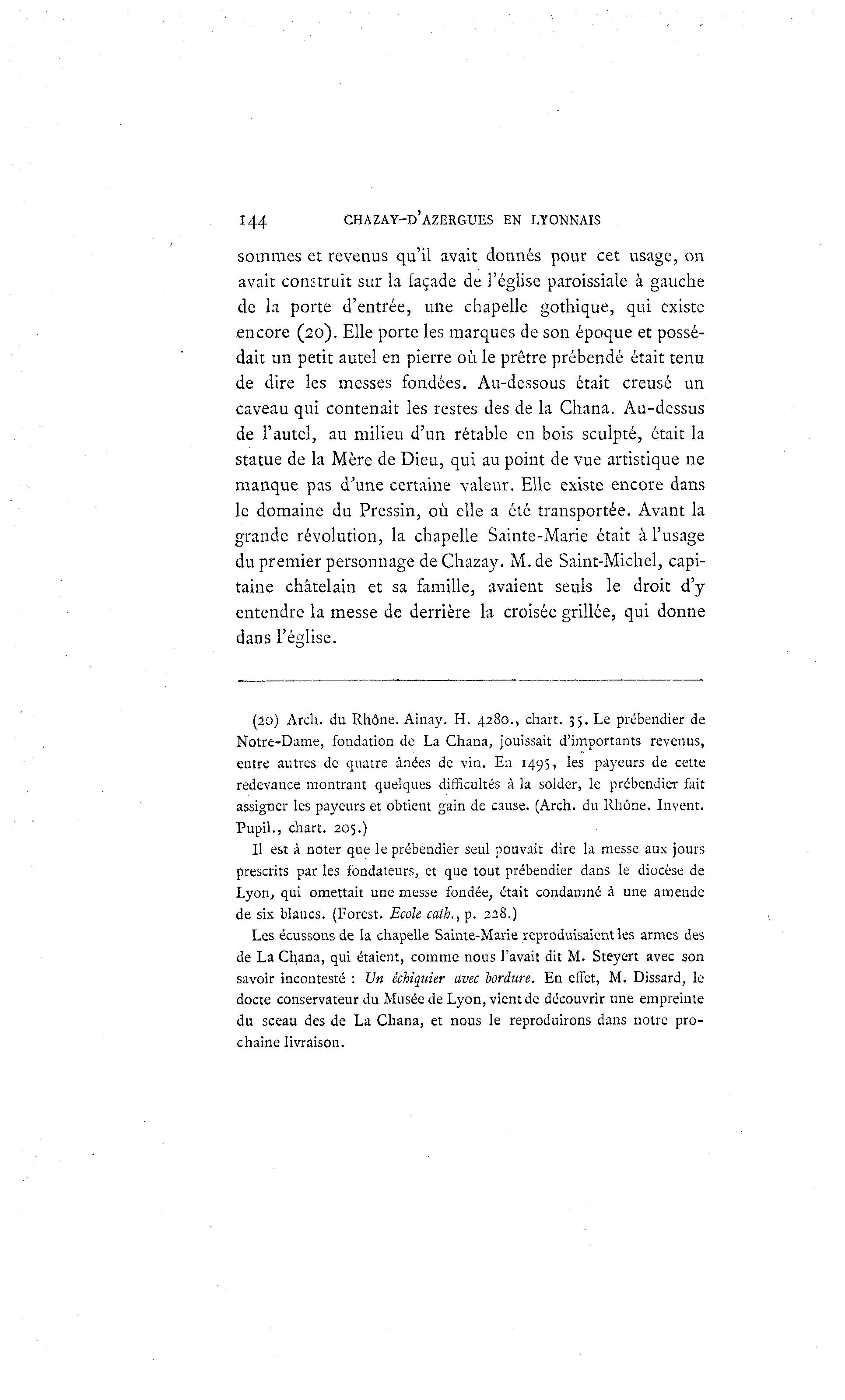144 CHAZAY-D'AZERGUES EN LYONNAIS sommes et revenus qu'il avait donnés pour cet usage, on avait construit sur la façade de l'église paroissiale à gauche de la porte d'entrée, une chapelle gothique, qui existe encore (20). Elle porte les marques de son époque et possé- dait un petit autel en pierre où le prêtre prébende était tenu de dire les messes fondées. Au-dessous était creusé un caveau qui contenait les restes des de la Chana. Au-dessus de l'autel, au milieu d'un rétable en bois sculpté, était la statue de la Mère de Dieu, qui au point de vue artistique ne manque pas d'une certaine valeur. Elle existe encore dans le domaine du Pressin, où elle a été transportée. Avant la grande révolution, la chapelle Sainte-Marie était à l'usage du premier personnage de Chazay. M. de Saint-Michel, capi- taine châtelain et sa famille, avaient seuls le droit d'y entendre la messe de derrière la croisée grillée, qui donne dans l'église. (20) Arch. du Rhône. Ainay. H. 4280., chart. 35. Le prébendier de Notre-Dame, fondation de La Chana, jouissait d'importants revenus, entre autres de quatre ânées de vin. En 1495, les payeurs de cette redevance montrant quelques difficultés à la solder, le prébendier fait assigner les payeurs et obtient gain de cause. (Arch. du Rhône. Invent. Pupil., chart. 205.) Il est à noter que le prébendier seul pouvait dire la messe aux jours prescrits par les fondateurs, et que tout prébendier dans le diocèse de Lyon, qui omettait une messe fondée, était condamné à une amende de six blancs. (Forest. Ecole cath., p. 228.) Les écussons de la chapelle Sainte-Marie reproduisaient les armes des de La Chana, qui étaient, comme nous l'avait dit M. Steyert avec son savoir incontesté : Un échiquier avec bordure. En effet, M. Dissard, le docte conservateur du Musée de Lyon, vient de découvrir une empreinte du sceau des de La Chana, et nous le reproduirons dans notre pro- chaine livraison.