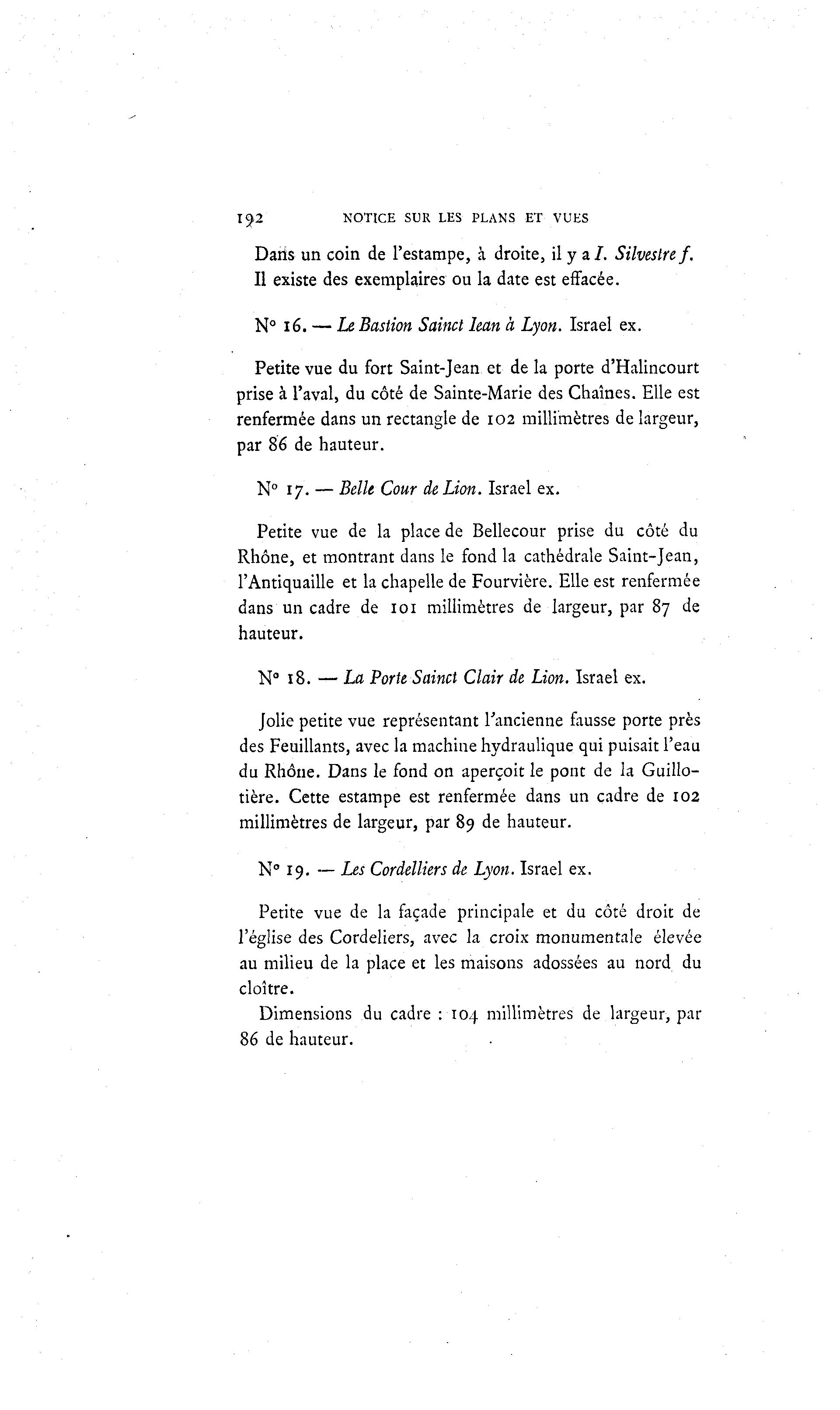I$2 NOTICE SUR LES PLANS ET VUES Daris un coin de l'estampe, à droite, il y a/. Silveslref. Il existe des exemplaires ou la date est effacée. N° 16. — Le Bastion Sainct lean à Lyon. Israël ex. Petite vue du fort Saint-Jean et de la porte d'Halincourt prise à l'aval, du côté de Sainte-Marie des Chaînes. Elle est renfermée dans un rectangle de 102 millimètres de largeur, par 86 de hauteur. N° 17. — Belle Cour de Lion. Israël ex. Petite vue de la place de Bellecour prise du côté du Rhône, et montrant dans le fond la cathédrale Saint-Jean, l'Antiquaille et la chapelle de Fourvière. Elle est renfermée dans un cadre de 101 millimètres de largeur, par 87 de hauteur. N° 18. — La Porte Sainct Clair de Lion. Israël ex. Jolie petite vue représentant l'ancienne fausse porte près des Feuillants, avec la machine hydraulique qui puisait l'eau du Rhône. Dans le fond on aperçoit le pont de la Guillo- tière. Cette estampe est renfermée dans un cadre de 102 millimètres de largeur, par 89 de hauteur. N° 19. — Les Cordelliers de Lyon. Israël ex. Petite vue de la façade principale et du côté droit de l'église des Cordeliers, avec la croix monumentale élevée au milieu de la place et les maisons adossées au nord du cloître. Dimensions du cadre : 104 millimètres de largeur, par 86 de hauteur.