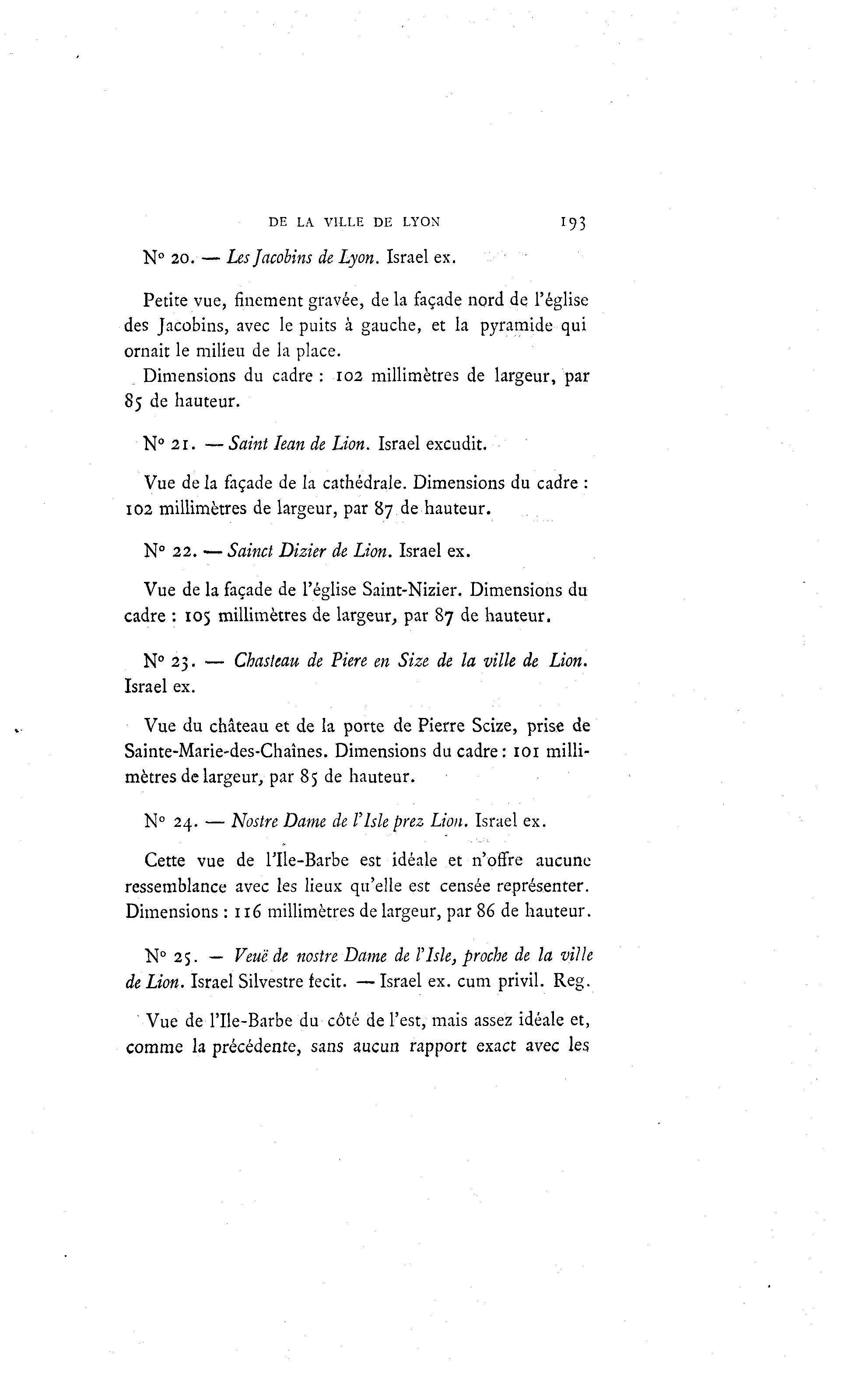 DE LA VILLE DE LYON I93 N° 20. — Les Jacobins de Lyon. Israël ex. Petite vue, finement gravée, de la façade nord de l'église des Jacobins, avec le puits à gauche, et la pyramide qui ornait le milieu de la place. Dimensions du cadre : 102 millimètres de largeur, par 85 de hauteur. N° 21. — Saint Iean de Lion. Israël excudit. Vue de la façade de la cathédrale. Dimensions du cadre : 102 millimètres de largeur, par 87 de hauteur. N° 22. — Sainct Dizier de Lion. Israël ex. Vue de la façade de l'église Saint-Nizier. Dimensions du cadre : 105 millimètres de largeur, par 87 de hauteur. N° 23. — Chasteau de Piere en Size de la ville de Lion. Israël ex. Vue du château et de la porte de Pierre Seize, prise de Sainte-Marie-des-Chaînes. Dimensions du cadre: 101 milli- mètres de largeur, par 85 de hauteur. N° 24. — Nostre Dame de Vlsle prez Lion. Israël ex. Cette vue de TIle-Barbe est idéale et n'offre aucune ressemblance avec les lieux qu'elle est censée représenter. Dimensions : 116 millimètres de largeur, par 86 de hauteur. N° 25. — Feue de nostre Dame de Tlsle, proche de la ville de Lion. Israël Silvestre fecit. — Israël ex. cum privil. Reg. Vue de l'Ile-Barbe du côté de l'est, mais assez idéale et, comme la précédente, sans aucun rapport exact avec les