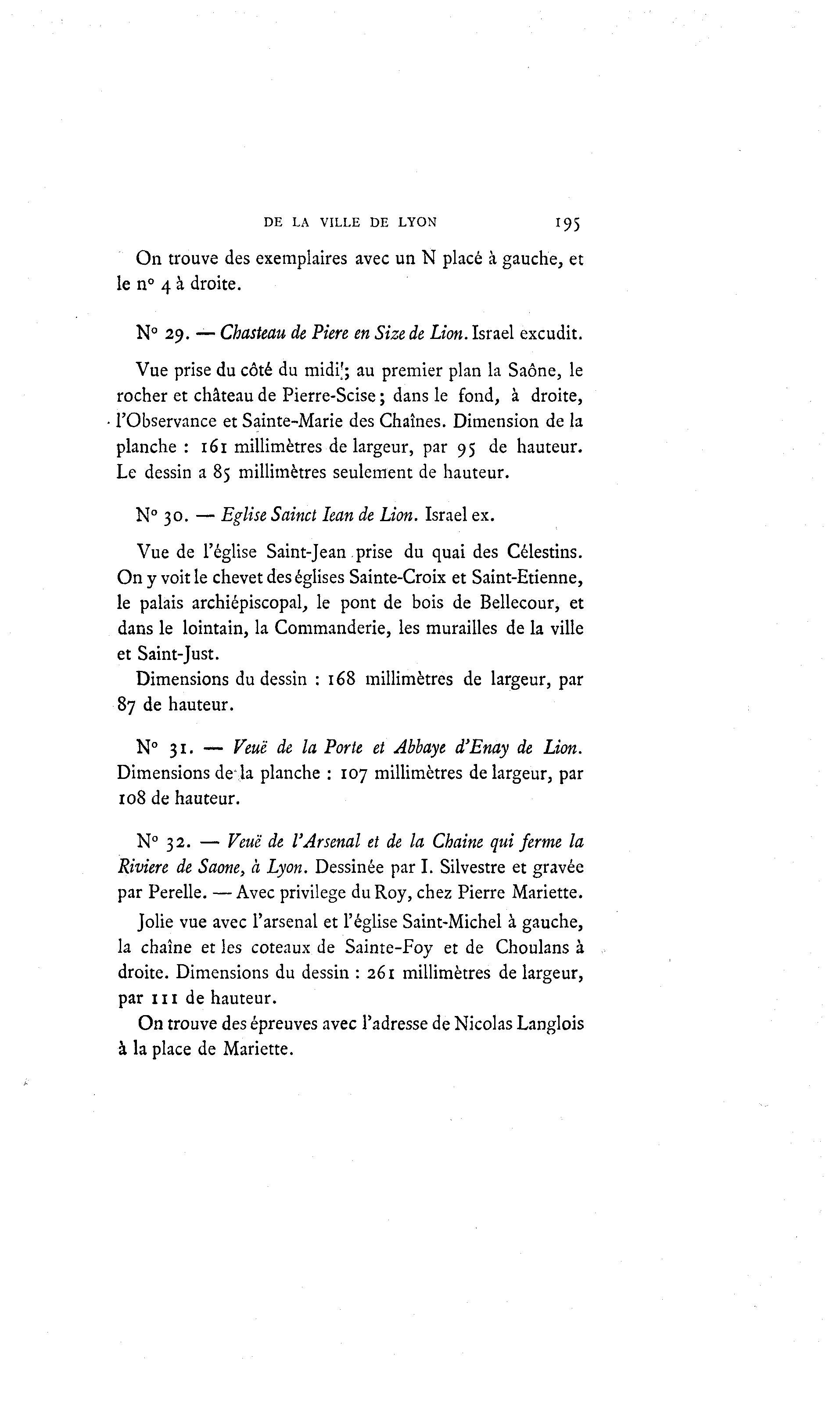 DE LA VILLE DE LYON 195 On trouve des exemplaires avec un N placé à gauche, et le n° 4 à droite. N° 29. — Chasteau de Piere en Size de Lion. Israël excudit. Vue prise du côté du midi'; au premier plan la Saône, le rocher et château de Pierre-Scise ; dans le fond, à droite, l'Observance et Sainte-Marie des Chaînes. Dimension de la planche : 161 millimètres de largeur, par 95 de hauteur. Le dessin a 85 millimètres seulement de hauteur. N° 30. — Eglise Sainct Iean de Lion. Israël ex. Vue de l'église Saint-Jean prise du quai des Célestins. On y voit le chevet des églises Sainte-Croix et Saint-Etienne, le palais archiépiscopal, le pont de bois de Bellecour, et dans le lointain, la Commanderie, les murailles de la ville et Saint-Just. Dimensions du dessin : 168 millimètres de largeur, par 87 de hauteur. N° 31. — Veut de la Porte et Abbaye d'Enay de Lion. Dimensions de" la planche : 107 millimètres de largeur, par 108 de hauteur. N° 32. — Veuë de l'Arsenal et de la Chaîne qui ferme la Rivière de Saône, à Lyon. Dessinée par I. Silvestre et gravée par Perelle. — Avec privilège du Roy, chez Pierre Mariette. Jolie vue avec l'arsenal et l'église Saint-Michel à gauche, la chaîne et les coteaux de Sainte-Foy et de Choulans à droite. Dimensions du dessin : 261 millimètres de largeur, par m de hauteur. On trouve des épreuves avec l'adresse de Nicolas Langlois à la place de Mariette.