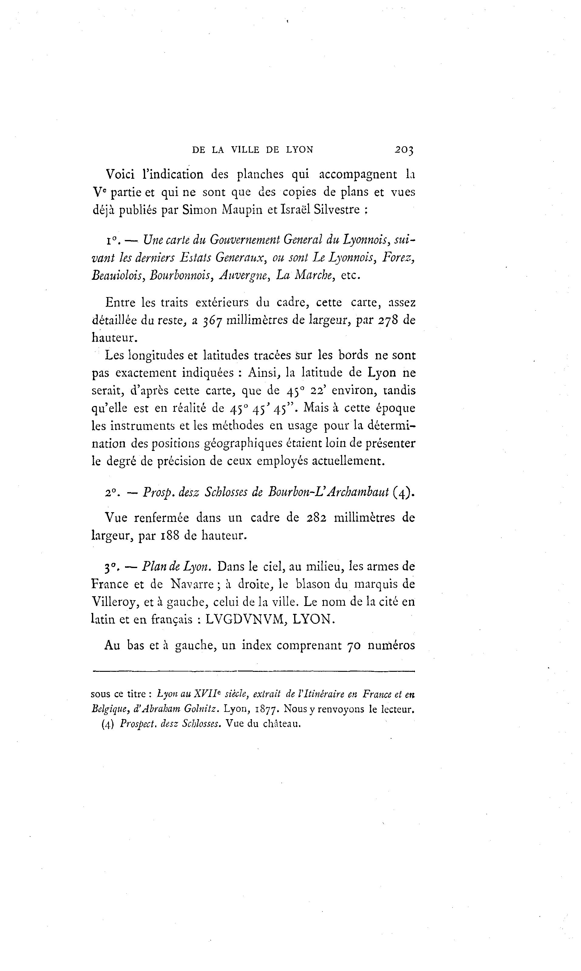 DE LA VILLE DE LYON 20$ Voici l'indication des planches qui accompagnent la V e partie et qui ne sont que des copies de plans et vues déjà publiés par Simon Maupin et Israël Silvestre : i°. — Une carte du Gouvernement General du Lyonnois, sui- vant les derniers Estais Généraux, ou sont Le Lyonnois, Forez, Beauiolois, Bourbonnois, Auvergne, La Marche, etc. Entre les traits extérieurs du cadre, cette carte, assez détaillée du reste, a 567 millimètres de largeur, par 278 de hauteur. Les longitudes et latitudes tracées sur les bords ne sont pas exactement indiquées : Ainsi, la latitude de Lyon ne serait, d'après cette carte, que de 45 0 22' environ, tandis qu'elle est en réalité de 45 0 4 5 ' 4 5 " . Mais à cette époque les instruments et les méthodes en usage pour la détermi- nation des positions géographiques étaient loin de présenter le degré de précision de ceux employés actuellement. 2 0 . — Prosp. desz Schlosses de Bourbon-V Archambaut (4). Vue renfermée dans un cadre de 282 millimètres de largeur, par 188 de hauteur. 3°, — Plan de Lyon. Dans le ciel, au milieu, les armes de France et de Navarre ; à droite, le blason du marquis de Villeroy, et à gauche, celui de la ville. Le nom de la cité en latin et en français : LVGDVNVM, LYON. Au bas et à gauche, un index comprenant 70 numéros sous ce titre : hyon au XVIIe siècle, extrait de VItinéraire en France et en Belgique, d'Abraham Golnitz. Lyon, 1877. Nous y renvoyons le lecteur. (4) Prospect, desz Schlosses. Vue du château.