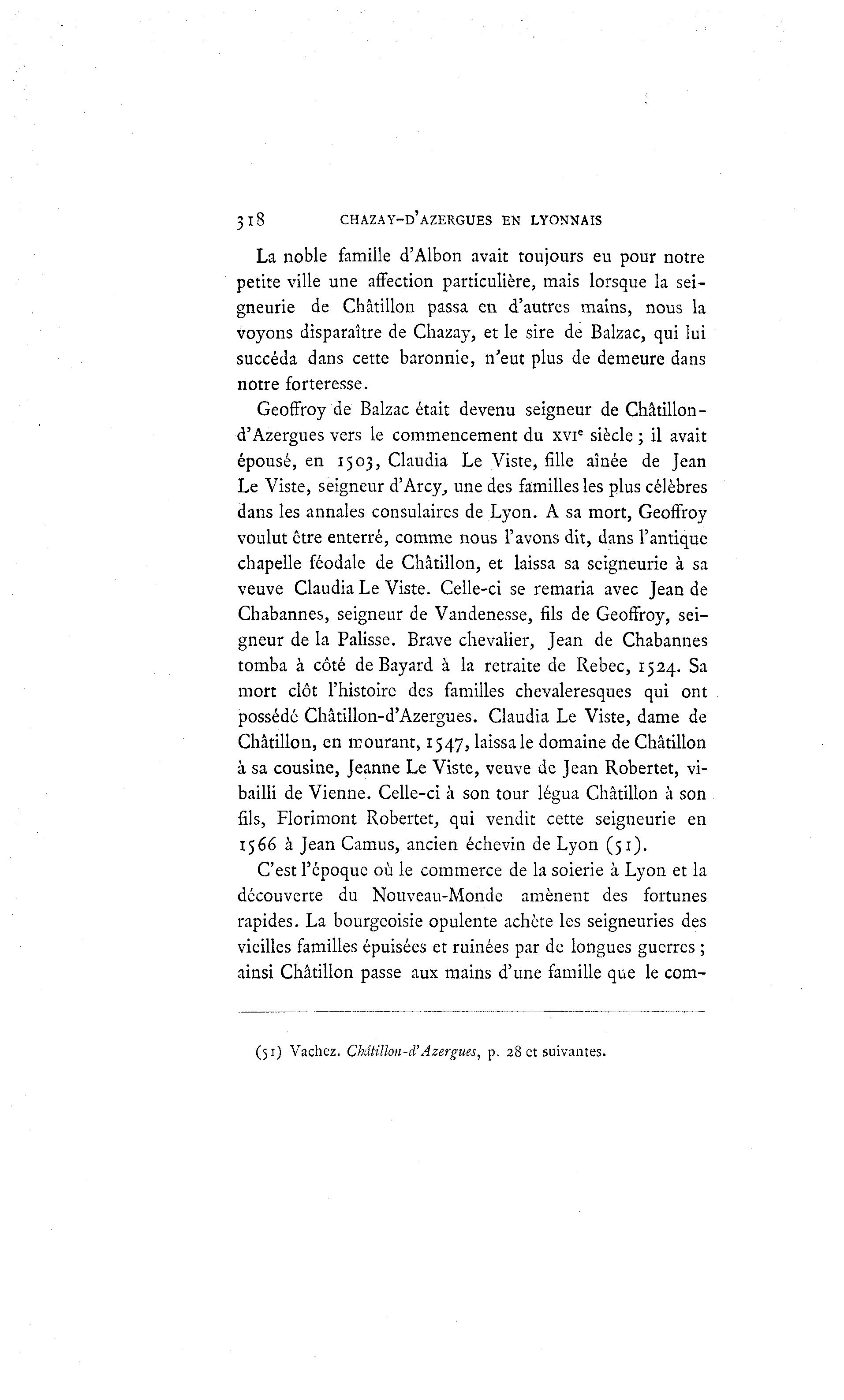 318 CHAZAY-D'AZERGUES EN LYONNAIS La noble famille d'Albon avait toujours eu pour notre petite ville une affection particulière, mais lorsque la sei- gneurie de Châtillon passa en d'autres mains, nous la voyons disparaître de Chazay, et le sire de Balzac, qui lui succéda dans cette baronnie, n'eut plus de demeure dans notre forteresse. Geoffroy de Balzac était devenu seigneur de Châtillon - d'Azergues vers le commencement du xvie siècle ; il avait épousé, en 1503, Claudia Le Viste, fille aînée de Jean Le Viste, seigneur d'Arcy, une des familles les plus célèbres dans les annales consulaires de Lyon. A sa mort, Geoffroy voulut être enterré, comme nous l'avons dit, dans l'antique chapelle féodale de Châtillon, et laissa sa seigneurie à sa veuve Claudia Le Viste. Celle-ci se remaria avec Jean de Chabannes, seigneur de Vandenesse, fils de Geoffroy, sei- gneur de la Palisse. Brave chevalier, Jean de Chabannes tomba à côté de Bayard à la retraite de Rebec, 1524. Sa mort clôt l'histoire des familles chevaleresques qui ont possédé Châtillon-d'Azergues. Claudia Le Viste, dame de Châtillon, en mourant, 1547, laissa le domaine de Châtillon à sa cousine, Jeanne Le Viste, veuve de Jean Robertet, vi- bailli de Vienne. Celle-ci à son tour légua Châtillon à son fils, Florimont Robertet, qui vendit cette seigneurie en 1566 à Jean Camus, ancien échevin de Lyon (51). C'est l'époque où le commerce de la soierie à Lyon et la découverte du Nouveau-Monde amènent des fortunes rapides. La bourgeoisie opulente achète les seigneuries des vieilles familles épuisées et ruinées par de longues guerres ; ainsi Châtillon passe aux mains d'une famille que le com- (51) Vachez. Châtillon-d'Azergues, p. 28 et suivantes.