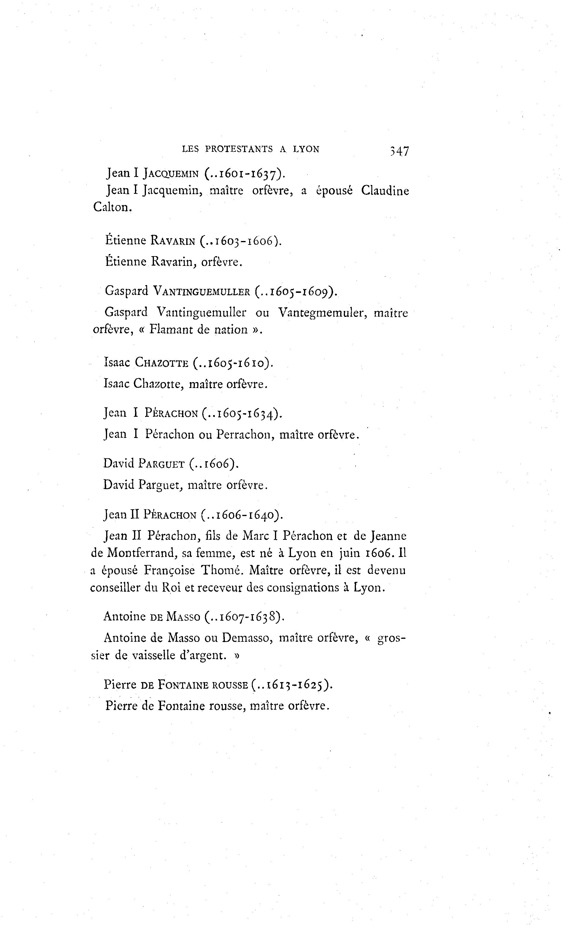LES PROTESTANTS A LYON 547 Jean I JACOTEMIN (..1601-1637). Jean I Jacquemin, maître orfèvre, a épousé Claudine Calton. Etienne RAVARIN (..1603-1606). Etienne Ravarin, orfèvre. Gaspard VANTINGUEMULLER (..1605-1609). Gaspard Vantinguemuller ou Vantegmemuler, maître orfèvre, « Flamant de nation ». Isaac CHAZOTTE (..1605-1610). Isaac Chazotte, maître orfèvre. Jean I PÉRACHON (..1605-1634). Jean I Pérachon ou Perrachon, maître orfèvre. David PARGUET (..1606). David Parguet, maître orfèvre. Jean II PÉRACHON (..1606-1640). Jean II Pérachon, fils de Marc I Pérachon et de Jeanne de Montferrand, sa femme, est né à Lyon en juin 1606. Il a épousé Françoise Thomé. Maître orfèvre, il est devenu conseiller du Roi et receveur des consignations à Lyon. Antoine DE MASSO (..1607-1638). Antoine de Masso ou Demasso, maître orfèvre, « gros- sier de vaisselle d'argent. » Pierre DE FONTAINE ROUSSE (..1613-1625). Pierre de Fontaine rousse, maître orfèvre.