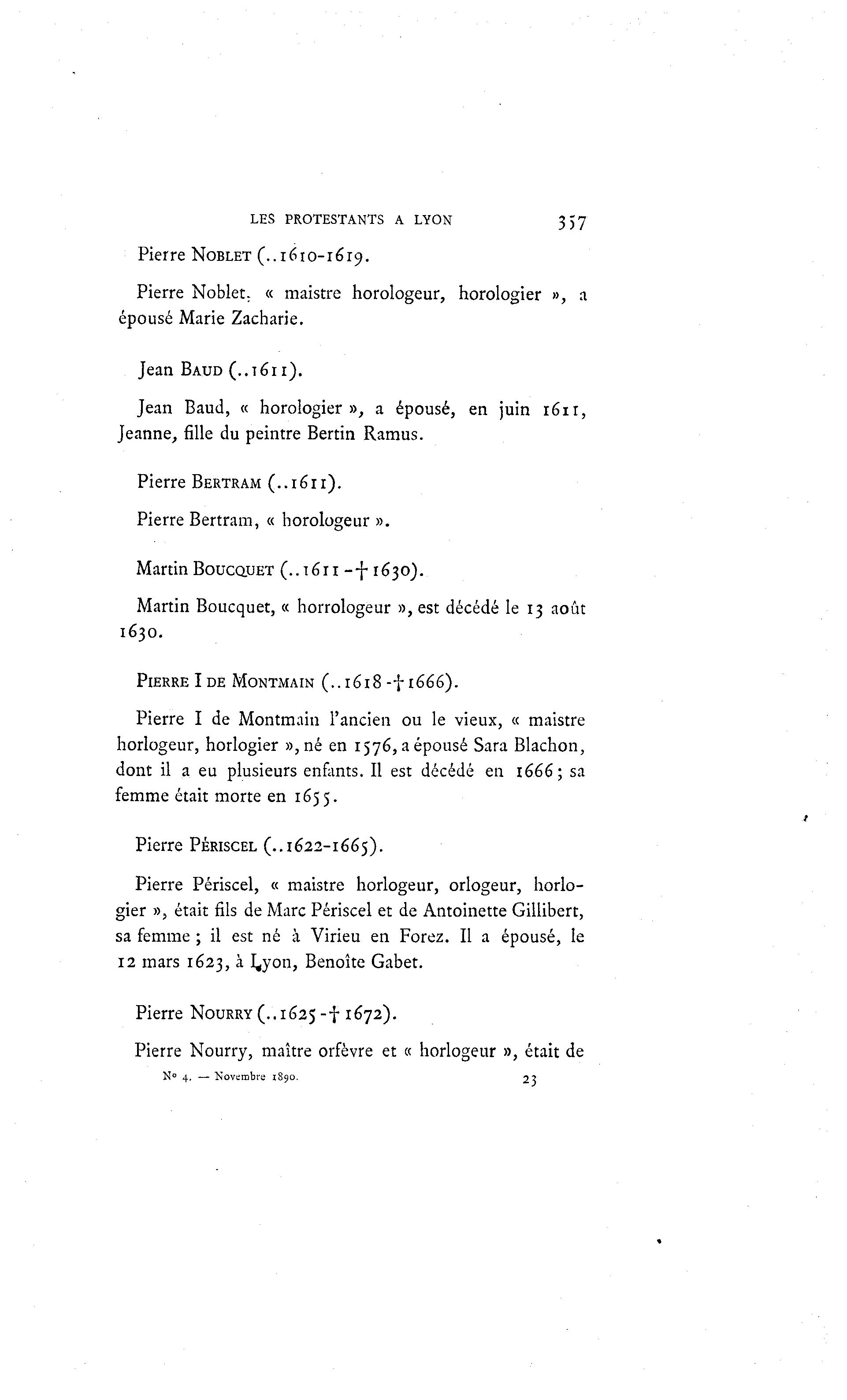 LES PROTESTANTS A LYON 357 Pierre NOBLET (..1610-1619. Pierre Noblet. « maistre horoîogeur, horologier », a épousé Marie Zacharie. Jean BAUD ( . . T 6 I I ) . Jean Baud, « horologier», a épousé, en juin r 6 n , Jeanne, fille du peintre Bertin Ramus. Pierre BERTRAM (..1611). Pierre Bertram, « horologeur ». Martin BOUCQUET (..1611 --f-1630). Martin Boucquet, « horrologeur », est décédé le 13 août 1630. PIERRE I DE MONTMAIN (..1618 -f 1666). Pierre I de Montmain l'ancien ou le vieux, « maistre horlogeur, horlogier »,né en 1576, a épousé Sara Blachon, dont il a eu plusieurs enfants. Il est décédé en 1666; sa femme était morte en 1655. Pierre PÉRISCEL (..1622-1665). Pierre Périscel, « maistre horlogeur, orlogeur, horlo- gier », était fils de Marc Périscel et de Antoinette Gillibert, sa femme ; il est né à Virieu en Forez. Il a épousé, le 12 mars 1623, à I^yon, Benoîte Gabet. Pierre NouRRY(..i625-f 1672). Pierre Nourry, maître orfèvre et « horlogeur », était de