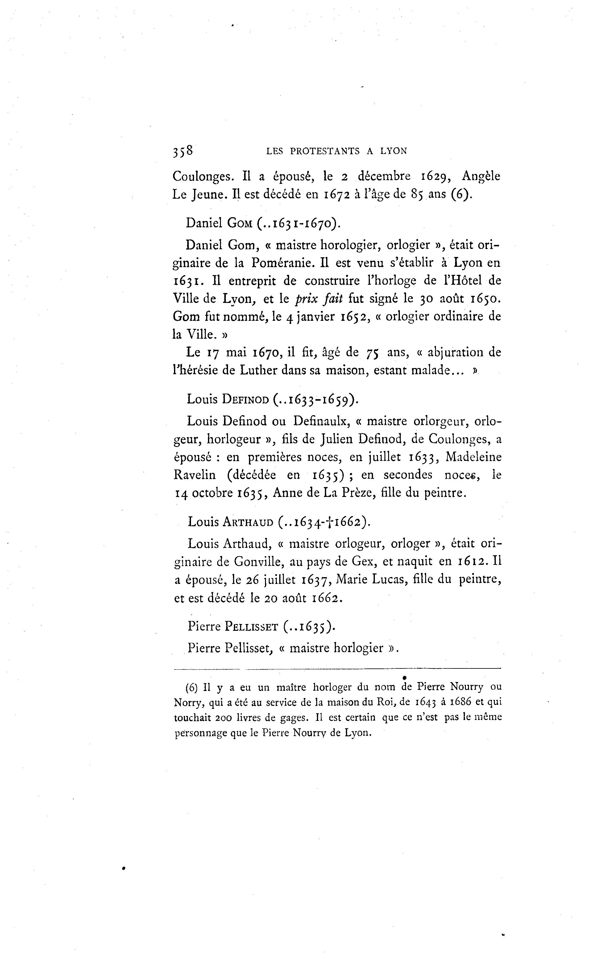 358 LES PROTESTANTS A LYON Coulonges. Il a épousé, le 2 décembre 1629, Angèle Le Jeune. Il est décédé en 1672 à l'âge de 85 ans (6). Daniel GOM (..1631-1670). Daniel Gom, « maistre horologier, orlogier », était ori- ginaire de la Poméranie. Il est venu s'établir à Lyon en 1631. Il entreprit de construire l'horloge de l'Hôtel de Ville de Lyon, et le prix fait fut signé le 30 août 1650. Gom fut nommé, le 4 janvier 1652, « orlogier ordinaire de la Ville. » Le 17 mai 1670, il fit, âgé de 75 ans, « abjuration de l'hérésie de Luther dans sa maison, estant malade... » Louis DEFINOD (..1633-1659). Louis Definod ou Definaulx, « maistre orlorgeur, orlo- geur, horlogeur », fils de Julien Definod, de Coulonges, a épousé : en premières noces, en juillet 1633, Madeleine Ravelin (décédée en 1635) ; en secondes noce«, le 14 octobre 1635, Anne de La Prèze, fille du peintre. Louis ARTHAUD (..1634-f 1662). Louis Arthaud, « maistre orlogeur, orloger », était ori- ginaire de Gonville, au pays de Gex, et naquit en 1612. Il a épousé, le 26 juillet 1637, Marie Lucas, fille du peintre, et est décédé le 20 août 1662. Pierre PELLISSET (..1635). Pierre Pellisset, « maistre horlogier ». (6) Il y a eu un maître horloger du nom de Pierre Nourry ou Norry, qui a été au service de la maison du Roi, de 1643 à 1686 et qui touchait 200 livres de gages. Il est certain que ce n'est pas le même personnage que le Pierre Nourry de Lyon.