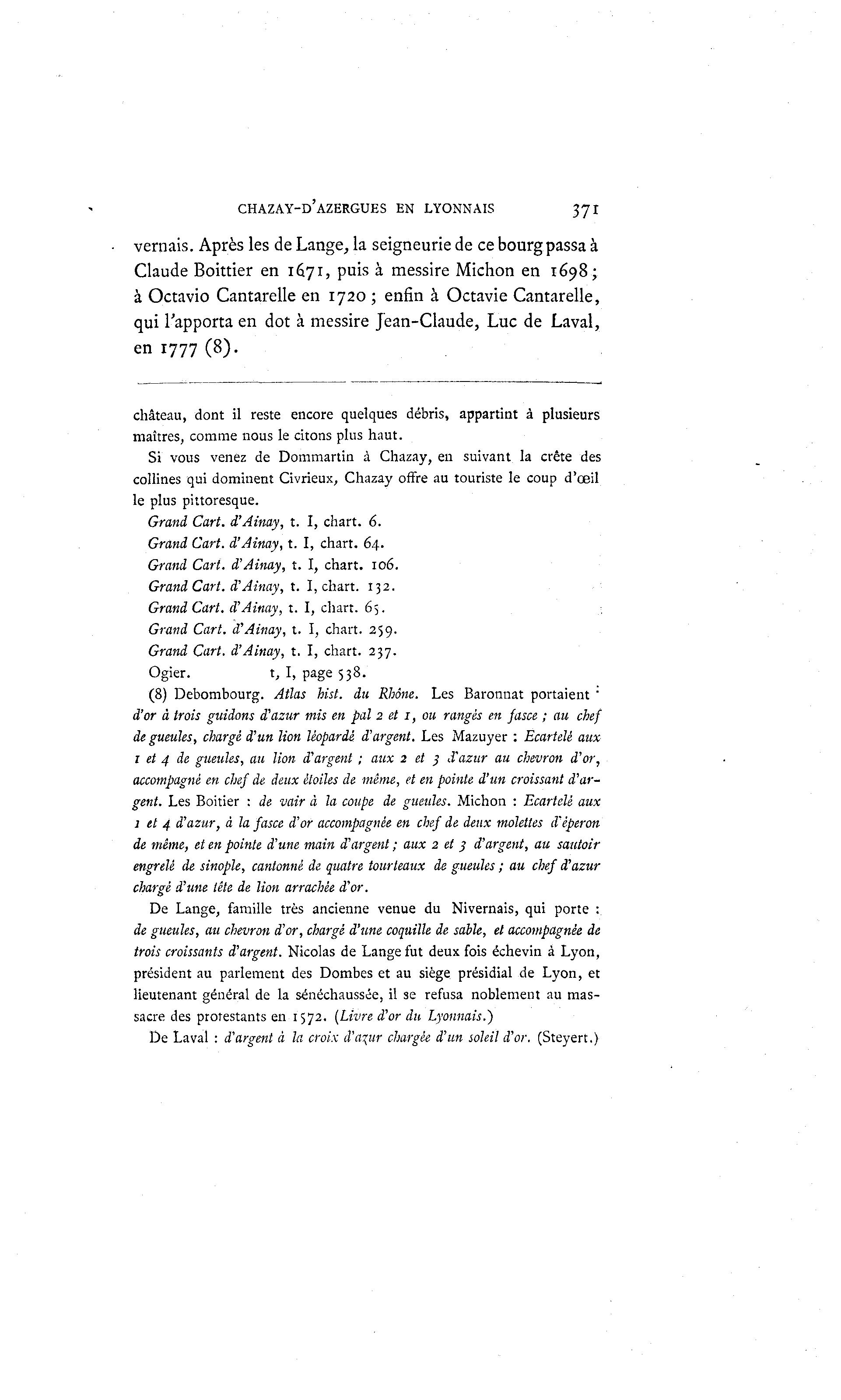 CHAZAY-D'AZERGUES EN LYONNAIS 371 vernais. Après les de Lange, la seigneurie de ce bourg passa à Claude Boittier en 1671, puis à messire Michon en 1698; à Octavio Cantarelle en 1720 ; enfin à Octavie Cantarelle, qui l'apporta en dot à messire Jean-Claude, Luc de Laval, en 1777 ( 8 ) . château, dont il reste encore quelques débris, appartint à plusieurs maîtres, comme nous le citons plus haut. Si vous venez de Dommartin à Chazay, en suivant la crête des collines qui dominent Civrieux, Chazay offre au touriste le coup d'œil le plus pittoresque. Grand Cart. d'Ainay, t. I, chart. 6. Grand Cart. d'Ainay, t. I, chart. 64. Grand Cart. d'Ainay, t. I, chart. 106. Grand Cart. d'Ainay, t. I, chart. 132. Grand Cart. d'Ainay, t. I, chart. 65. Grand Cart. d'Ainay, t. I, chart. 259. Grand Cart. d'Ainay, t. I, chart. 237. Ogier. t, I, page 538. (8) Debombourg. Atlas hist. du Rhône. Les Baronnat portaient " d'or à trois guidons d'azur mis en pal 2 et 1, ou rangés en fasce ; au chef de gueules, chargé d'un lion léopardé d'argent. Les Mazuyer : Ecartelé aux 1 et 4 de gueules, au lion d'argent ; aux 2 et 5 d'azur au chevron d'or, accompagné en chef de deux étoiles de même, et en pointe d'un croissant d'ar- gent. Les Boitier : de vair à la coupe de gueules. Michon : Ecartelé aux 1 et 4 d'azur, à la fasce d'or accompagnée en chef de deux molettes d'éperon de même, et en pointe d'une main d'argent ; aux 2 et 3 d'argent, au sautoir engrelé de sinople, cantonné de quatre tourteaux de gueules ; au chef d'azur chargé d'une tête de lion arrachée d'or. De Lange, famille très ancienne venue du Nivernais, qui porte : de gueules, au chevron d'or, chargé d'une coquille de sable, et accompagnée de trois croissants d'argent. Nicolas de Lange fut deux fois échevin à Lyon, président au parlement des Dombes et au siège présidial de Lyon, et lieutenant général de la sénéchaussée, il se refusa noblement au mas- sacre des prorestants en 1572. (Livre d'or du Lyonnais.') De Laval : d'argent à la croix d'azur chargée d'un soleil d'or. (Steyert.)