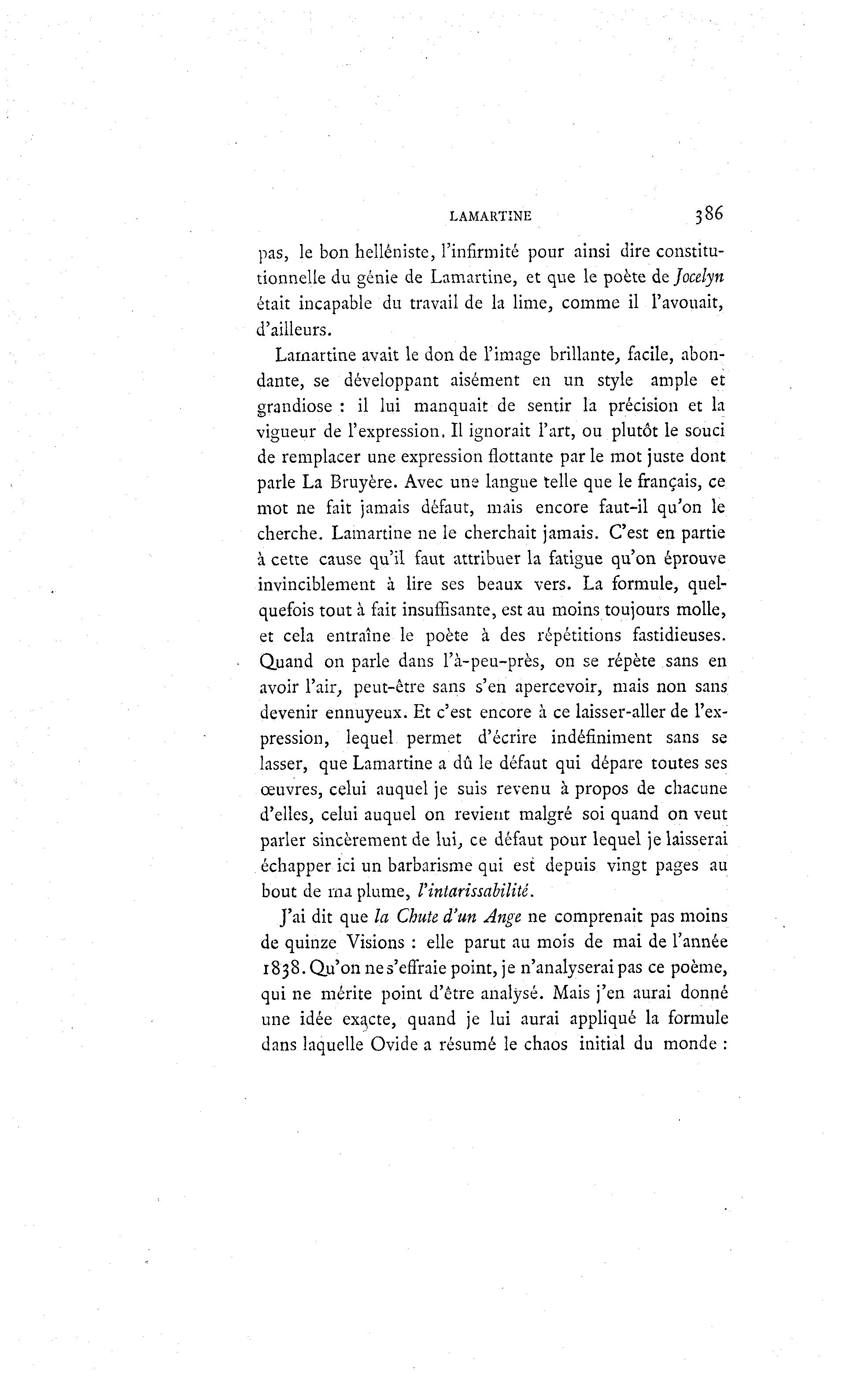 LAMARTINE 386 pas, le bon helléniste, l'infirmité pour ainsi dire constitu- tionnelle du génie de Lamartine, et que le poète de Jocelyn était incapable du travail de la lime, comme il l'avouait, d'ailleurs. Lamartine avait le don de l'image brillante, facile, abon- dante, se développant aisément en un style ample et grandiose : il lui manquait de sentir la précision et la vigueur de l'expression, Il ignorait l'art, ou plutôt le souci de remplacer une expression flottante par le mot juste dont parle La Bruyère. Avec une langue telle que le français, ce mot ne fait jamais défaut, mais encore faut-il qu'on le cherche. Lamartine ne le cherchait jamais. C'est en partie à cette cause qu'il faut attribuer la fatigue qu'on éprouve invinciblement à lire ses beaux vers. La formule, quel- quefois tout à fait insuffisante, est au moins toujours molle, et cela entraîne le poète à des répétitions fastidieuses. Quand on parle dans l'à -peu-près, on se répète sans en avoir l'air, peut-être sans s'en apercevoir, mais non sans devenir ennuyeux. Et c'est encore à ce laisser-aller de l'ex- pression, lequel permet d'écrire indéfiniment sans se lasser, que Lamartine a dû le défaut qui dépare toutes ses œuvres, celui auquel je suis revenu à propos de chacune d'elles, celui auquel on revient malgré soi quand on veut parler sincèrement de lui, ce défaut pour lequel je laisserai échapper ici un barbarisme qui est depuis vingt pages au bout de ma plume, l'intarissabilité. J'ai dit que la Chute d'un Ange ne comprenait pas moins de quinze Visions : elle parut au mois de mai de l'année 1838. Qu'on ne s'effraie point, je n'analyserai pas ce poème, qui ne mérite point d'être analysé. Mais j'en aurai donné une idée exacte, quand je lui aurai appliqué la formule dans laquelle Ovide a résumé le chaos initial du monde :