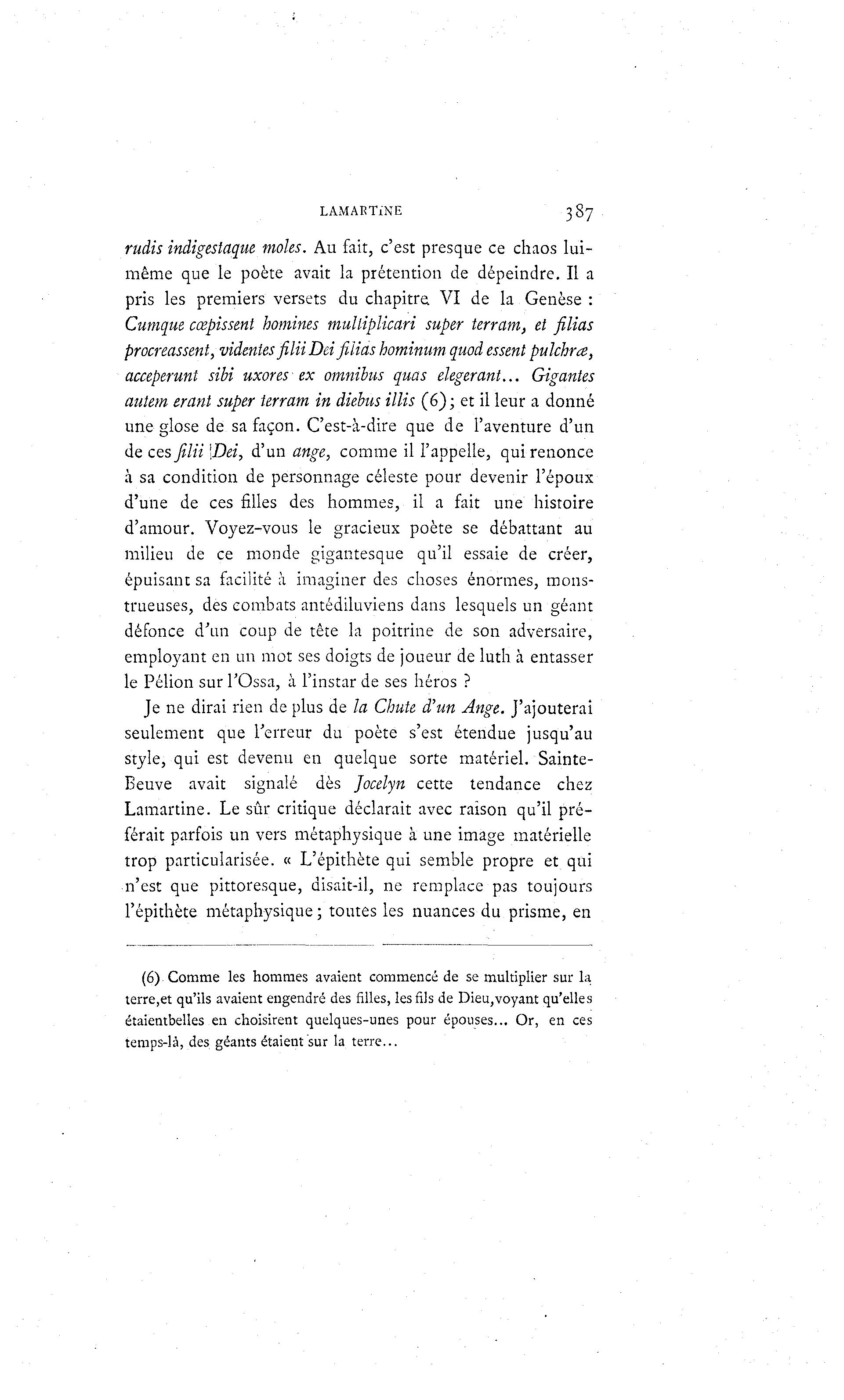 LAMAKTiNE 387 ruais indigestaque moles. Au fait, c'est presque ce chaos lui- même que le poète avait la prétention de dépeindre. Il a pris les premiers versets du chapitre VI de la Genèse : Cumque cœpissent homines mulliplicari super terram, et filias procréassent, videntesfiliiDei filias hominum quod essent pulchra, acceperunt sibi uxores ex omnibus quas elegerant... Gigantes autem erant super terram in diebus illis ( 6 ) ; et il leur a donné une glose de sa façon. C'est-à -dire que de l'aventure d'un de ces filii \Dei, d'un ange, comme il l'appelle, qui renonce à sa condition de personnage céleste pour devenir l'époux d'une de ces filles des hommes, il a fait une histoire d'amour. Voyez-vous le gracieux poète se débattant au milieu de ce monde gigantesque qu'il essaie de créer, épuisant sa facilité à imaginer des choses énormes, mons- trueuses, des combats antédiluviens dans lesquels un géant défonce d'un coup de tête la poitrine de son adversaire, employant en un mot ses doigts de joueur de luth à entasser le Pélion sur l'Ossa, à l'instar de ses héros ? Je ne dirai rien de plus de la Chute d'un Ange. J'ajouterai seulement que Terreur du poète s'est étendue jusqu'au style, qui est devenu en quelque sorte matériel. Sainte- Beuve avait signalé dès Jocelyn cette tendance chez Lamartine. Le sûr critique déclarait avec raison qu'il pré- férait parfois un vers métaphysique à une image matérielle trop particularisée. « L'épithète qui semble propre et qui n'est que pittoresque, disait-il, ne remplace pas toujours l'épithète métaphysique ; toutes les nuances du prisme, en (6) Comme les hommes avaient commencé de se multiplier sur la terre,et qu'ils avaient engendré des filles, lesfilsde Dieu,voyant qu'elles étaientbelles en choisirent quelques-unes pour épouses... Or, en ces temps-là , des géants étaient sur la terre...