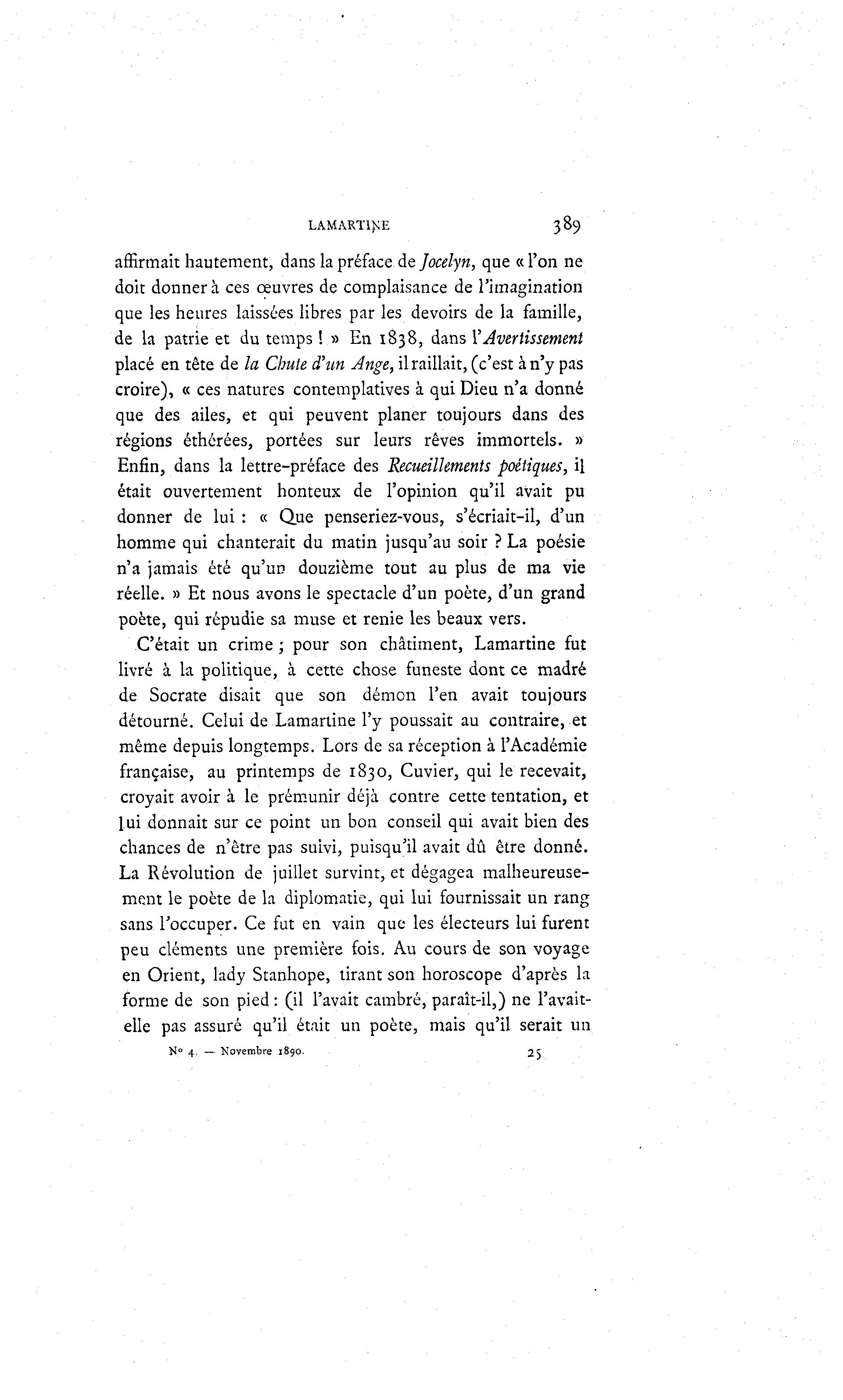LAMARTINE 389 affirmait hautement, dans la préface de Jocelyn, que «l'on ne doit donner à ces œuvres de complaisance de l'imagination que les heures laissées libres par les devoirs de la famille, de la patrie et du temps ! » En 1838, dans Y Avertissement placé en tête de la Chute d'un Ange, il raillait, (c'est à n'y pas croire), « ces natures contemplatives à qui Dieu n'a donné que des ailes, et qui peuvent planer toujours dans des régions éthérées, portées sur leurs rêves immortels. » Enfin, dans la lettre-préface des Recueillements poétiques, il était ouvertement honteux de l'opinion qu'il avait pu donner de lui : « Que penseriez-vous, s'écriait-il, d'un homme qui chanterait du matin jusqu'au soir ? La poésie n'a jamais été qu'un douzième tout au plus de ma vie réelle. » Et nous avons le spectacle d'un poète, d'un grand poète, qui répudie sa muse et renie les beaux vers. C'était un crime ; pour son châtiment, Lamartine fut livré à la politique, à cette chose funeste dont ce madré de Socrate disait que son démon l'en avait toujours détourné. Celui de Lamartine l'y poussait au contraire, et même depuis longtemps. Lors de sa réception à l'Académie française, au printemps de 1830, Cuvier, qui le recevait, croyait avoir à le prémunir déjà contre cette tentation, et lui donnait sur ce point un bon conseil qui avait bien des chances de n'être pas suivi, puisqu'il avait dû être donné. La Révolution de juillet survint, et dégagea malheureuse- ment le poète de la diplomatie, qui lui fournissait un rang sans l'occuper. Ce fut en vain que les électeurs lui furent peu cléments une première fois. Au cours de son voyage en Orient, lady Stanhope, tirant son horoscope d'après la forme de son pied : (il l'avait cambré, paraît-il,) ne l'avait- elle pas assuré qu'il était un poète, mais qu'il serait un K° 4. — Novembre 1890. 2S