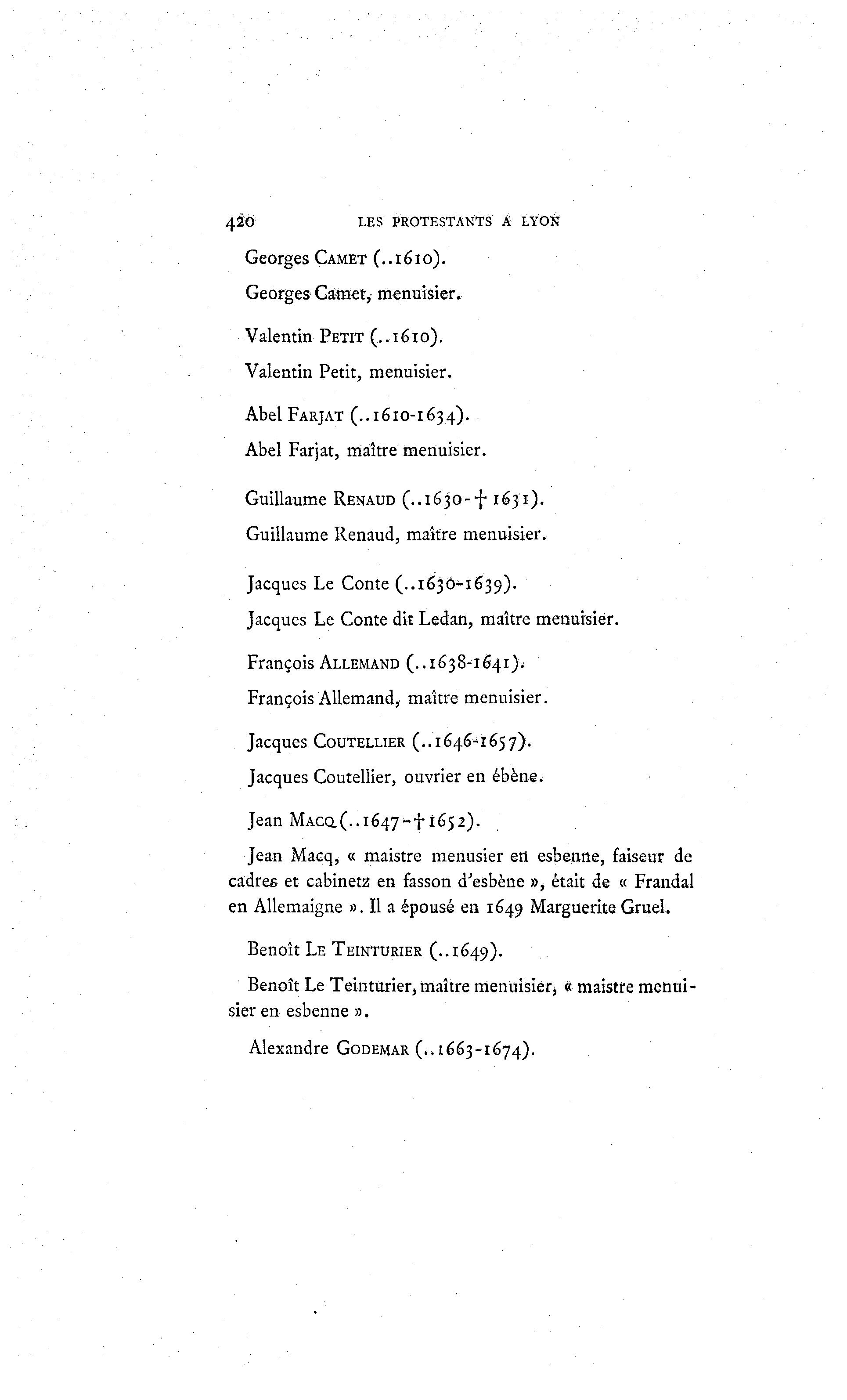 420 LES PROTESTANTS A LYON Georges CAMET (..1610). Georges Carnet, menuisier. Valentin PETIT (..1610). Valentin Petit, menuisier. Abel FARJAT (..1610-1634). Abel Farjat, maître menuisier. Guillaume RENAUD (..1630--^ 1631). Guillaume Renaud, maître menuisier. Jacques Le Conte (..1630-1639). Jacques Le Conte dit Ledan, maître menuisier. François ALLEMAND (. .1638-1641). François Allemand, maître menuisier. Jacques COUTELLIER (..1646-1657). Jacques Coutellier, ouvrier en ébène. Jean M A c a ( . . i 6 4 7 - f i 6 5 2 ) . Jean Macq, « maistre menusier en esbenne, faiseur de cadres et cabinetz en fasson d'esbène », était de « Frandal en Allemaigne ». Il a épousé en 1649 Marguerite Gruel. Benoît LE TEINTURIER (..1649). Benoît Le Teinturier, maître menuisier, « maistre menui- sier en esbenne ». Alexandre GODEMAR (,.1663-1674).