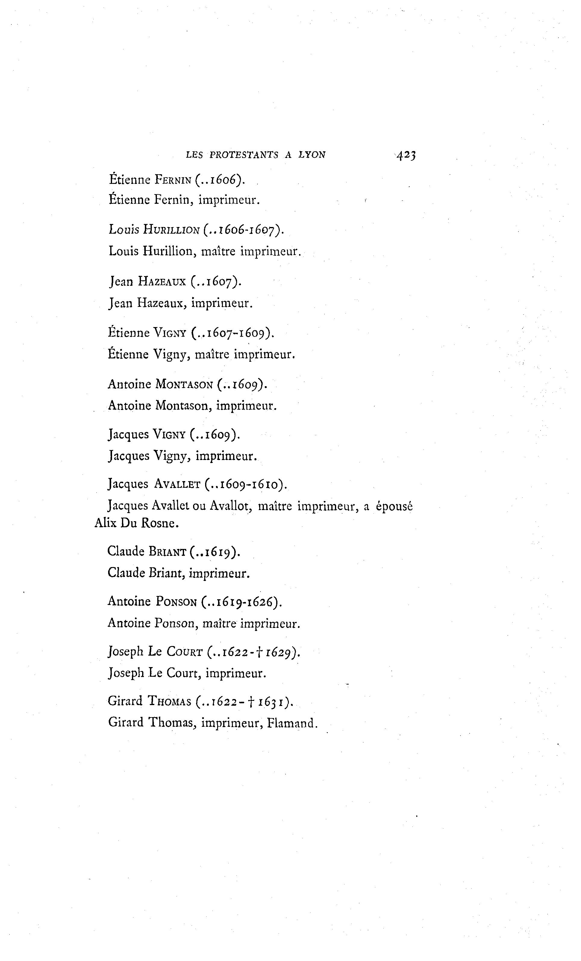 LES PROTESTANTS A LYON 423 Etienne FERNIN (..1606). Etienne Fernin, imprimeur. Louis HURILLION (..1606-1607). Louis Hurillion, maître imprimeur. Jean HAZEAUX (..1607). Jean Hazeaux, imprimeur. Etienne VIGNY (..1607-1609). Etienne Vigny, maître imprimeur. Antoine MONTASON (..1609). Antoine Montason, imprimeur. Jacques VIGNY (..1609). Jacques Vigny, imprimeur. Jacques AVALLET (..1609-1610). Jacques Avallet ou Avallot, maître imprimeur, a épousé Alix Du Rosne. Claude BRIANT(..1619). Claude Briant, imprimeur. Antoine PONSON (..1619-1626). Antoine Ponson, maître imprimeur. Joseph Le COURT (.. 1622-f 1629). Joseph Le Court, imprimeur. Girard THOMAS ( . . 1 6 2 2 - 1 1 6 3 1 ) . Girard Thomas, imprimeur, Flamand.