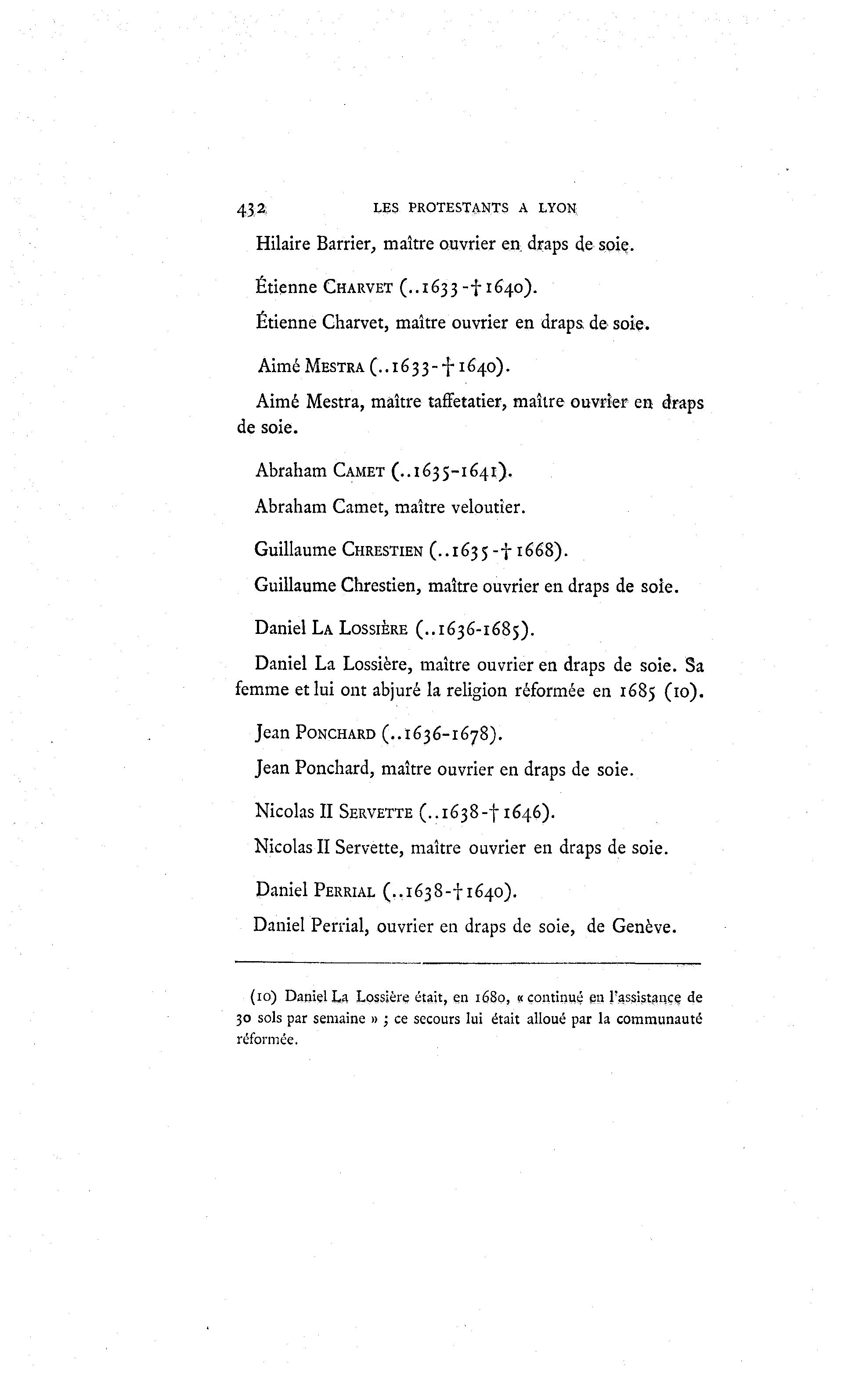 432; LES PROTESTANTS A LYON Hilaire Barrier, maître ouvrier en draps de soiç. Etienne CHARVET (..1633-f 1640). Etienne Charvet, maître ouvrier en draps de soie. Aimé MESTRA (.. 16 3 3 - f 1640). Aimé Mestra, maître taffetatier, maître ouvrier en draps de soie. Abraham CAMET (..1635-1641). Abraham Carnet, maître veloutter. Guillaume CHRESTIEN (..1635 -f 1668). Guillaume Chrestien, maître ouvrier en draps de soie. Daniel LA LOSSIÈRE (..1636-1685). Daniel La Lossière, maître ouvrier en draps de soie. Sa femme et lui ont abjuré la religion réformée en 1685 (10). Jean PONCHARD (..1636-1678). Jean Ponchard, maître ouvrier en draps de soie. Nicolas II SERVETTE (..1638-11646). Nicolas II Servette, maître ouvrier en draps de soie. Daniel PERRIAL (..1638-1-1640). Daniel Perrial, ouvrier en draps de soie, de Genève. (10) Daniel La Lossière était, en 1680, «continué en l'assistance, de 30 sols par semaine » ; ce secours lui était alloué par la communauté réformée.