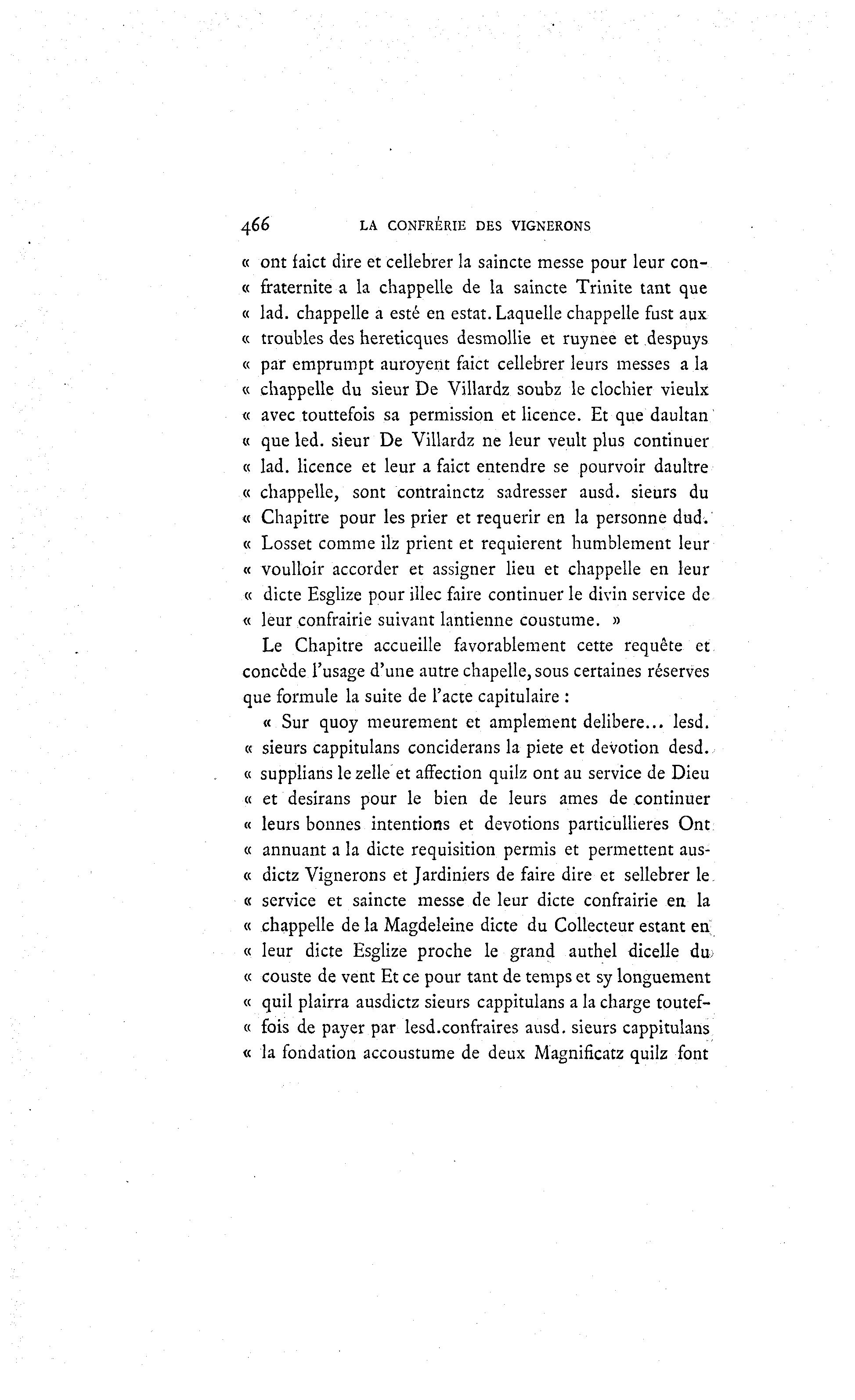 466 LA CONFRÉRIE DES VIGNERONS « ont faict dire et cellebrer la saincte messe pour leur con- « fraternité a la chappelle de la saincte Trinité tant que « lad. chappelle a esté en estât. Laquelle chappelle fust aux « troubles des hereticques desmollie et ruynee et despuys « par emprumpt auroyent faict cellebrer leurs messes a la « chappelle du sieur De Villardz soubz le clochier vieulx « avec touttefois sa permission et licence. Et que daultan « que led. sieur De Villardz ne leur veult plus continuer « lad. licence et leur a faict entendre se pourvoir daultre « chappelle, sont contrainctz sadresser ausd. sieurs du « Chapitre pour les prier et requérir en la personne dud. « Losset comme ilz prient et requièrent humblement leur « voulloir accorder et assigner lieu et chappelle en leur « dicte Esglize pour illec faire continuer le divin service de « leur confrairie suivant lantienne coustume. » Le Chapitre accueille favorablement cette requête et concède l'usage d'une autre chapelle, sous certaines réserves que formule la suite de l'acte capitulaire : « Sur quoy meurement et amplement délibère... lesd. « sieurs cappitulans conciderans la pieté et dévotion desd. « supplians le zelle et affection quilz ont au service de Dieu « et desirans pour le bien de leurs âmes de continuer « leurs bonnes intentions et dévotions particullieres Ont « annuant a la dicte réquisition permis et permettent aus- « dictz Vignerons et Jardiniers de faire dire et sellebrer le « service et saincte messe de leur dicte confrairie en la « chappelle de la Magdeleine dicte du Collecteur estant en « leur dicte Esglize proche le grand authel dicelle du; « couste de vent Et ce pour tant de temps et sy longuement « quil plairra ausdictz sieurs cappitulans a la charge toutef- « fois de payer par lesd.confraires ausd. sieurs cappitulans « la fondation accoustume de deux Magnificatz quilz font