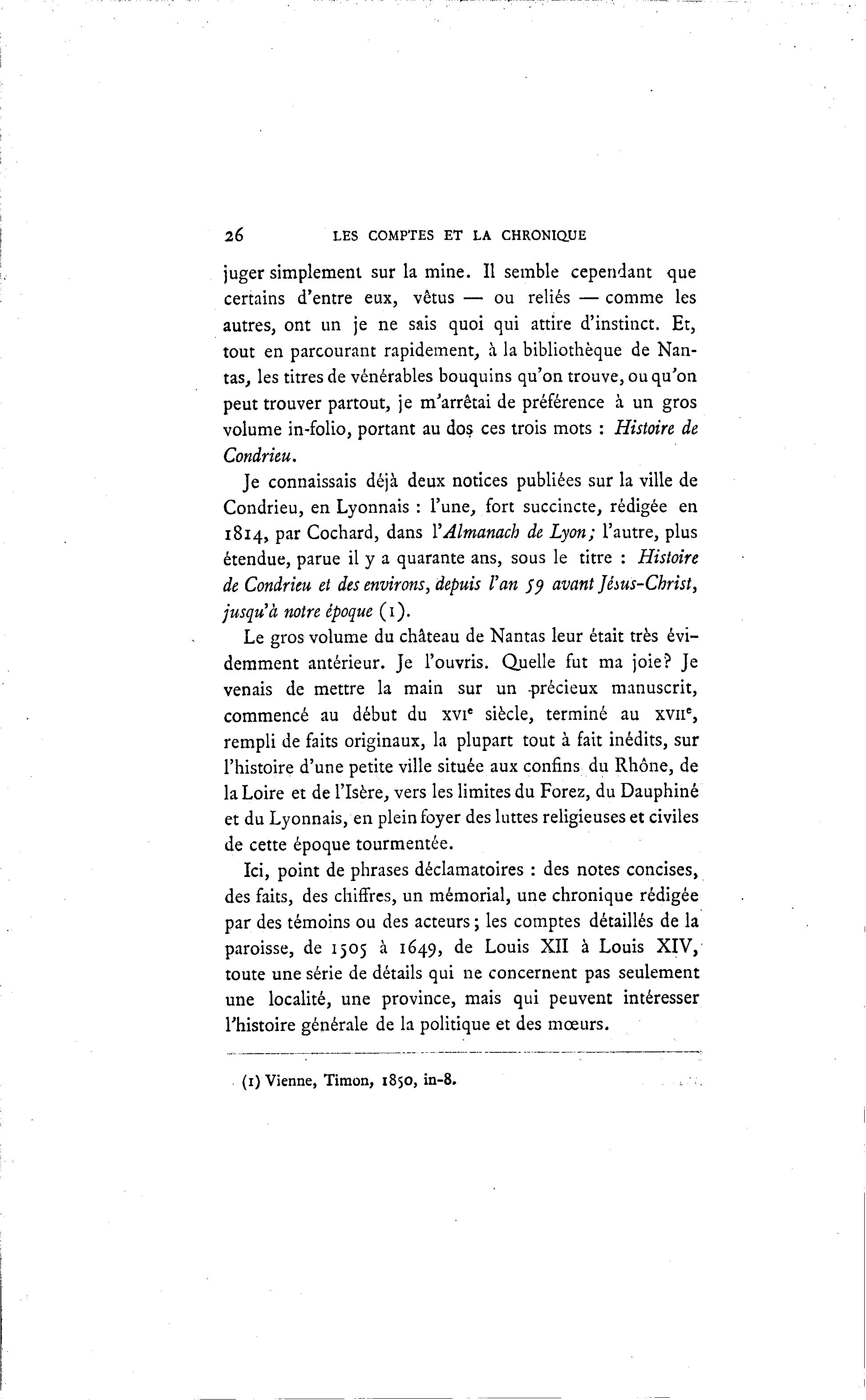 26 LES COMPTES ET LA CHRONIQUE juger simplement sur la mine. Il semble cependant que certains d'entre eux, vêtus — ou reliés — comme les autres, ont un je ne sais quoi qui attire d'instinct. Et, tout en parcourant rapidement, à la bibliothèque de Nan- tas, les titres de vénérables bouquins qu'on trouve, ou qu'on peut trouver partout, je m'arrêtai de préférence à un gros volume in-folio, portant au dos ces trois mots : Histoire de Condrieu. Je connaissais déjà deux notices publiées sur la ville de Condrieu, en Lyonnais : l'une, fort succincte, rédigée en 1814, par Cochard, dans YAlmanach de Lyon; l'autre, plus étendue, parue il y a quarante ans, sous le titre : Histoire de Condrieu et des environs, depuis Van S9 avant Jésus-Christ, jusqu'à notre époque (1). Le gros volume du château de Nantas leur était très évi- demment antérieur. Je l'ouvris. Quelle fut ma joie? Je venais de mettre la main sur un .précieux manuscrit, commencé au début du xvi' siècle, terminé au xvn% rempli de faits originaux, la plupart tout à fait inédits, sur l'histoire d'une petite ville située aux confins du Rhône, de la Loire et de l'Isère, vers les limites du Forez, du Dauphiné et du Lyonnais, en plein foyer des luttes religieuses et civiles de cette époque tourmentée. Ici, point de phrases déclamatoires : des notes concises, des faits, des chiffres, un mémorial, une chronique rédigée par des témoins ou des acteurs ; les comptes détaillés de la paroisse, de 1505 à 1649, de Louis XII à Louis XIV, toute une série de détails qui ne concernent pas seulement une localité, une province, mais qui peuvent intéresser l'histoire générale de la politique et des mœurs. (1) Vienne, Timon, 1850, in-8.