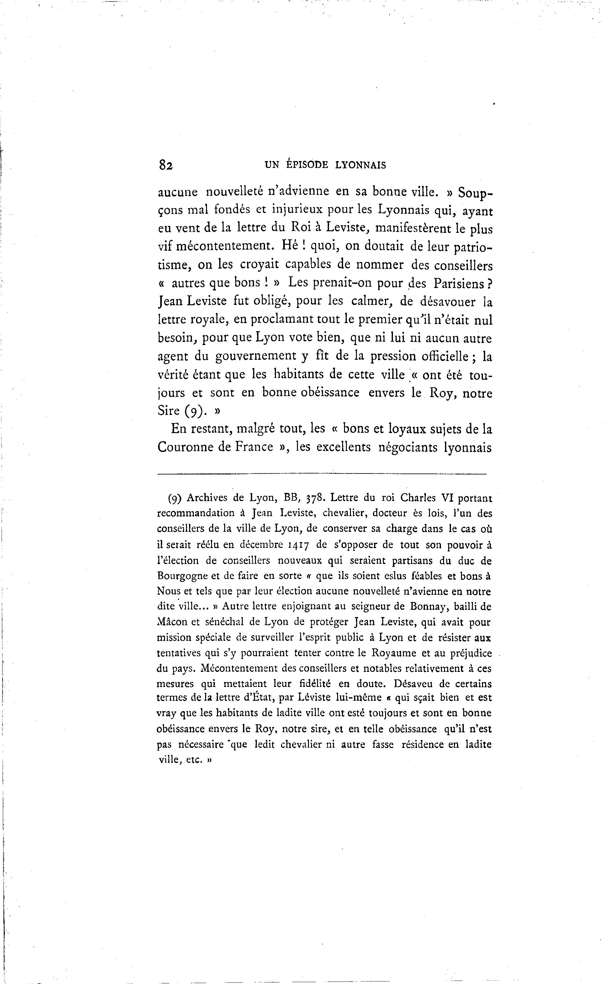 82 UN ÉPISODE LYONNAIS aucune nouvelleté n'advienne en sa bonne ville. » Soup- çons mal fondés et injurieux pour les Lyonnais qui, ayant eu vent de la lettre du Roi à Leviste, manifestèrent le plus vif mécontentement. Hé ! quoi, on doutait de leur patrio- tisme, on les croyait capables de nommer des conseillers « autres que bons ! » Les prenait-on pour des Parisiens ? Jean Leviste fut obligé, pour les calmer, de désavouer la lettre royale, en proclamant tout le premier qu'il n'était nul besoin, pour que Lyon vote bien, que ni lui ni aucun autre agent du gouvernement y fît de la pression officielle ; la vérité étant que les habitants de cette ville « ont été tou- jours et sont en bonne obéissance envers le Roy, notre Sire (9). » En restant, malgré tout, les « bons et loyaux sujets de la Couronne de France », les excellents négociants lyonnais (9) Archives de Lyon, BB, 378. Lettre du roi Charles VI portant recommandation à Jean Leviste, chevalier, docteur es lois, l'un des conseillers de la ville de Lyon, de conserver sa charge dans le cas où il serait réélu en décembre 1417 de s'opposer de tout son pouvoir à l'élection de conseillers nouveaux qui seraient partisans du duc de Bourgogne et de faire en sorte « que ils soient eslus féables et bons à Nous et tels que par leur élection aucune nouvelleté n'avienne en notre dite ville... » Autre lettre enjoignant au seigneur de Bonnay, bailli de Mâcon et sénéchal de Lyon de protéger Jean Leviste, qui avait pour mission spéciale de surveiller l'esprit public à Lyon et de résister aux tentatives qui s'y pourraient tenter contre le Royaume et au préjudice du pays. Mécontentement des conseillers et notables relativement à ces mesures qui mettaient leur fidélité en doute. Désaveu de certains termes de la lettre d'Etat, par Léviste lui-même « qui sçait bien et est vray que les habitants de ladite ville ont esté toujours et sont en bonne obéissance envers le Roy, notre sire, et en telle obéissance qu'il n'est pas nécessaire "que ledit chevalier ni autre fasse résidence en ladite ville, etc. »