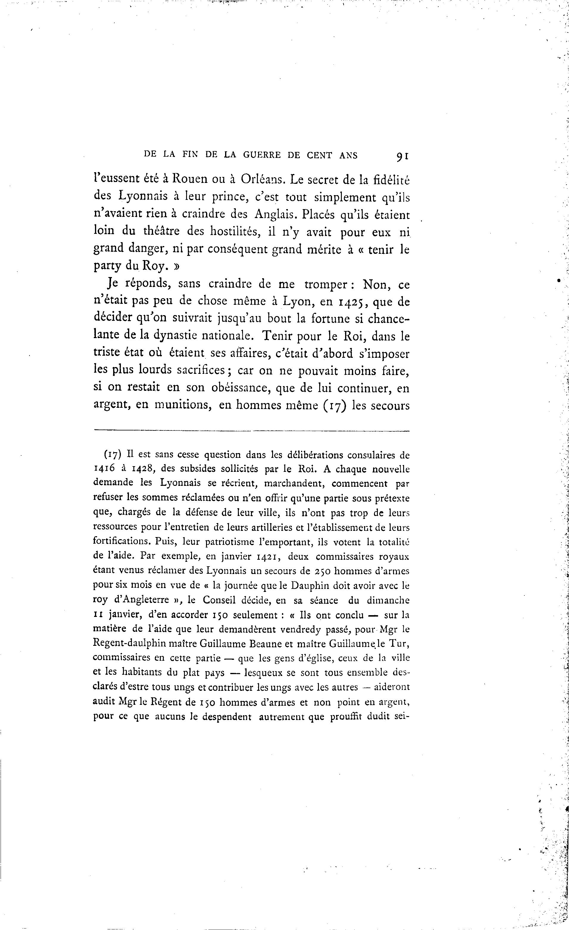 DE LA FIN DE LA GUERRE DE CENT ANS 91 l'eussent été à Rouen ou à Orléans. Le secret de la fidélité des Lyonnais à leur prince, c'est tout simplement qu'ils n'avaient rien à craindre des Anglais. Placés qu'ils étaient loin du théâtre des hostilités, il n'y avait pour eux ni grand danger, ni par conséquent grand mérite à « tenir le party du Roy. » Je réponds, sans craindre de me tromper : Non, ce n'était pas peu de chose même à Lyon, en 1425, que de décider qu'on suivrait jusqu'au bout la fortune si chance- lante de la dynastie nationale. Tenir pour le Roi, dans le triste état où étaient ses affaires, c'était d'abord s'imposer les plus lourds sacrifices ; car on ne pouvait moins faire, si on restait en son obéissance, que de lui continuer, en argent, en munitions, en hommes même (17) les secours (17) Il est sans cesse question dans les délibérations consulaires de 1416 à 1428, des subsides sollicités par le Roi. A chaque nouvelle demande les Lyonnais se récrient, marchandent, commencent par refuser les sommes réclamées ou n'en offrir qu'une partie sous prétexte que, chargés de la défense de leur ville, ils n'ont pas trop de leurs ressources pour l'entretien de leurs artilleries et l'établissement de leurs fortifications. Puis, leur patriotisme l'emportant, ils votent la totalité de l'aide. Par exemple, en janvier 1421, deux commissaires royaux étant venus réclamer des Lyonnais un secours de 250 hommes d'armes pour six mois en vue de « la journée que le Dauphin doit avoir avec le roy d'Angleterre », le Conseil décide, en sa séance du dimanche 11 janvier, d'en accorder 150 seulement : « Ils ont conclu — sur la matière de l'aide que leur demandèrent vendredy passé, pour Mgr le Regent-daulphin maître Guillaume Beaune et maître Guillaume le Tur, commissaires en cette partie — que les gens d'église, ceux de la ville et les habitants du plat pays — lesqueux se sont tous ensemble des- clarés d'estre tous ungs et contribuer les ungs avec les autres — aideront audit Mgr le Régent de 150 hommes d'armes et non point en argent, pour ce que aucuns le despendent autrement que prouffit dudit sei-