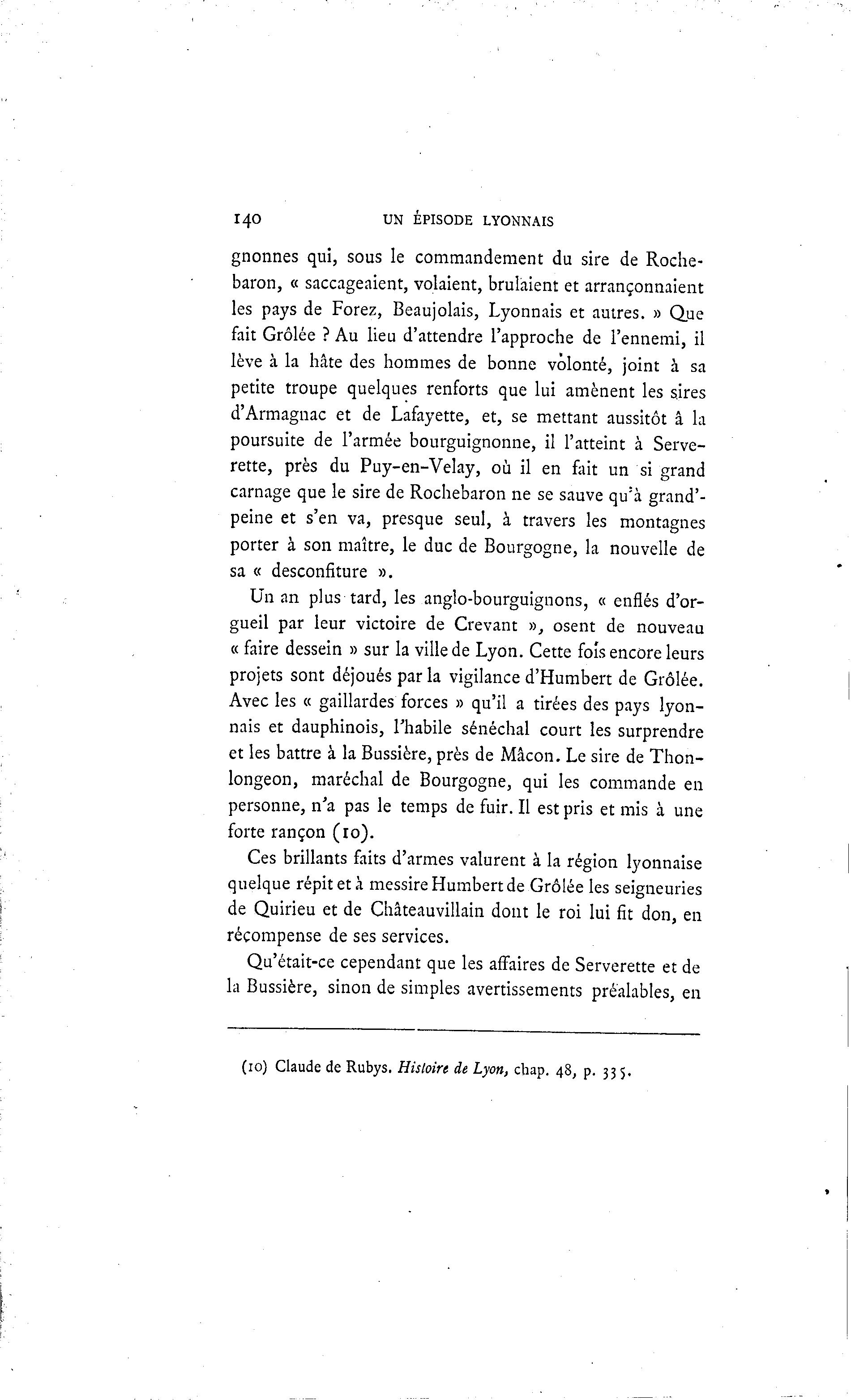 140 UN ÉPISODE LYONNAIS gnonnes qui, sous le commandement du sire de Roche- baron, « saccageaient, volaient, brûlaient et arrançonnaient les pays de Forez, Beaujolais, Lyonnais et autres. » Que fait Grôlée ? Au lieu d'attendre l'approche de l'ennemi, il lève à la hâte des hommes de bonne volonté, joint à sa petite troupe quelques renforts que lui amènent les sires d'Armagnac et de Lafayette, et, se mettant aussitôt â la poursuite de l'armée bourguignonne, il l'atteint à Serve- rette, près du Puy-en-Velay, où il en fait un si grand carnage que le sire de Rochebaron ne se sauve qu:à grand'- peine et s'en va, presque seul, à travers les montagnes porter à son maître, le duc de Bourgogne, la nouvelle de sa « desconfiture ». Un an plus tard, les anglo-bourguignons, « enflés d'or- gueil par leur victoire de Crevant », osent de nouveau « faire dessein » sur la ville de Lyon. Cette fois encore leurs projets sont déjoués par la vigilance d'Humbert de Grôlée. Avec les « gaillardes forces » qu'il a tirées des pays lyon- nais et dauphinois, l'habile sénéchal court les surprendre et les battre à la Bussière, près de Mâcon. Le sire de Thon- longeon, maréchal de Bourgogne, qui les commande en personne, n'a pas le temps de fuir. Il est pris et mis à une forte rançon (10). Ces brillants faits d'armes valurent à la région lyonnaise quelque répit et à messireHumbertde Grôlée les seigneuries de Quirieu et de Châteauvillain dont le roi lui fit don, en récompense de ses services. Qu'était-ce cependant que les affaires de Serverette et de la Bussière, sinon de simples avertissements préalables, en (10) Claude de Rubys. Histoire de Lyon, chap. 48, p. 335.
