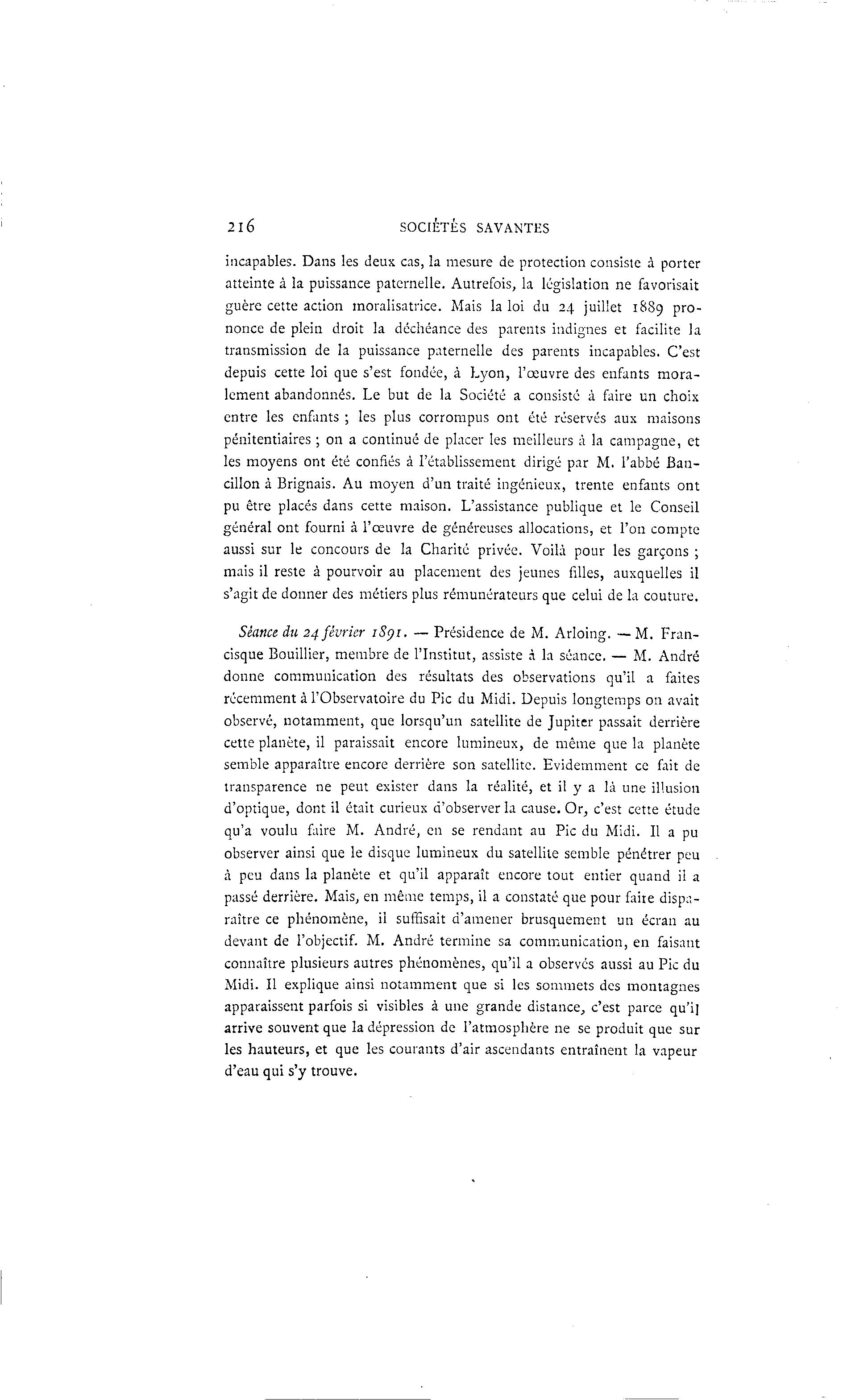 2l6 SOCIÉTÉS SAVANTES incapables. Dans les deux cas, la mesure de protection consiste à porter atteinte à la puissance paternelle. Autrefois, la législation ne favorisait guère cette action moralisatrice. Mais la loi du 24 juillet 1889 pro- nonce de plein droit la déchéance des parents indignes et facilite la transmission de la puissance paternelle des parents incapables. C'est depuis cette loi que s'est fondée, à Lyon, l'œuvre des enfants mora- lement abandonnés. Le but de la Société a consisté à faire un choix entre les enfants ; les plus corrompus ont été réservés aux maisons pénitentiaires ; on a continué de placer les meilleurs à la campagne, et les moyens ont été confiés à l'établissement dirigé par M. l'abbé Ëan- cillon à Brignais. Au moyen d'un traité ingénieux, trente enfants ont pu être placés dans cette maison. L'assistance publique et le Conseil général ont fourni à l'œuvre de généreuses allocations, et l'on compte aussi sur le concours de la Charité privée. Voilà pour les garçons ; mais il reste à pourvoir au placement des jeunes filles, auxquelles il s'agit de donner des métiers plus rémunérateurs que celui de la couture. Séance du 24 février 1891. — Présidence de M. Arloing. — M. Fran- cisque Bouillier, membre de l'Institut, assiste à la séance. — M. André donne communication des résultats des observations qu'il a faites récemment à l'Observatoire du Pic du Midi. Depuis longtemps on avait observé, notamment, que lorsqu'un satellite de Jupiter passait derrière cette planète, il paraissait encore lumineux, de même que la planète semble apparaître encore derrière son satellite. Evidemment ce fait de transparence ne peut exister dans la réalité, et il y a là une illusion d'optique, dont il était curieux d'observer la cause. Or, c'est cette étude qu'a voulu faire M. André, en se rendant au Pic du Midi. Il a pu observer ainsi que le disque lumineux du satellite semble pénétrer peu à peu dans la planète et qu'il apparaît encore tout entier quand il a passé derrière. Mais, en même temps, il a constaté que pour faire dispa- raître ce phénomène, il suffisait d'amener brusquement un écran au devant de l'objectif. M. André termine sa communication, en faisant connaître plusieurs autres phénomènes, qu'il a observés aussi au Pic du Midi. Il explique ainsi notamment que si les sommets des montagnes apparaissent parfois si visibles à une grande distance, c'est parce qu'il arrive souvent que la dépression de l'atmosphère ne se produit que sur les hauteurs, et que les courants d'air ascendants entraînent la vapeur d'eau qui s'y trouve.