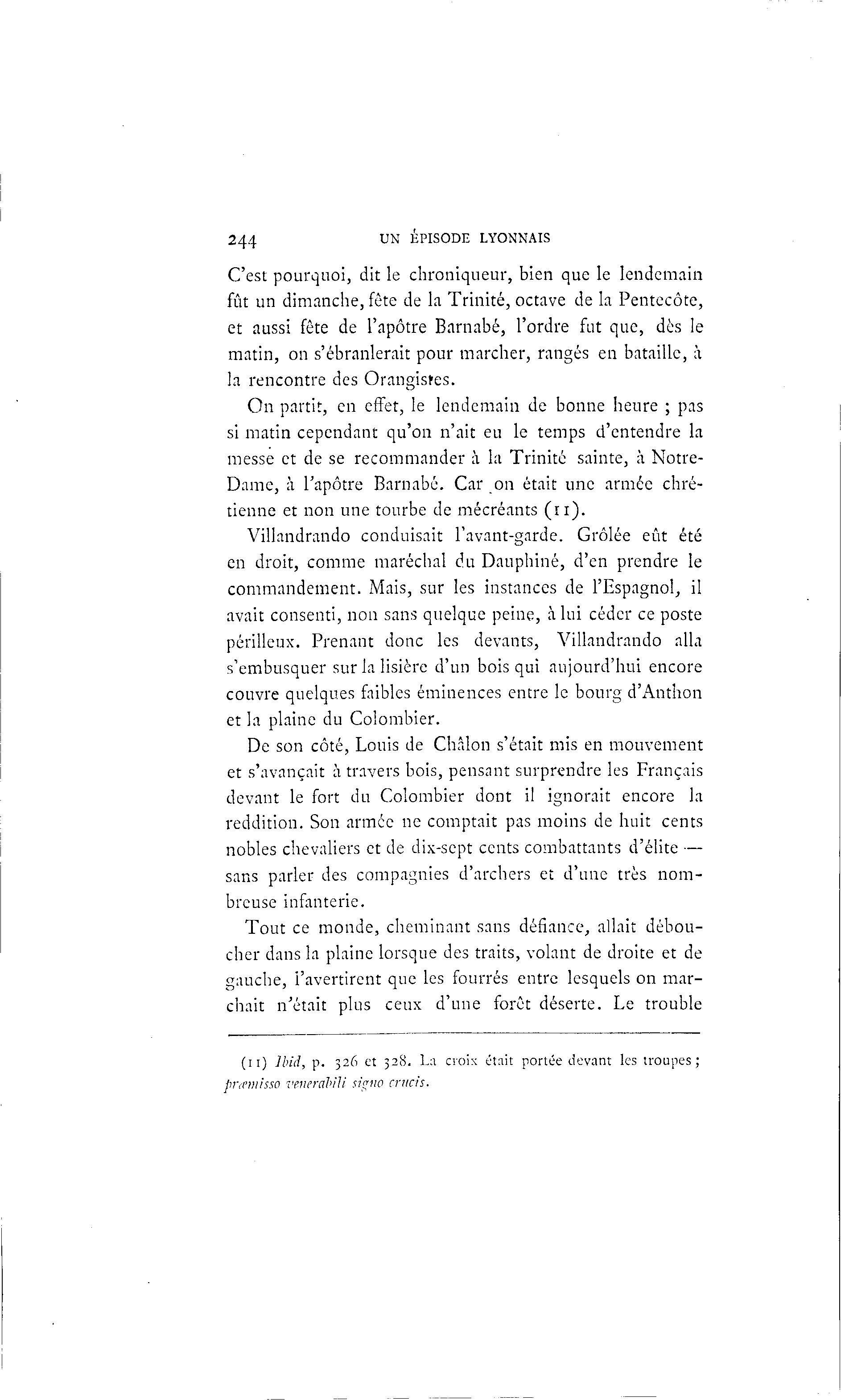 UN 244 ÉPISODE LYONNAIS C'est pourquoi, dit le chroniqueur, bien que le lendemain fût un dimanche, fête de la Trinité, octave de la Pentecôte, et aussi fête de l'apôtre Barnabe, l'ordre fut que, dès le matin, on s'ébranlerait pour marcher, rangés en bataille, à la rencontre des Orangisfes. On partit, en effet, le lendemain de bonne heure ; pas si matin cependant qu'on n'ait eu le temps d'entendre la messe et de se recommander à la Trinité sainte, à Notre- Dame, à l'apôtre Barnabe. Car on était une armée chré- tienne et non une tourbe de mécréants ( n ) . Villandrando conduisait l'avant-garde. Grôlée eût été en droit, comme maréchal du Dauphiné, d'en prendre le commandement. Mais, sur les instances de l'Espagnol, il avait consenti, non sans quelque peine, à lui céder ce poste périlleux. Prenant donc les devants, Villandrando alla s'embusquer sur la lisière d'un bois qui aujourd'hui encore couvre quelques faibles éminences entre le bourg d'Anthon et la plaine du Colombier. De son côté, Louis de Châlon s'était mis en mouvement et s'avançait à travers bois, pensant surprendre les Français devant le fort du Colombier dont il ignorait encore la reddition. Son armée ne comptait pas moins de huit cents nobles chevaliers et de dix-sept cents combattants d'élite — sans parler des compagnies d'archers et d'une très nom- breuse infanterie. Tout ce monde, cheminant sans défiance, allait débou- cher dans la plaine lorsque des traits, volant de droite et de gauche, i'avertirent que les fourrés entre lesquels on mar- chait n'était plus ceux d'une forêt déserte. Le trouble ( H ) lbid, p. 326 et 328. La croix était portée devant les troupes; pnewisso venerà l'ili sigiw cnicis.