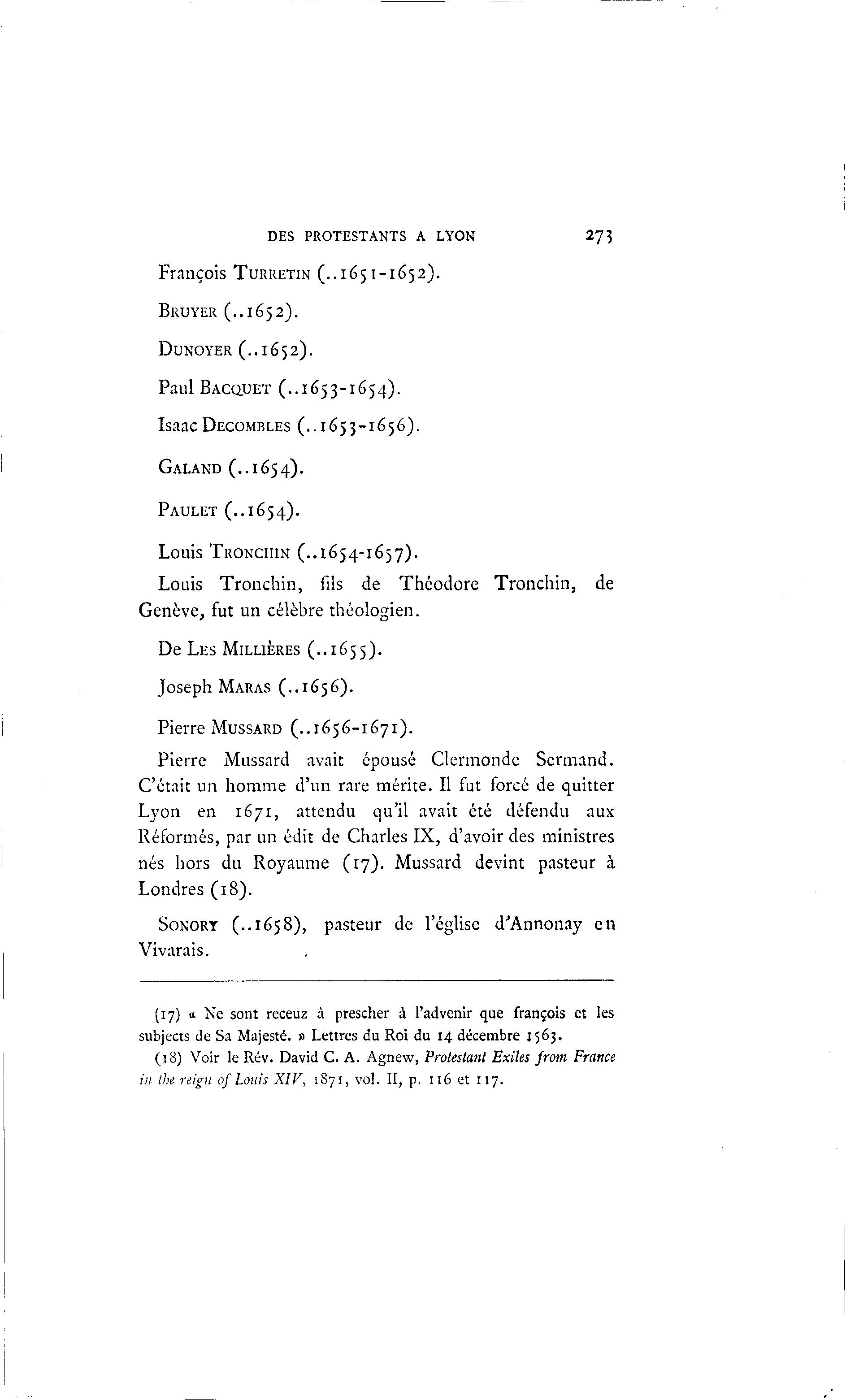 DES PROTESTANTS A LYON 273 François TURRETIN (..1651-1652). BRUYER (..1652). DlJNOYER (..1652). Paul BACQUET (..1653-1654). Isaac DECOMBLES (..1653-1656). GALAND (..1654). PAULET (..1654). Louis TRONCHIN (..1654-1657). Louis Tronchin, fils de Théodore Tronchin, de Genève, fut un célèbre théologien. De LES MILLIÈRES (..1655). Joseph MARAS (..1656). Pierre MUSSARD (..1656-1671). Pierre Mussard avait épousé Clermonde Sermand. C'était un homme d'un rare mérite. Il fut forcé de quitter Lyon en 1671, attendu qu'il avait été défendu aux Réformés, par un édit de Charles IX, d'avoir des ministres nés hors du Royaume (17). Mussard devint pasteur à Londres (18). SONORY (..1658), pasteur de l'église d'Annonay en Vivarais. (17) u Ne sont receuz à prescher à Padvenir que françois et les subjects de Sa Majesté. » Lettres du Roi du 14 décembre 1563. (18) Voir le Rév. David C. A. Agnew, Protestant Exiles from France in the reign of Louis XIV, 1871, vol. II, p. 116 et 117.