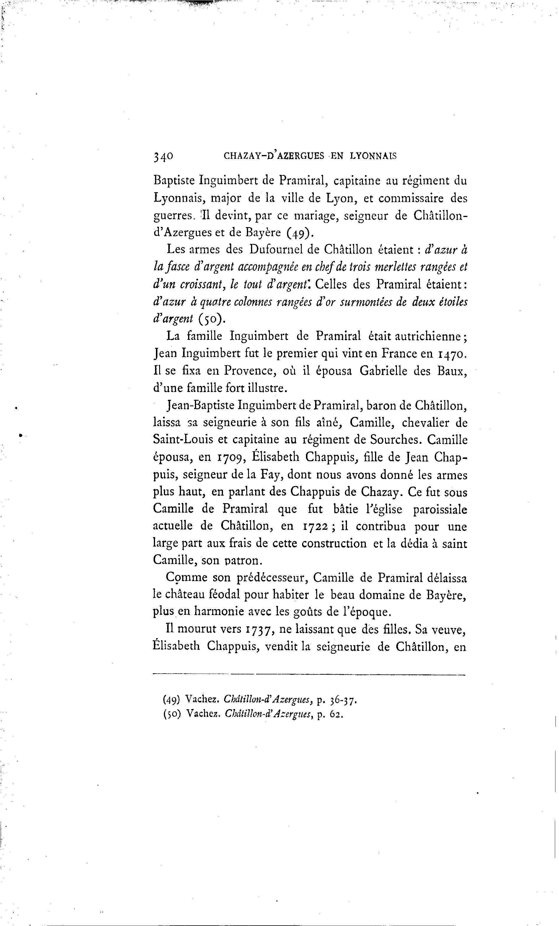 340 CHAZAY-D'AZERGUES EN LYONNAIS Baptiste Inguimbert de Pramiral, capitaine au régiment du Lyonnais, major de la ville de Lyon, et commissaire des guerres. 'Il devint, par ce mariage, seigneur de Châtillon- d'Azergues et de Bayère (49). Les armes des Dufournel de Châtillon étaient : d'azur à lafasce d'argent accompagnée en chef de trois merlettes rangées et d'un croissant, le tout d'argent'. Celles des Pramiral étaient : d'azur à quatre colonnes rangées d'or surmontées de deux étoiles d'argent (50). La famille Inguimbert de Pramiral était autrichienne ; Jean Inguimbert fut le premier qui vint en France en 1470. Il se fixa en Provence, où il épousa Gabrielle des Baux, d'une famille fort illustre. Jean-Baptiste Inguimbert de Pramiral, baron de Châtillon, laissa sa seigneurie à son fils aîné, Camille, chevalier de Saint-Louis et capitaine au régiment de Sourches. Camille épousa, en 1709, Elisabeth Chappuis, fille de Jean Chap- puis, seigneur de la Fay, dont nous avons donné les armes plus haut, en parlant des Chappuis de Chazay. Ce fut sous Camille de Pramiral que fut bâtie l'église paroissiale actuelle de Châtillon, en 1722 ; il contribua pour une large part aux frais de cette construction et la dédia à saint Camille, son patron. Comme son prédécesseur, Camille de Pramiral délaissa le château féodal pour habiter le beau domaine de Bayère, plus en harmonie avec les goûts de l'époque. Il mourut vers 1737, ne laissant que des filles. Sa veuve, Elisabeth Chappuis, vendit la seigneurie de Châtillon, en (49) Vachez. Chdtillon-d'Azergues, p. 36-37. (50) Vachez. Chdlilhn-à 'Azergues, p. 62.